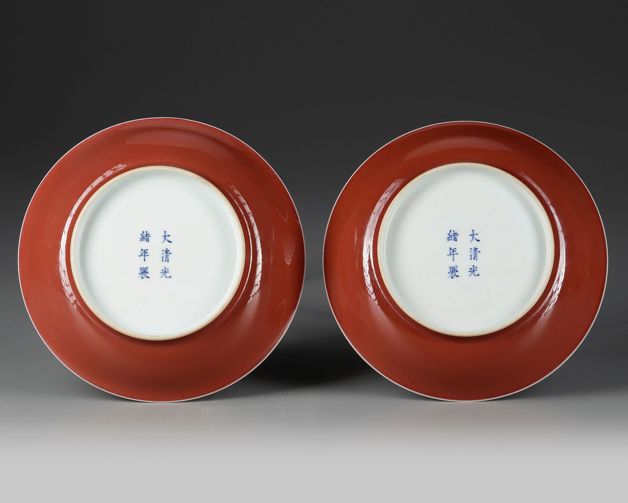 A pair of Chinese porcelain dishes, rounded sides rising from a wedge-shaped foot to the slightly everted rim, and the exterior is covered with a variegated red glaze thinning to white at the rim and foot. The bottom with a Chinese Guangxu six character mark.