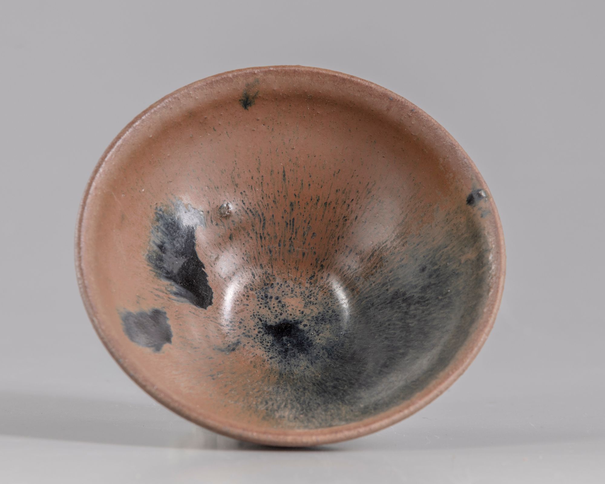 The bowl is decorated with a dark, lustrous glaze with brown russet streaks trailing to the centre imitating the fur of a hare.