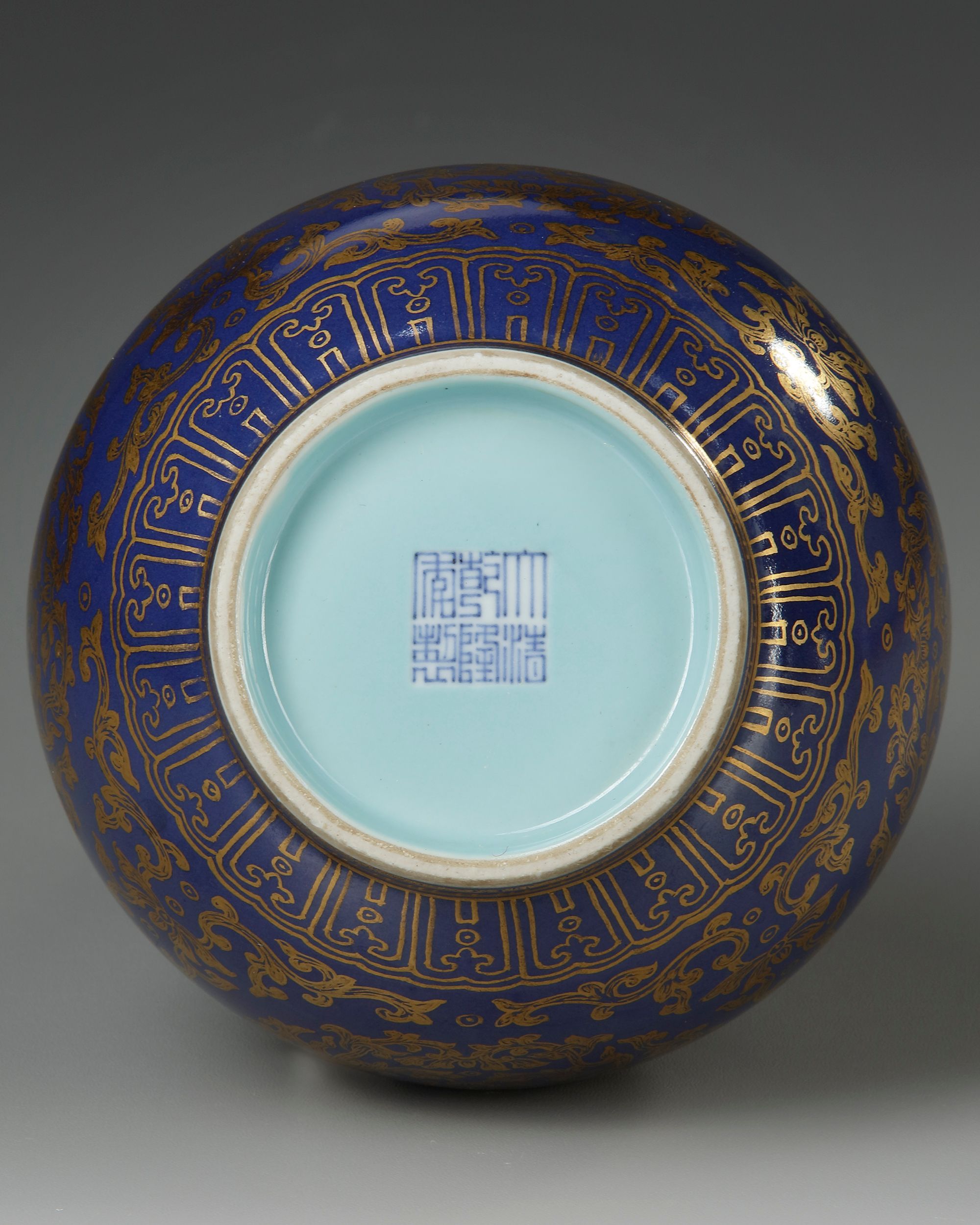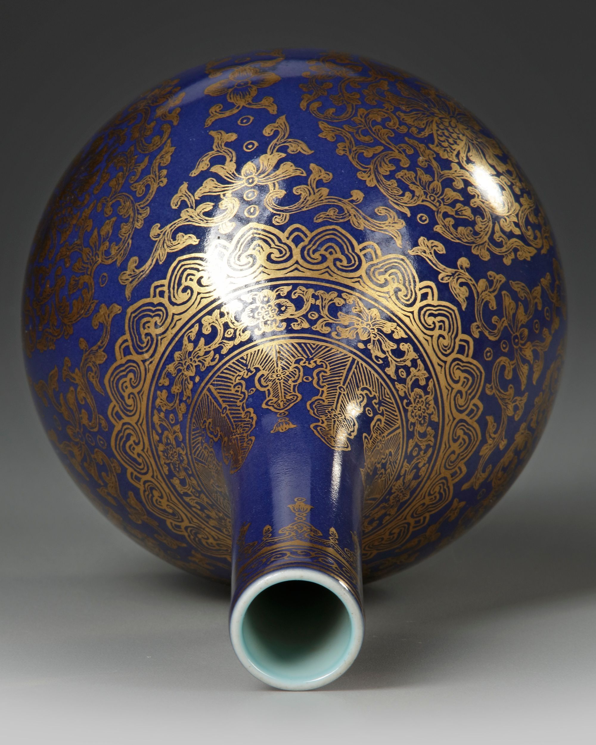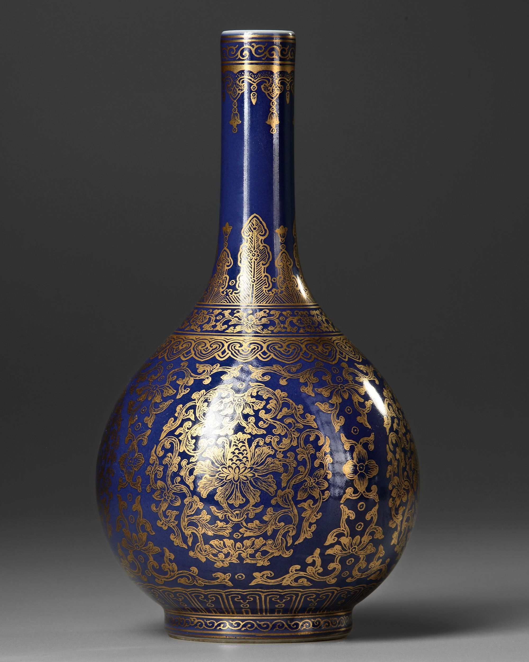 A Chinese porcelain bottle vase, gilt with four large stylised lotus blossoms amongst dense scrolling leafy tendrils, set between a border of ruyi heads and a petal lappet border, the neck with a band of stiff leaves above a classic flower scroll, All on a powder blue ground. The bottom with a Chinese Qianlong seal mark on a turquoise glazed ground.