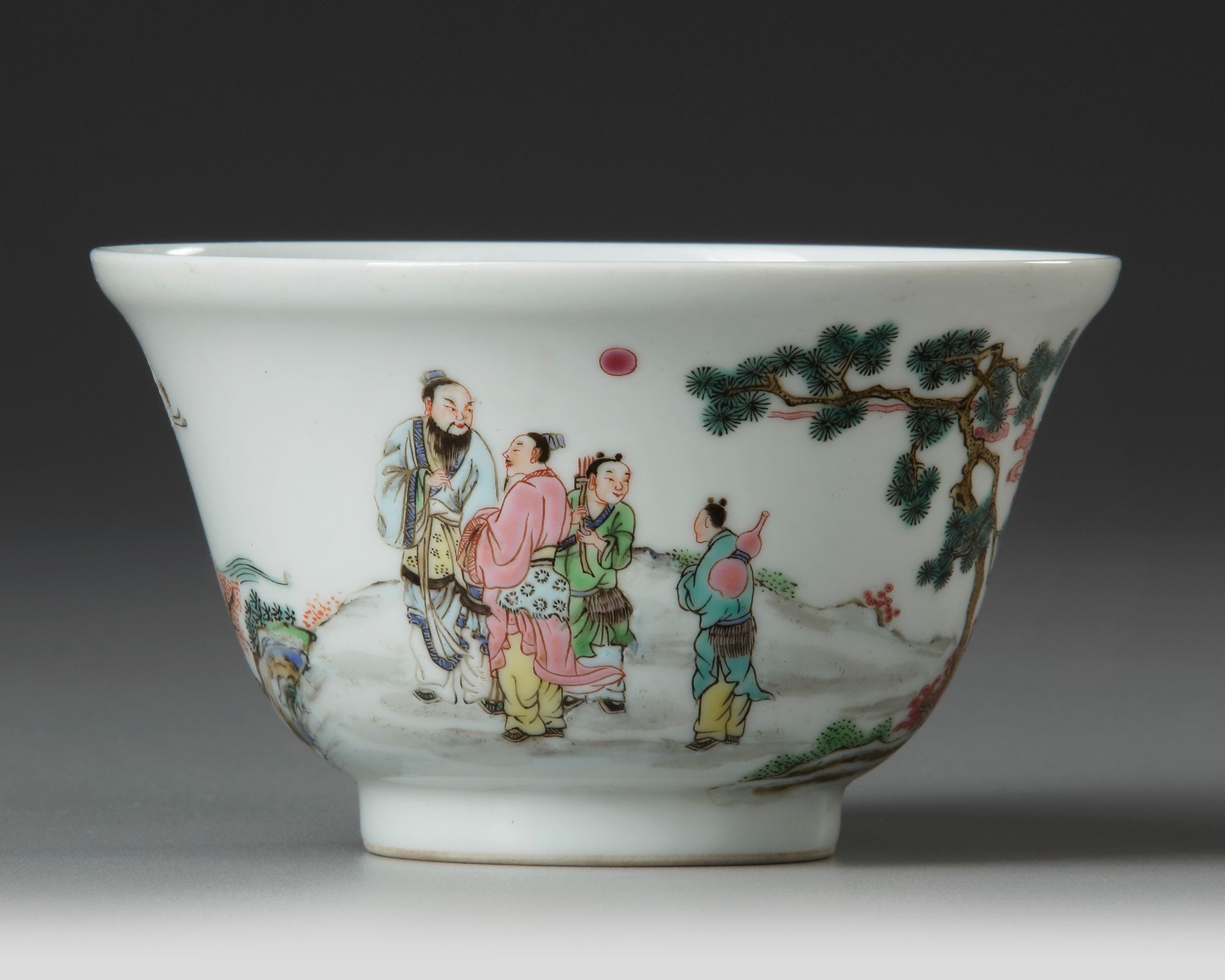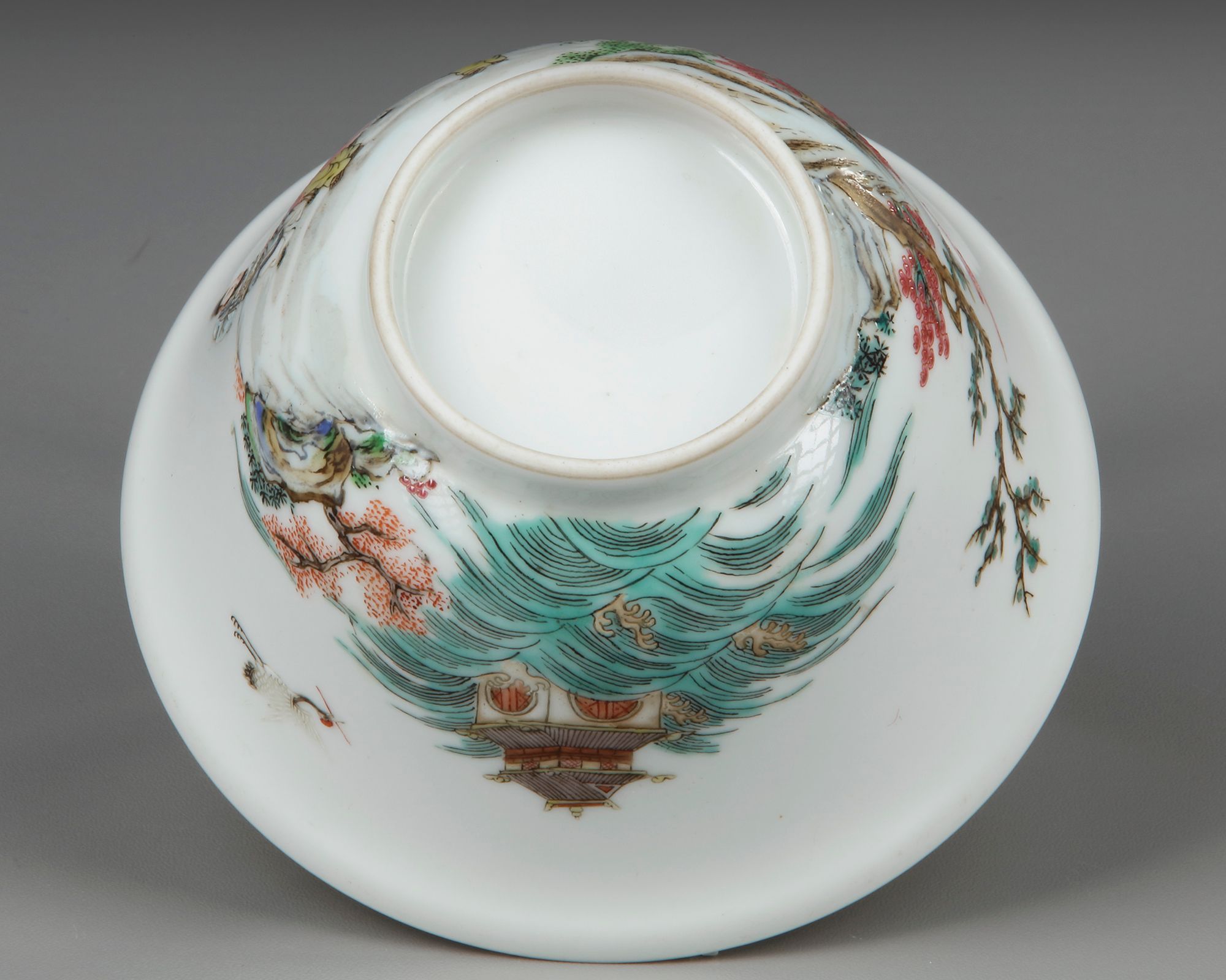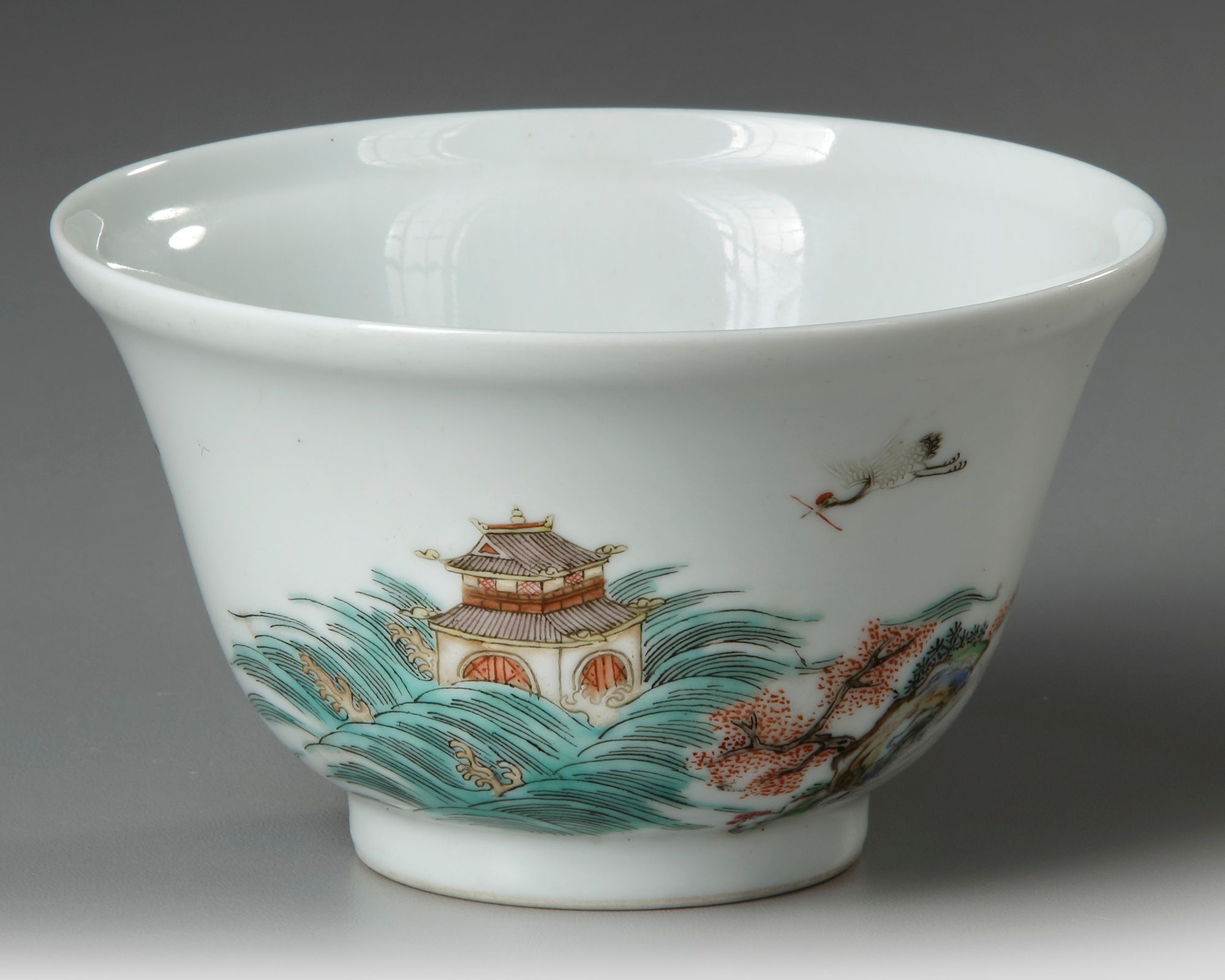 A Chinese porcelain bowl resting on a small foot, decorated in famille rose enamels with scholars under a pine tree in a landscape, with a crane flying over a house amidst crushing sea waves.
