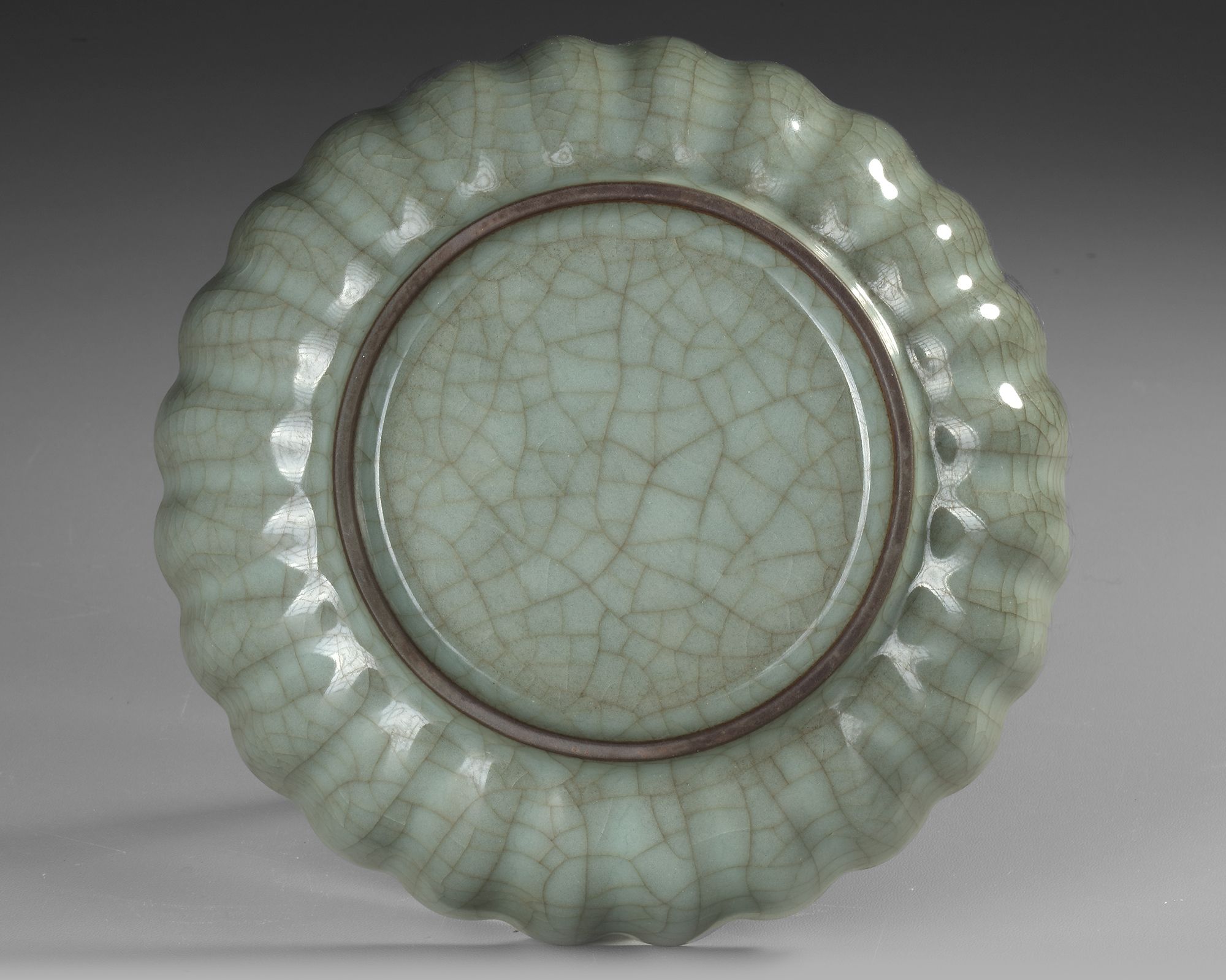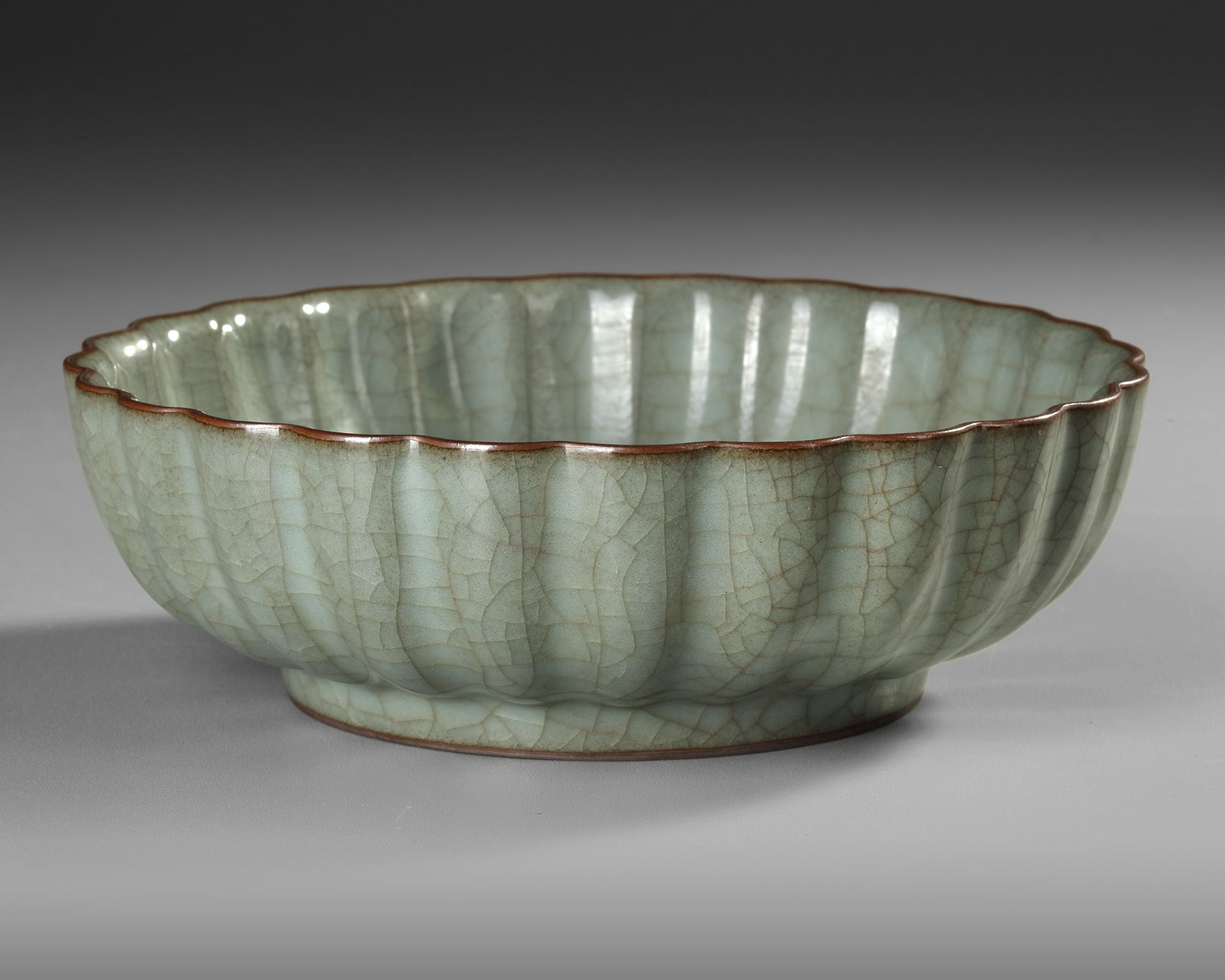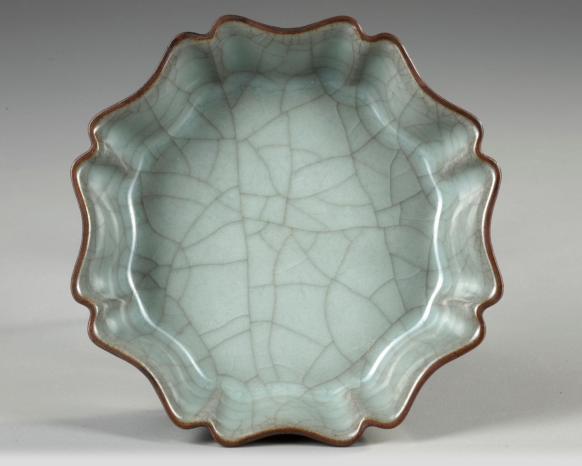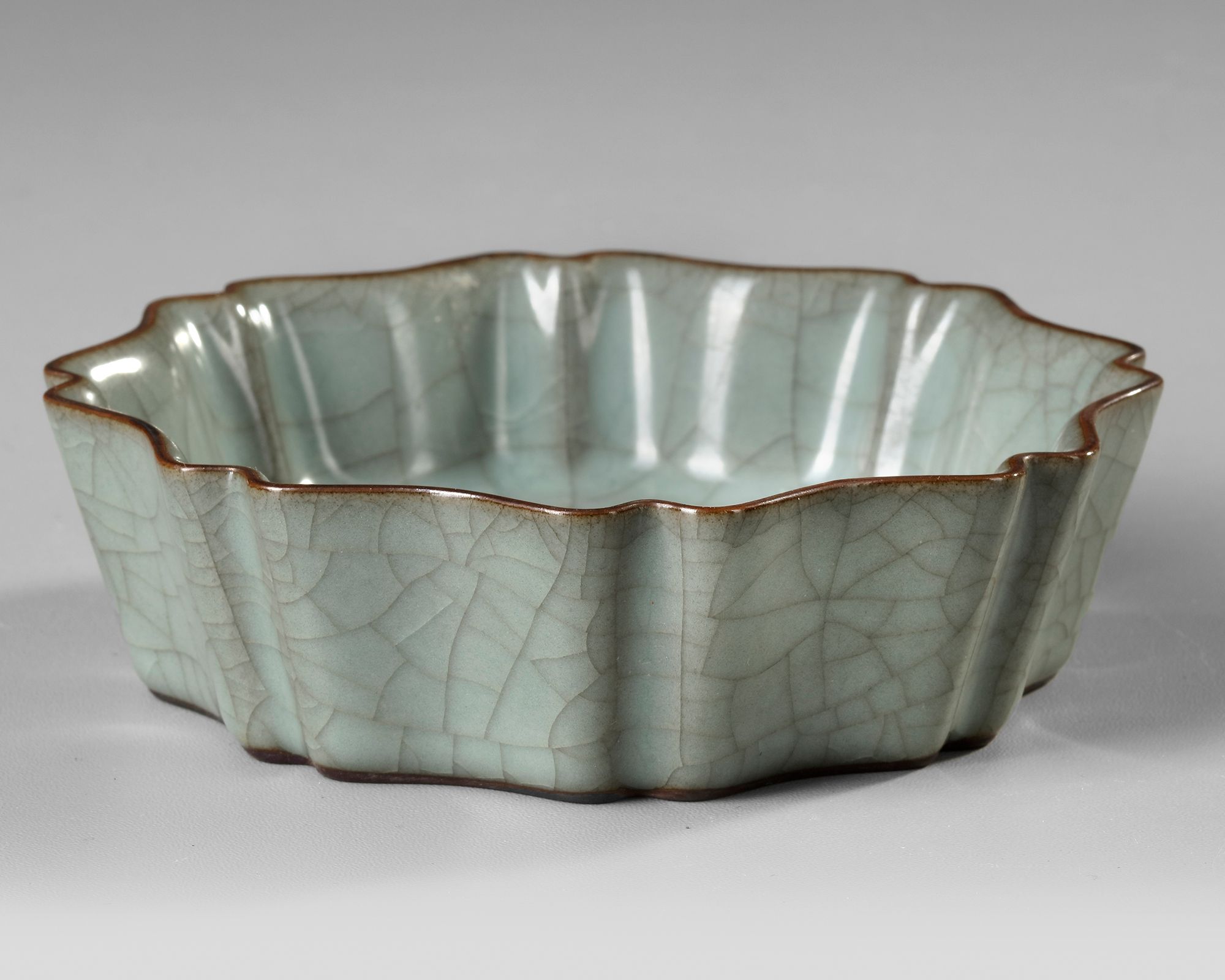 The brush washer is potted with eight lobes, each in the shape of a mallow petal, flaring from a slightly recessed base, covered overall with a thick pale bluish glaze suffused with a dense network of russet crackles thinning on the mouth rim.