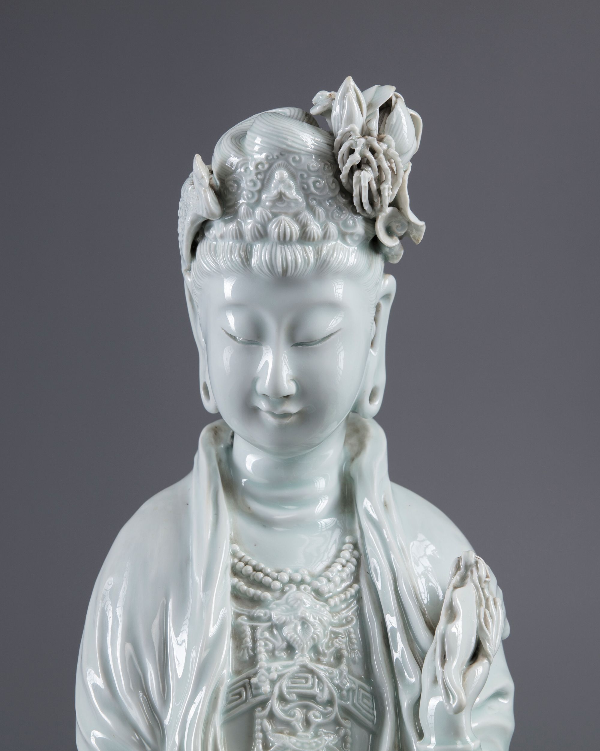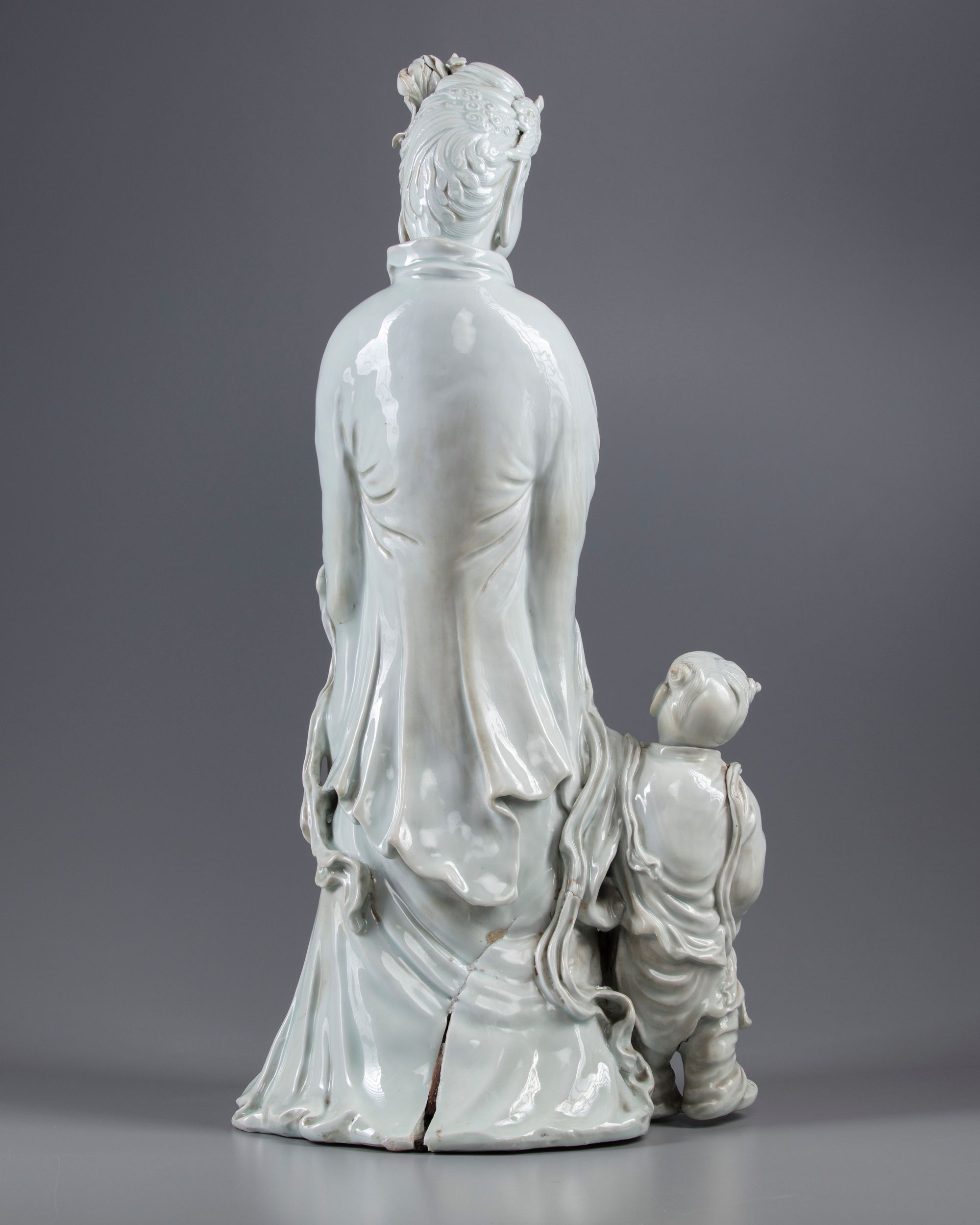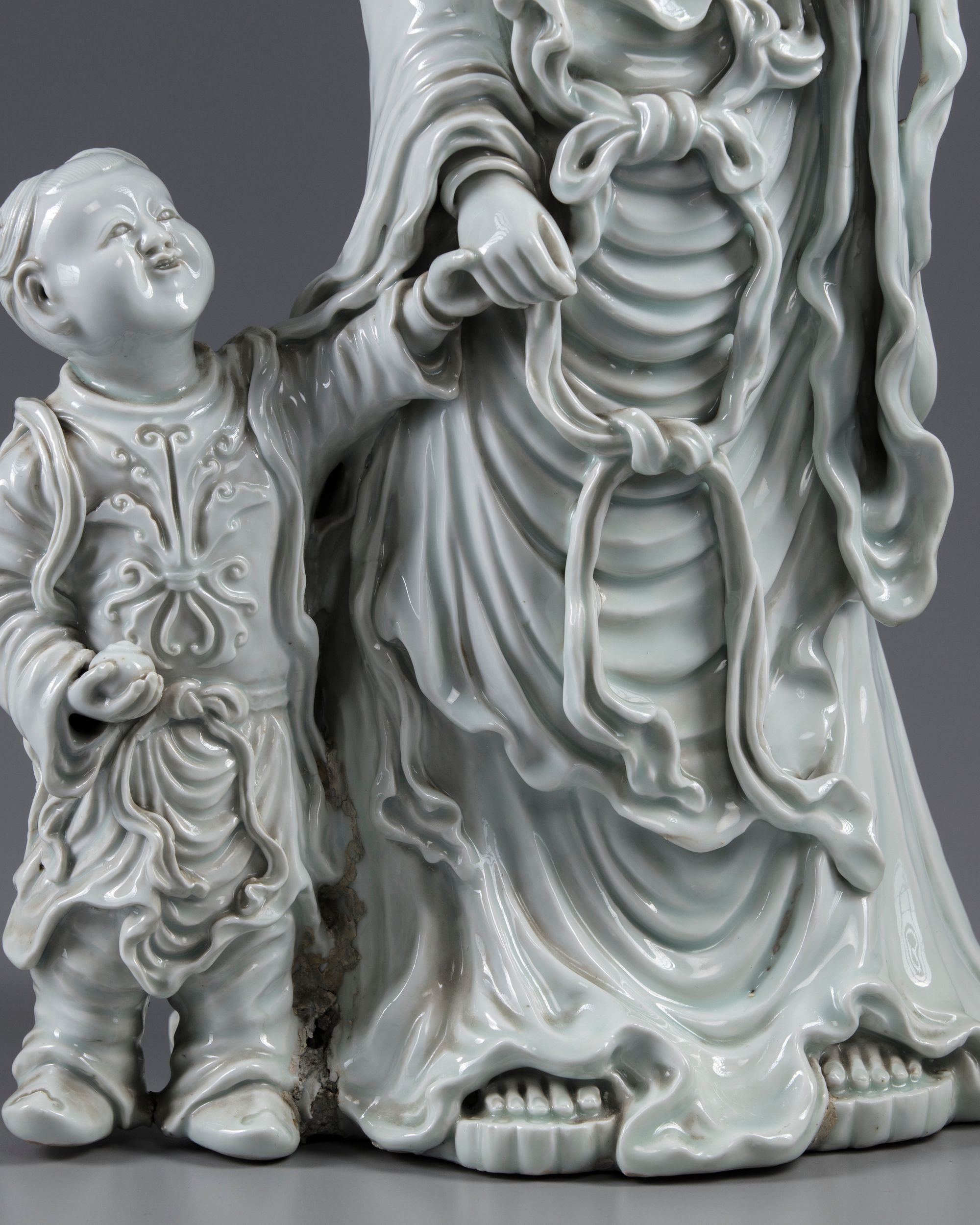 An exceptional large Dehua glazed figure Guanyin holding hands with a boy. The guanyin beautifully decorated with jewellery and wearing a nicely detailed dress.