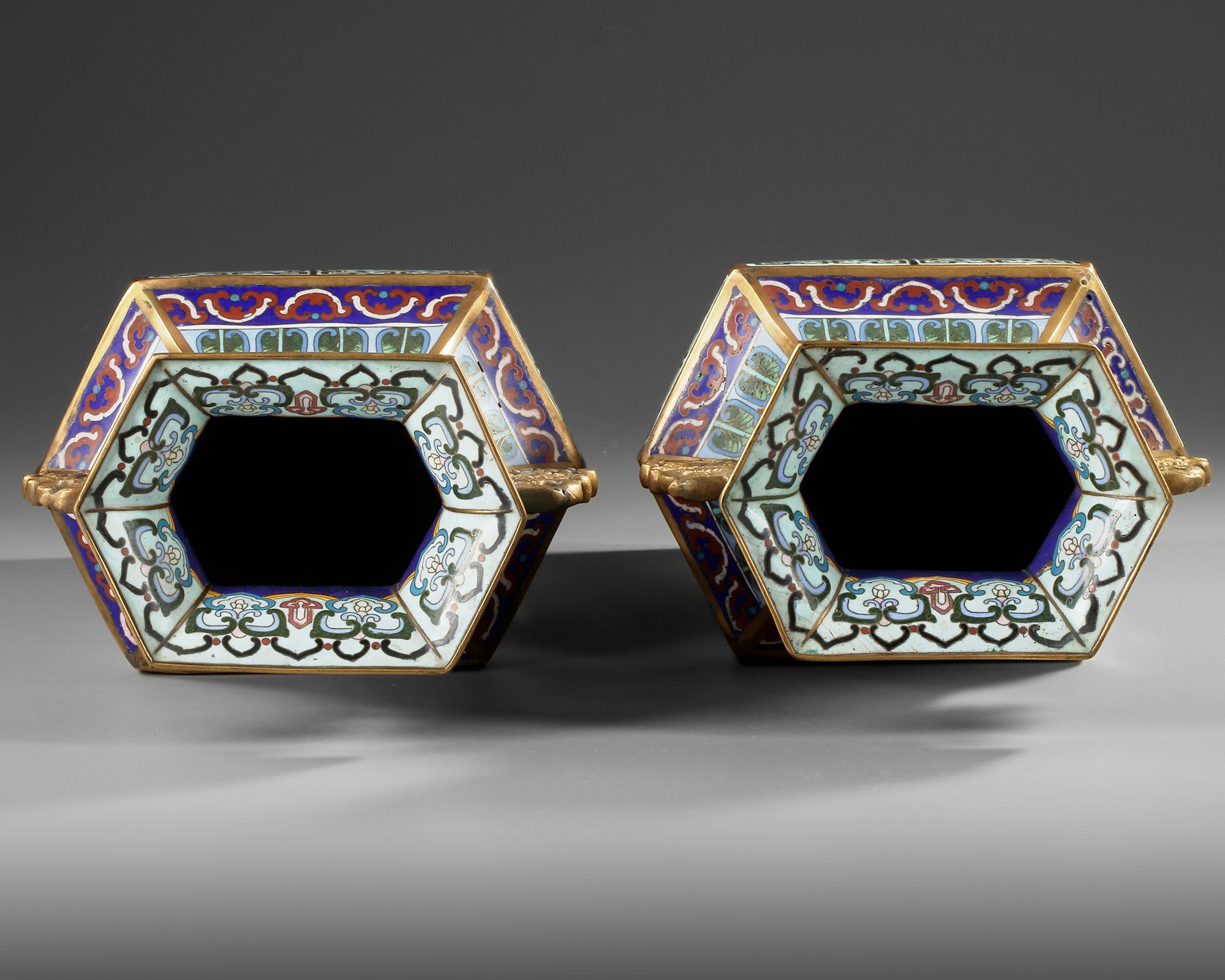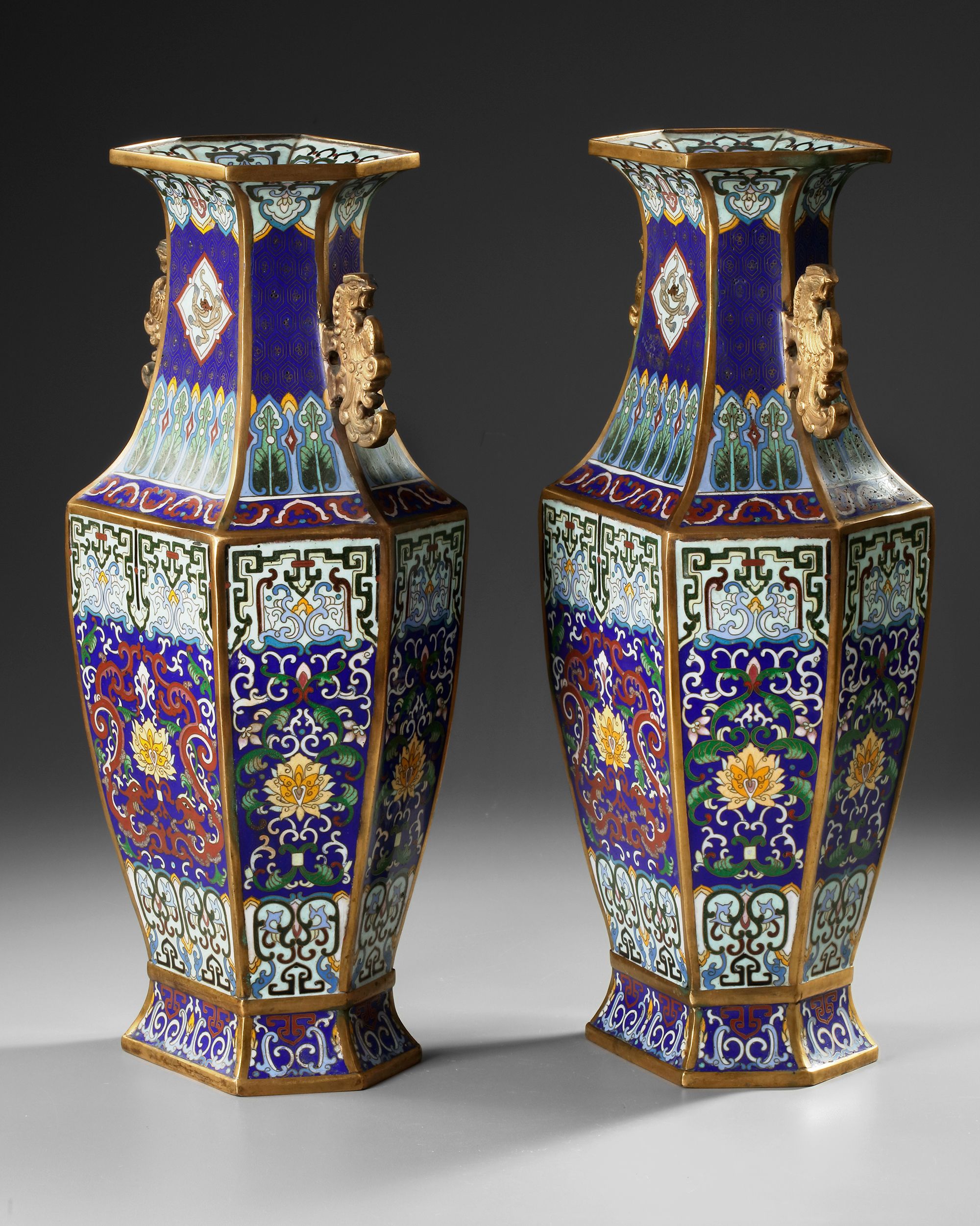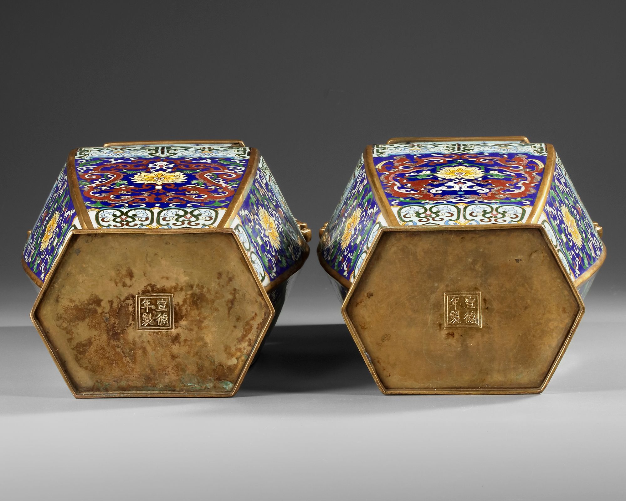 A pair of chinese cloisonne vases, each stylized with a pair of phoenix shaped handles, decorated around the body to each side with a large lotus blossoming flower surrounded by scrolls. The neck with a panel enclosing a leaping Chilong, set between a band of ruyi heads to the rim and a petal lappet border to the shoulder. The bottom with a Chinese four character Xuande mark.