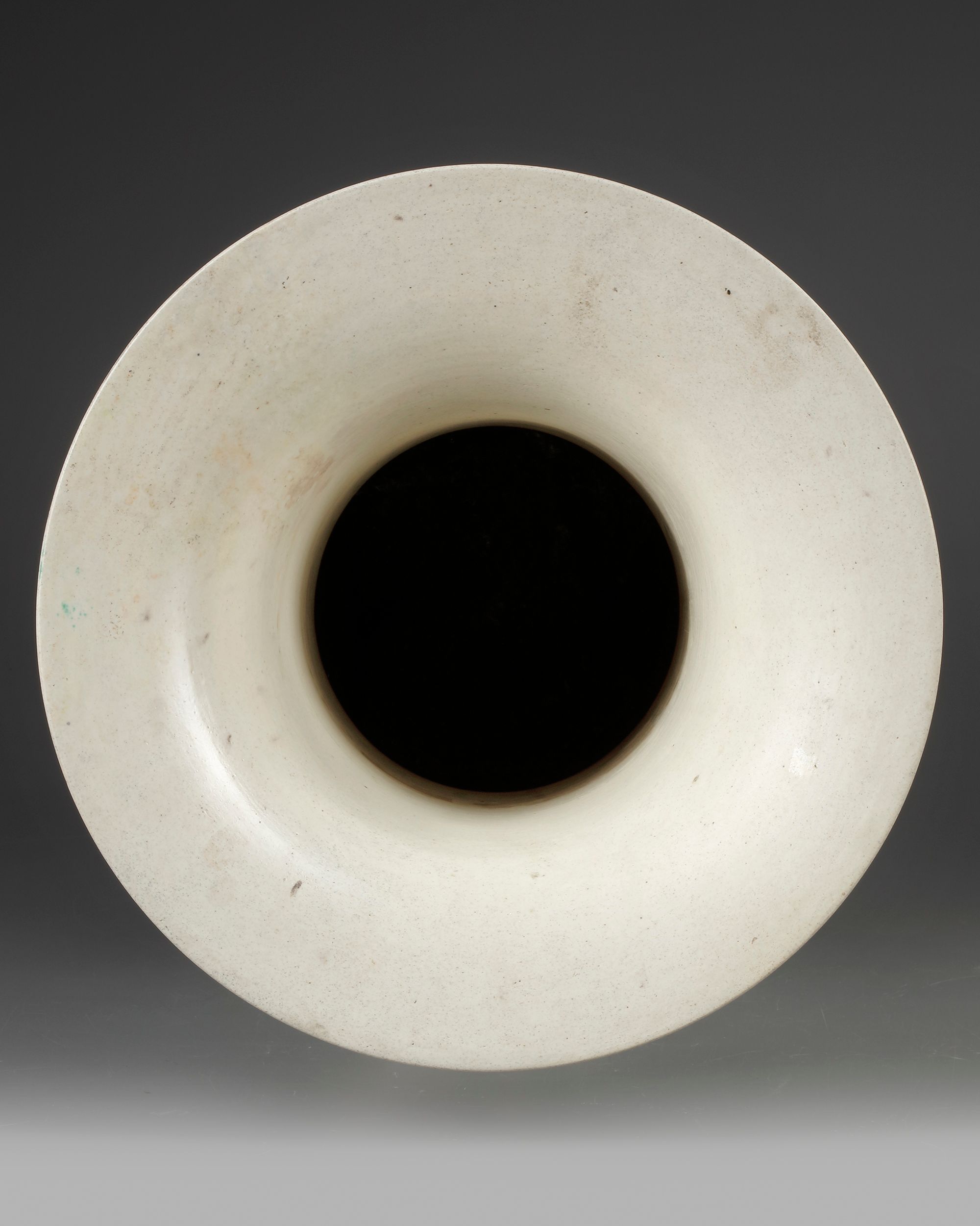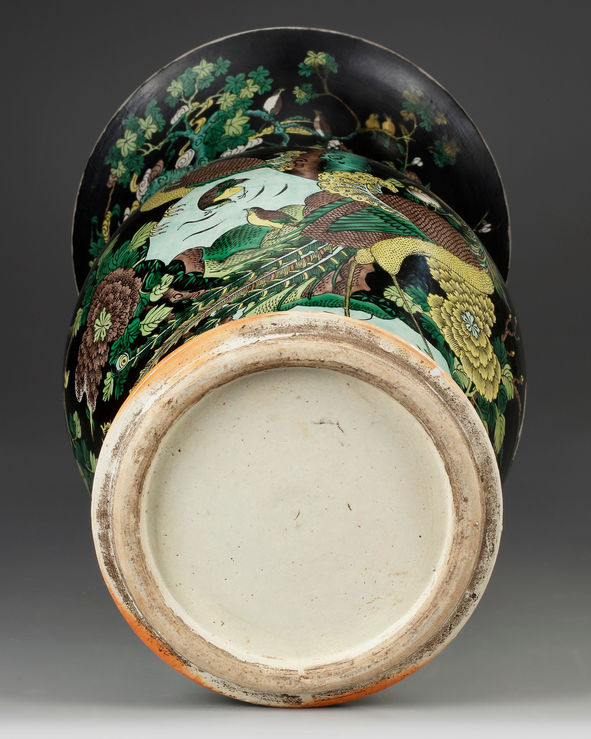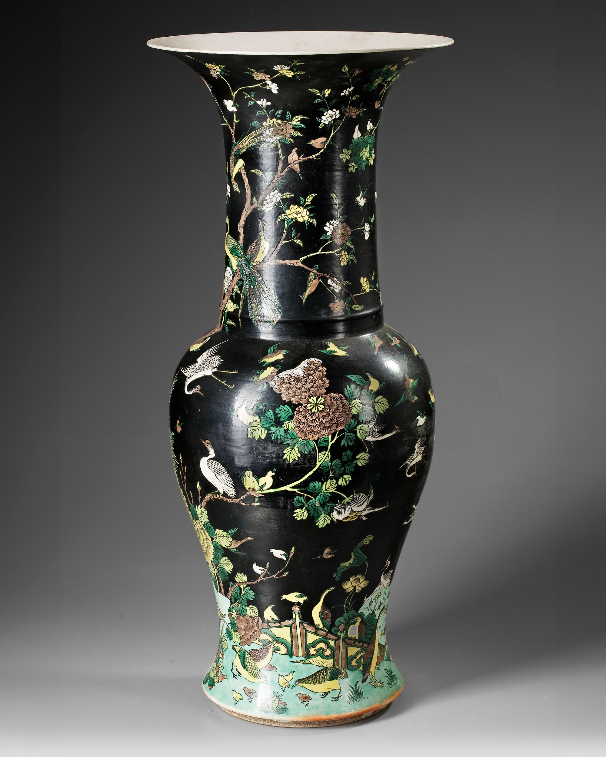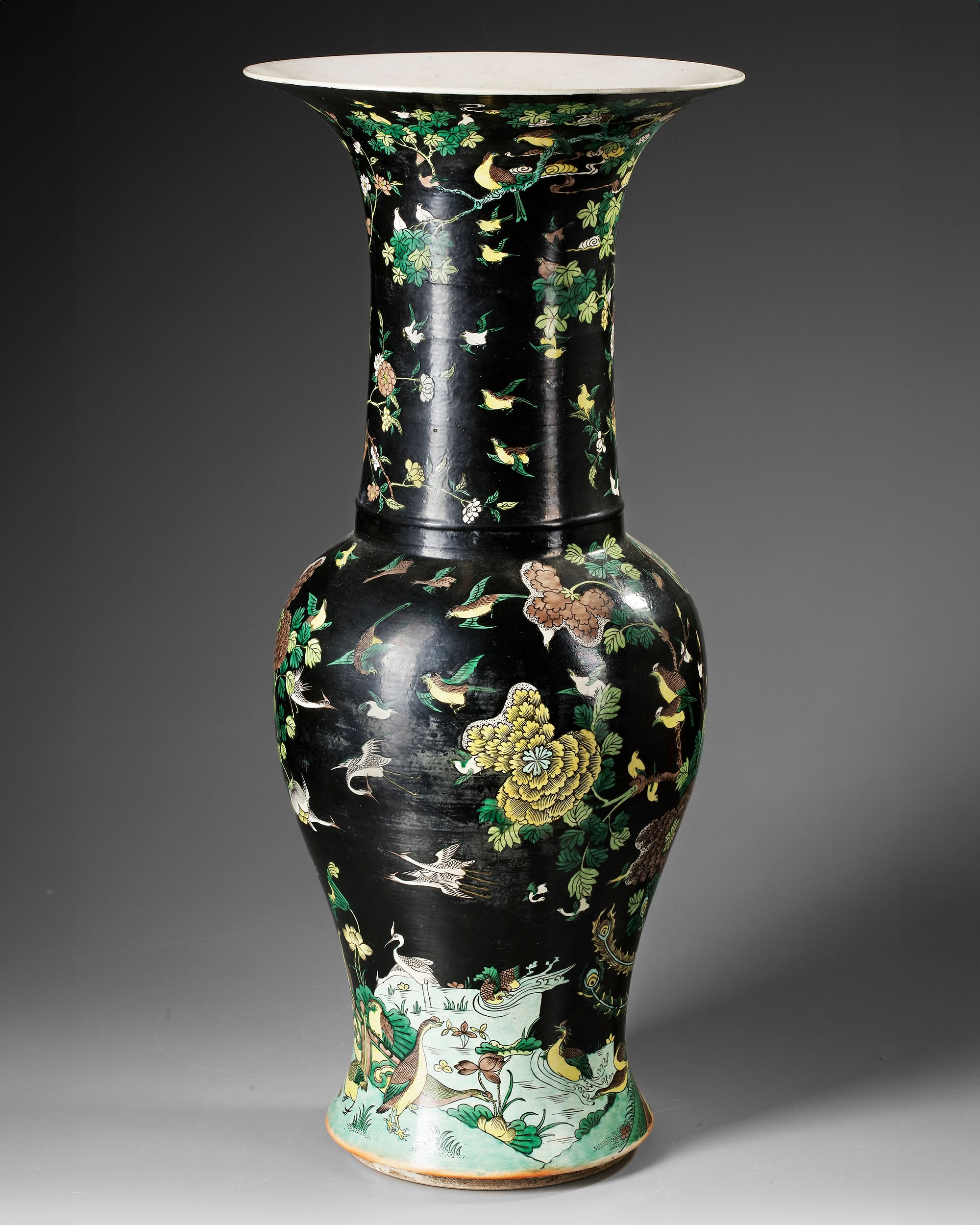 A Large Chinese porcelain vase, decorated in famille noir enamels with two large colourful phoenix birds looking at each other perched on ornamental rocks, under a blossoming tree with other birds perched upon, amidst cranes, ducks and other birds in a lake scene.