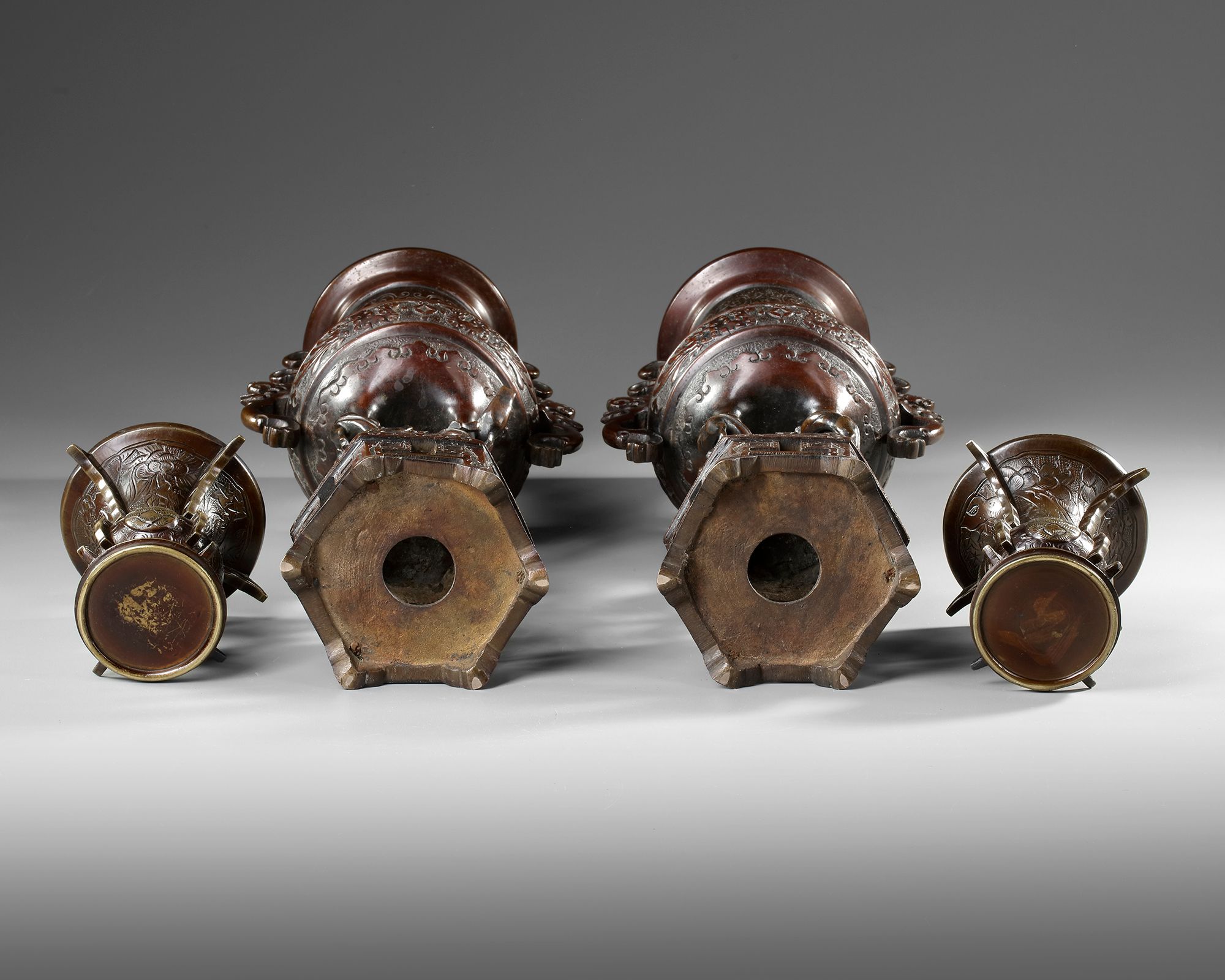 A pair of Chinese bronze Gu vases, each cast with four sets of flanges, engraved with birds amidst flowers, Height: 12.5 cm.
