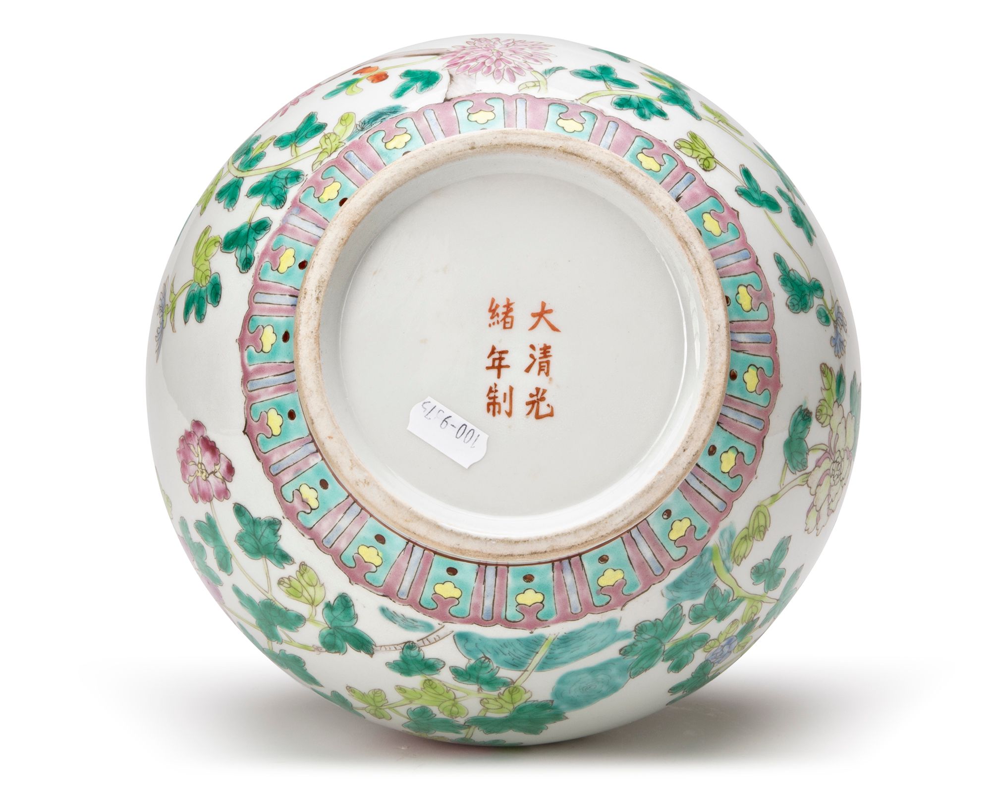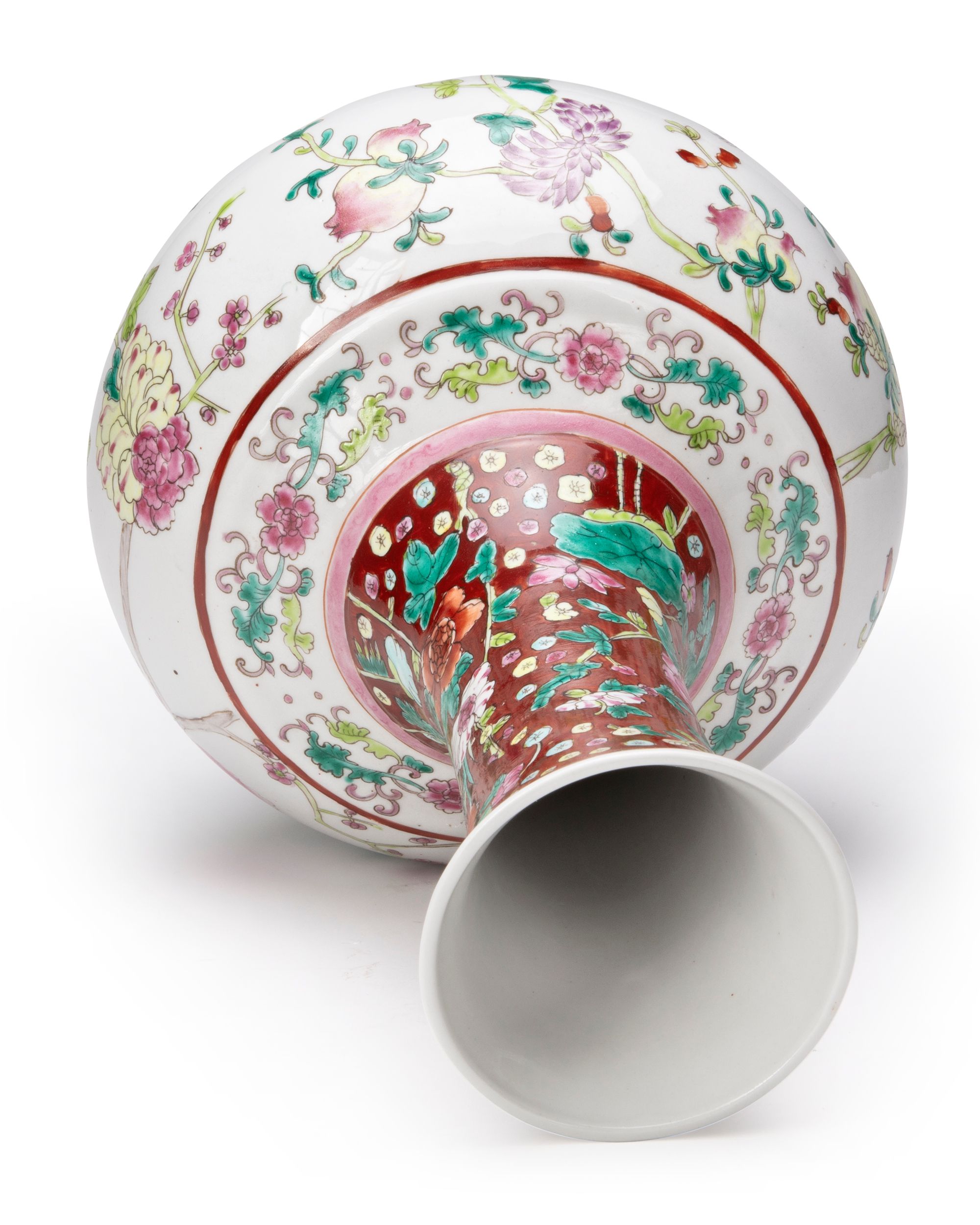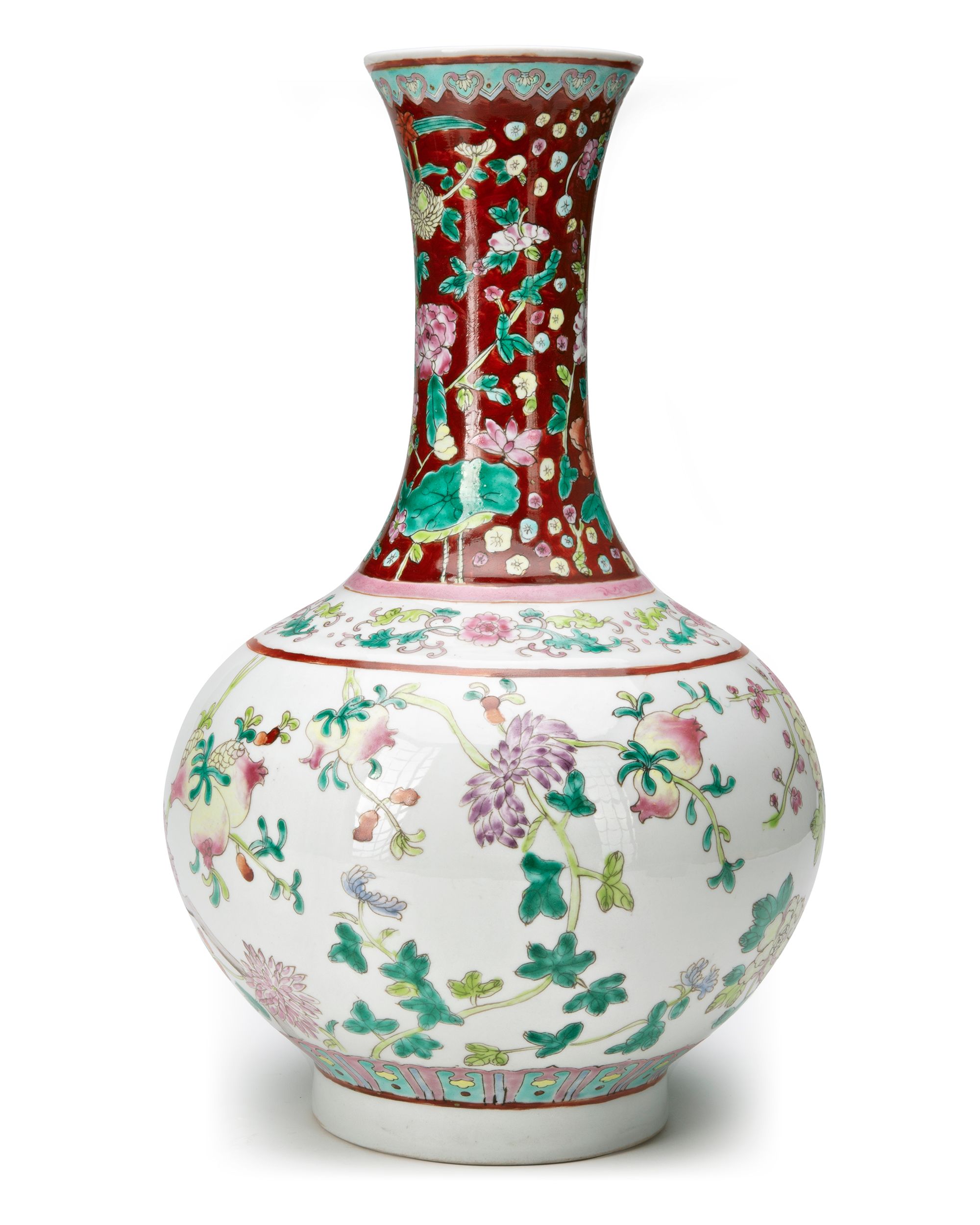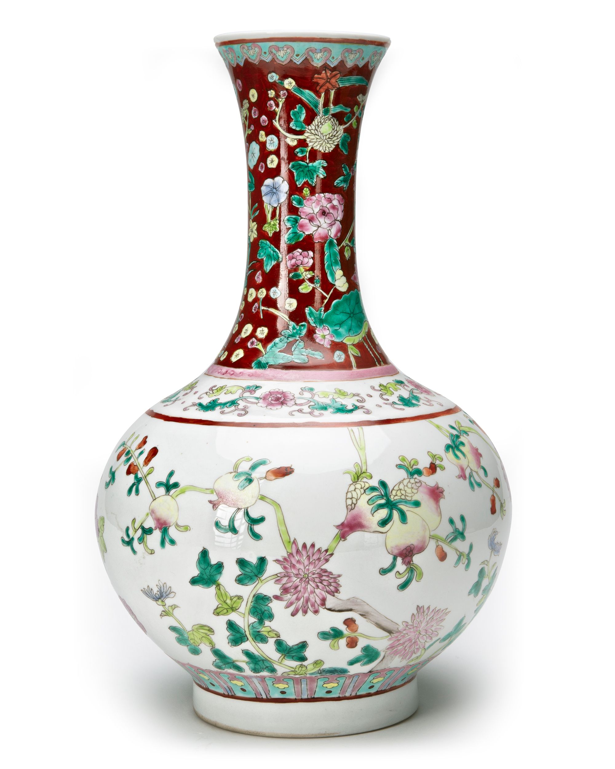 A Chinese porcelain bottle vase, decorated in famille rose enamels with pomegranate and peony blossoming branches, classic flower scrolls around the shoulder, the neck with lotus, lilies, peony and chrysanthemum flower heads under a band of ruyi heads on a deep red ground. The bottom with a Chinese Guangxu six character mark.