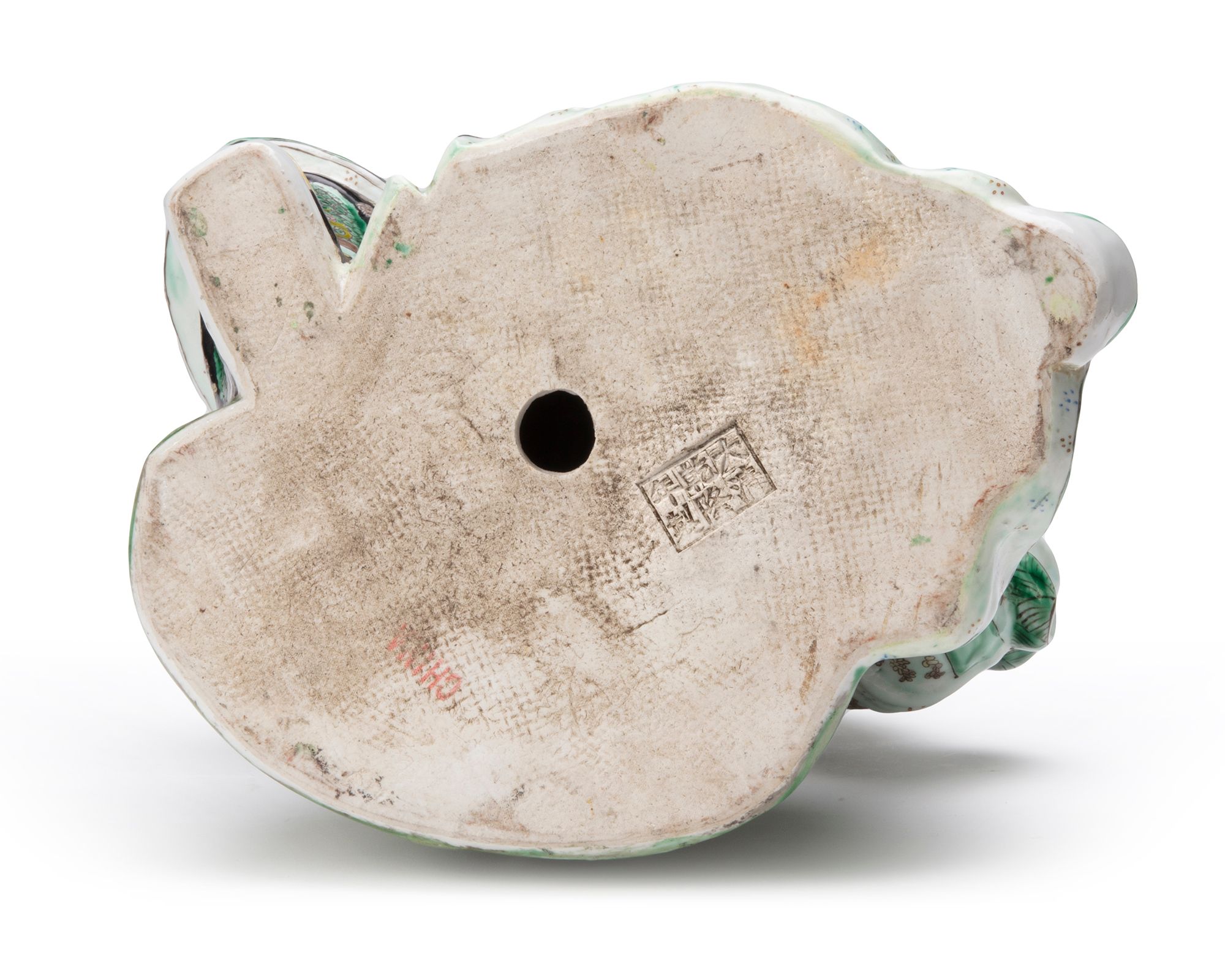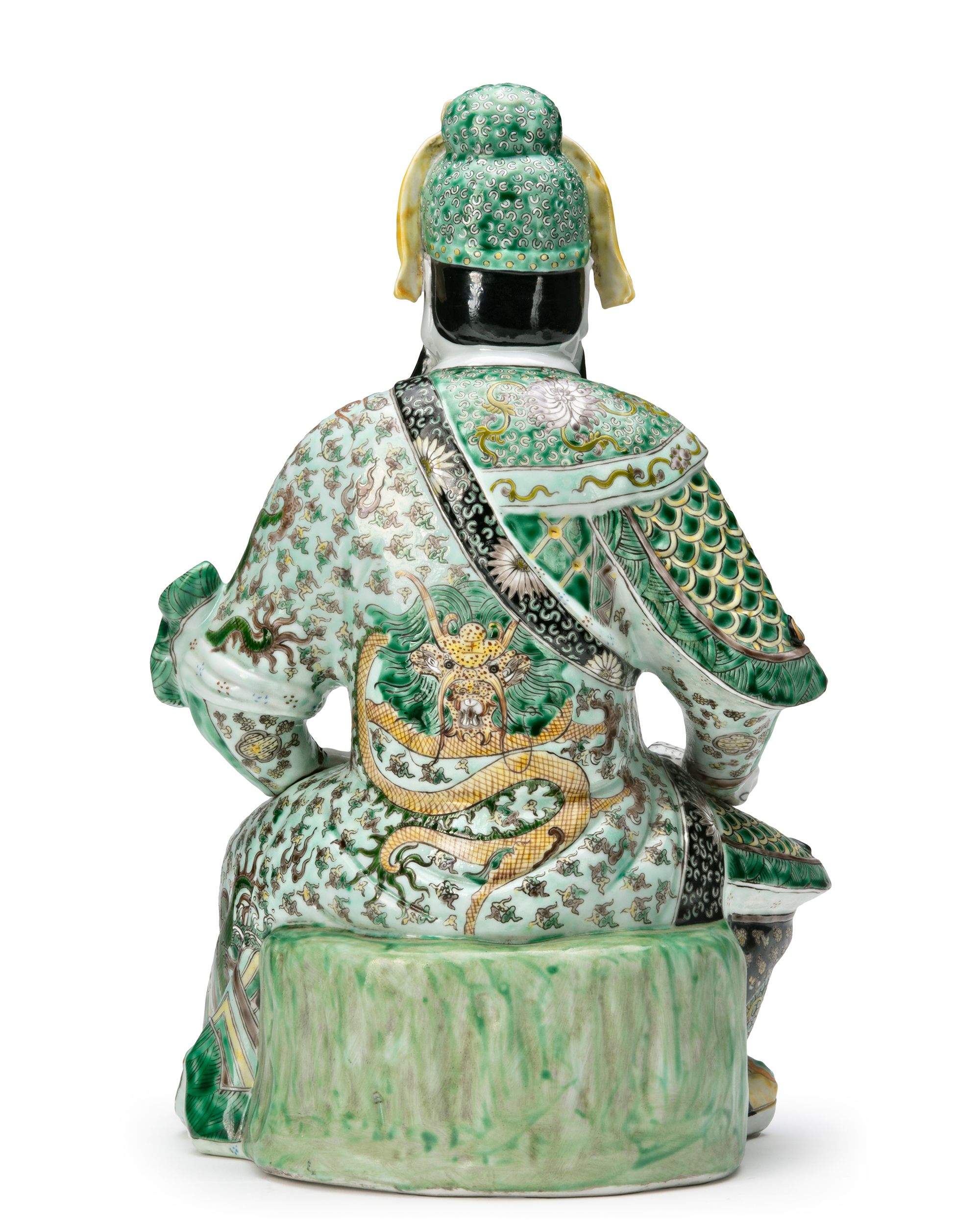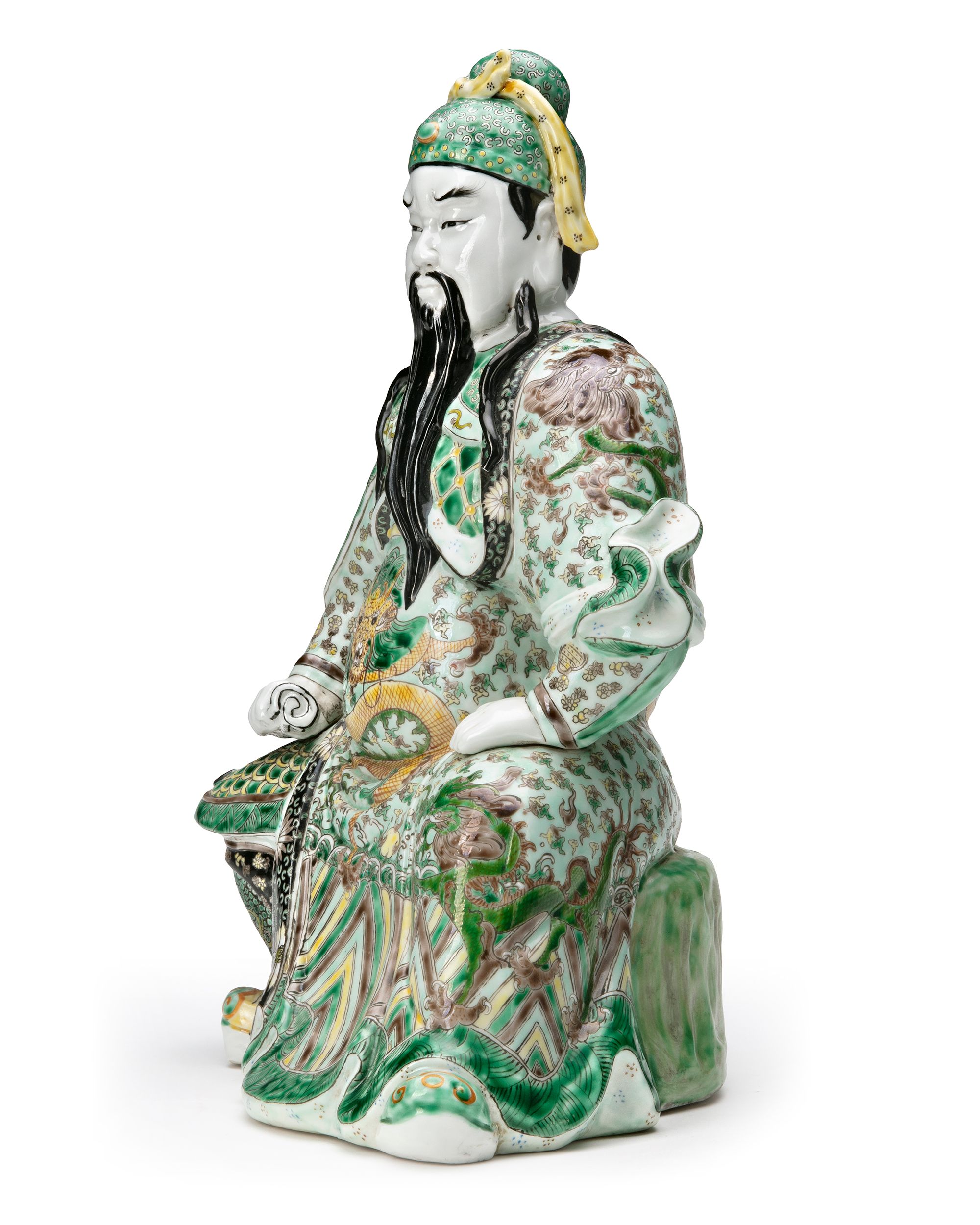 A Chinese porcelain figure of a Guandi, seated on a throne, wearing a long robe and holding a scroll in his right hand, his fierce face framed by a long beard and tall cap, his robe brightly glazed in yellow, green and aubergine, decorated around his belly with a facing yellow dragon. The bottom stamped with a Chinese Qianlong six character mark.