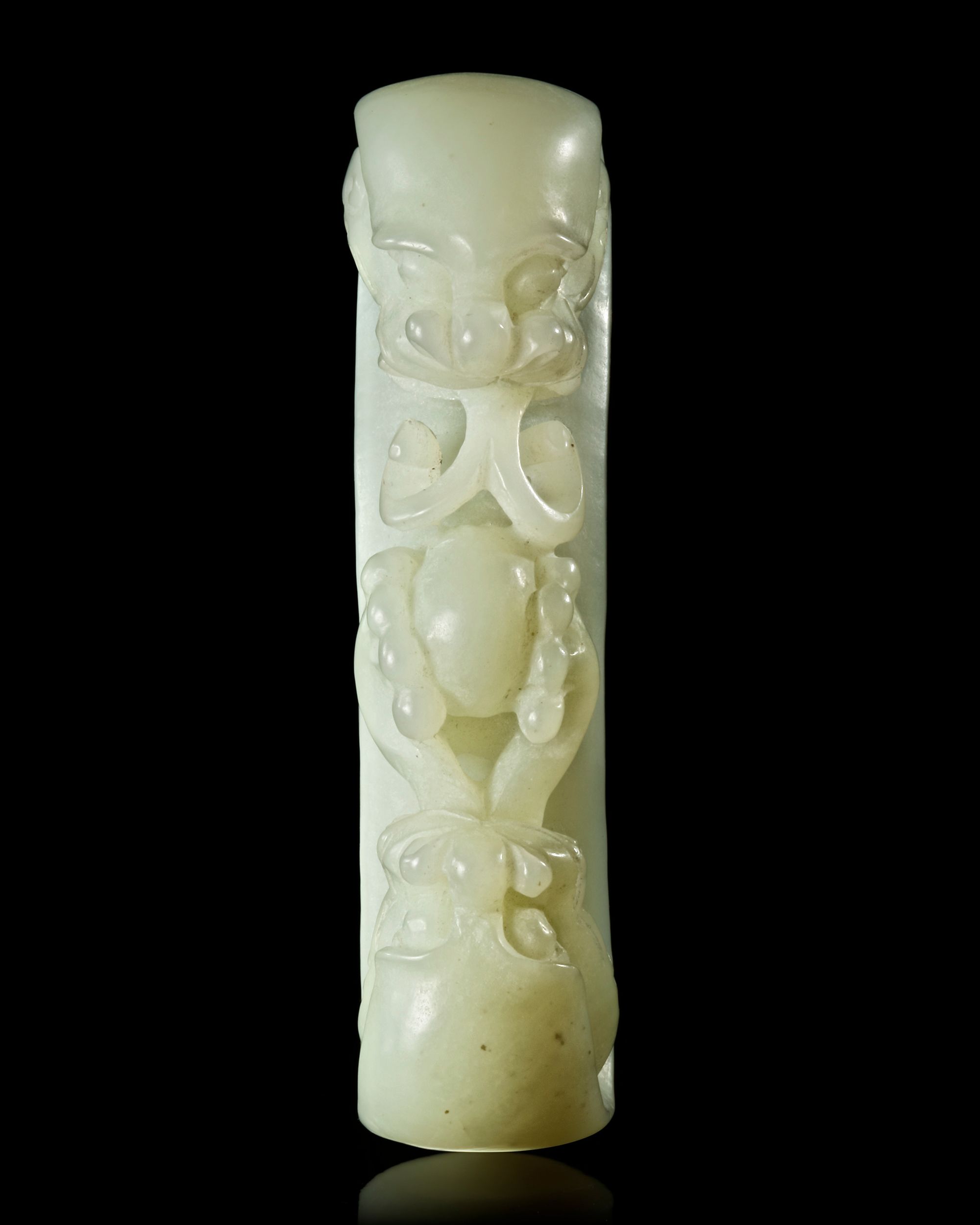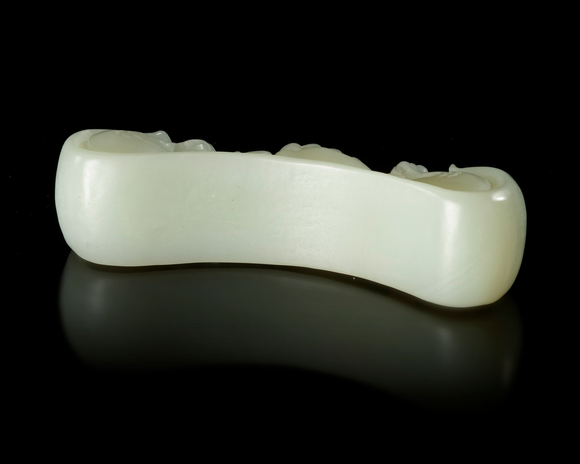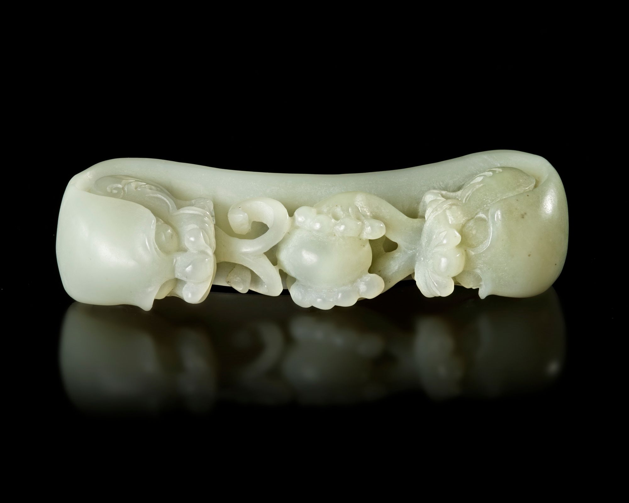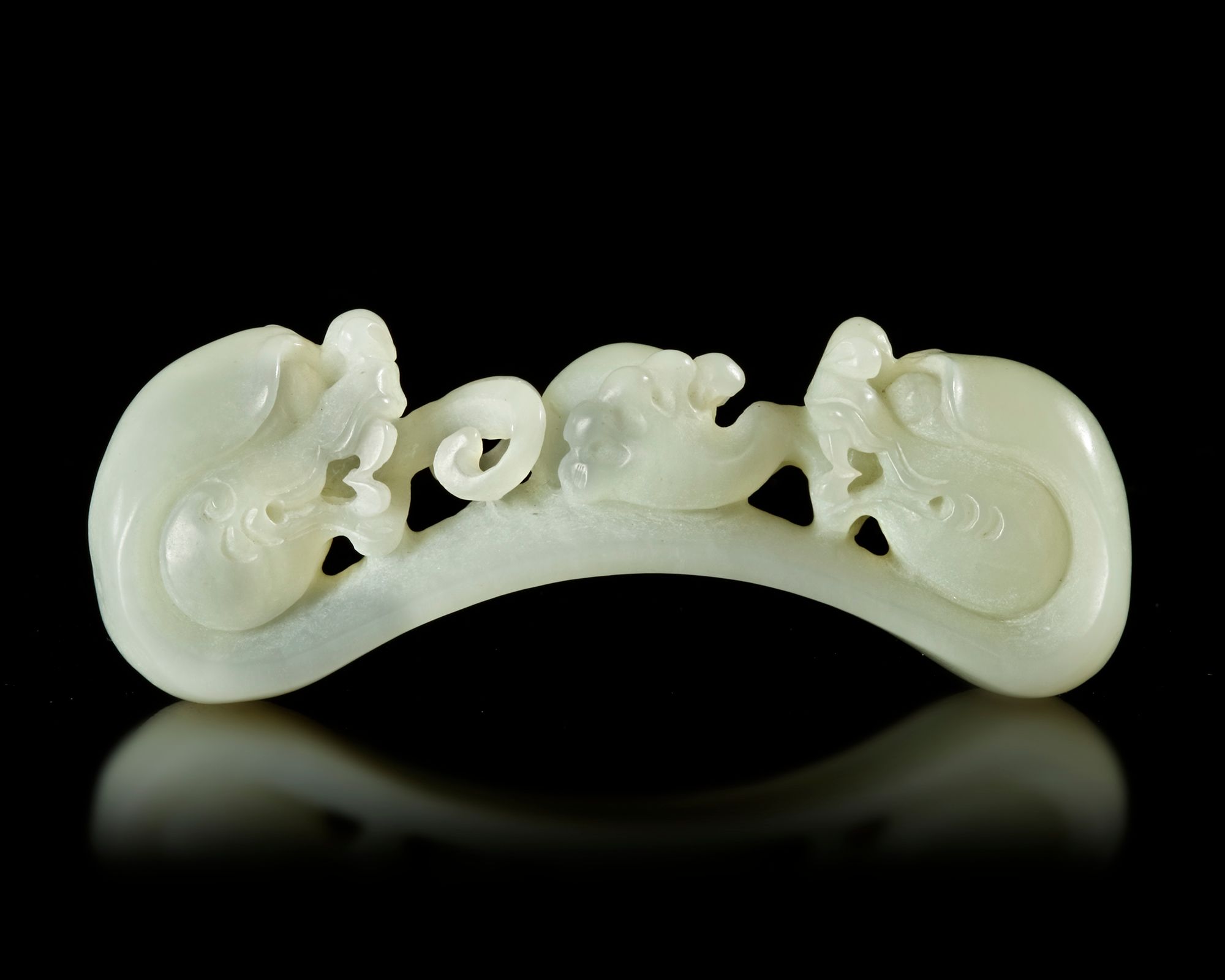 The belt hook is finely carved to the top with two detailed dragon facing heads reaching with their tongs a pearl, the polished stone of even pale celadon tone.