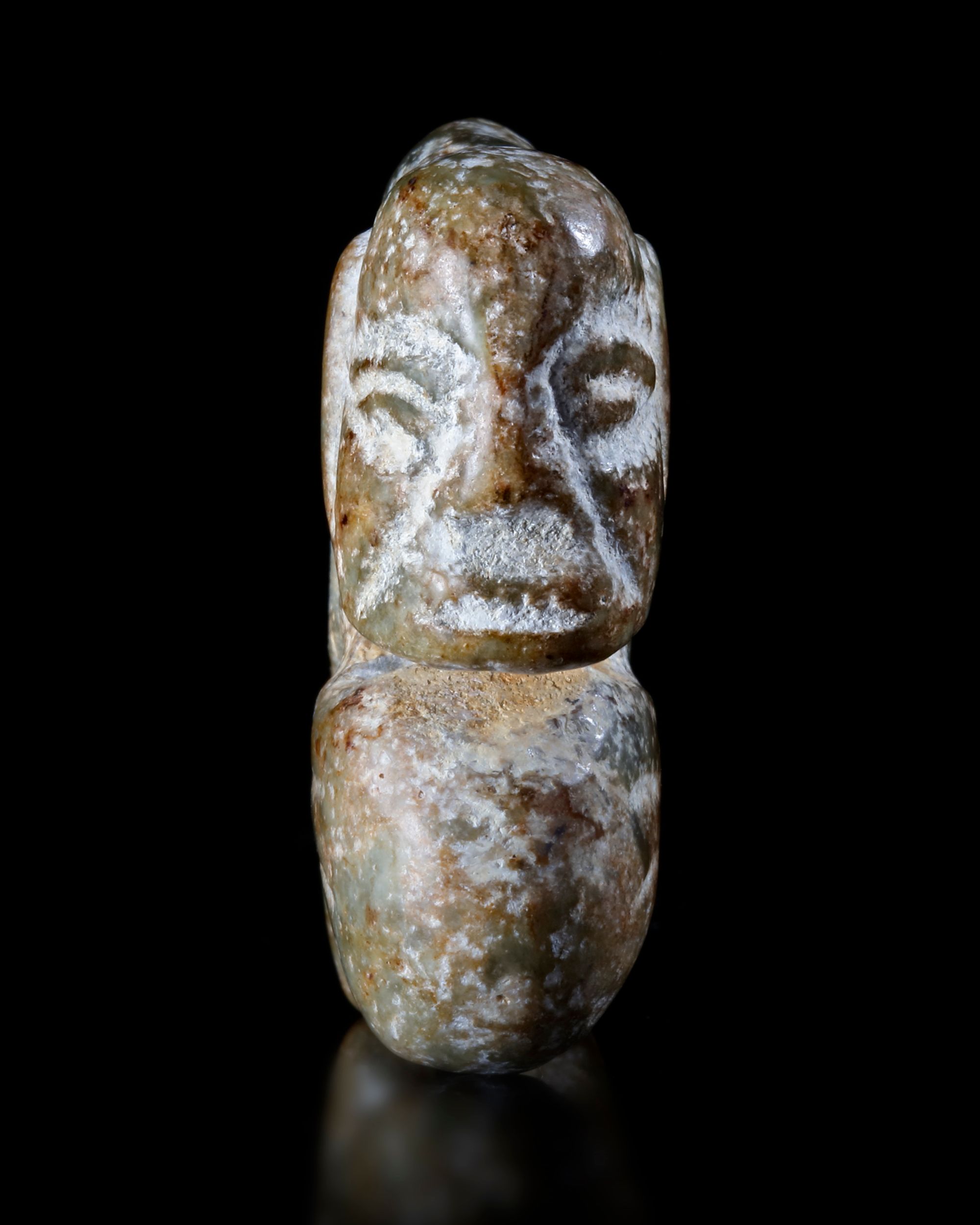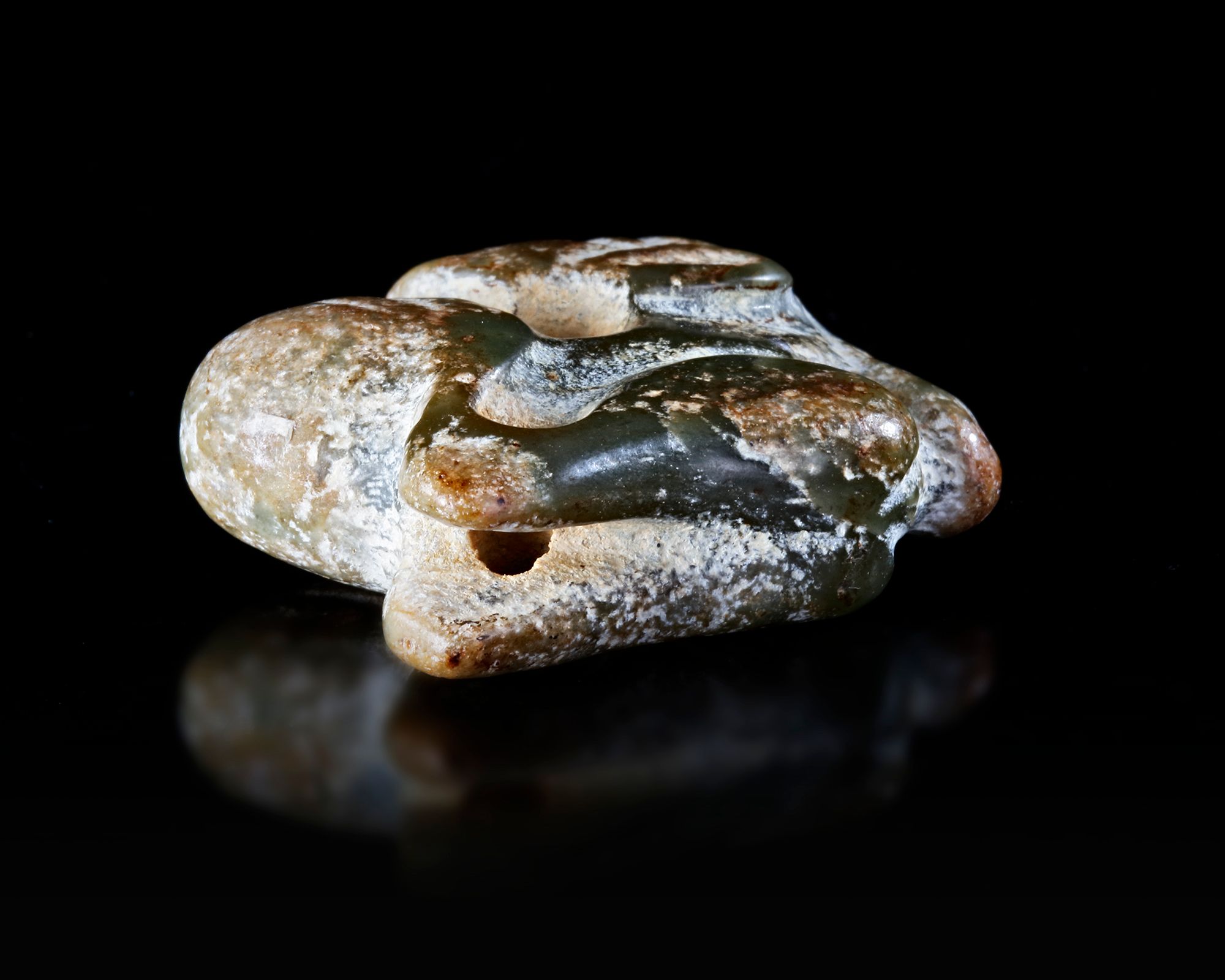 The stone of deep spinach tone with russet inclusions. 4 by 4.3 cm