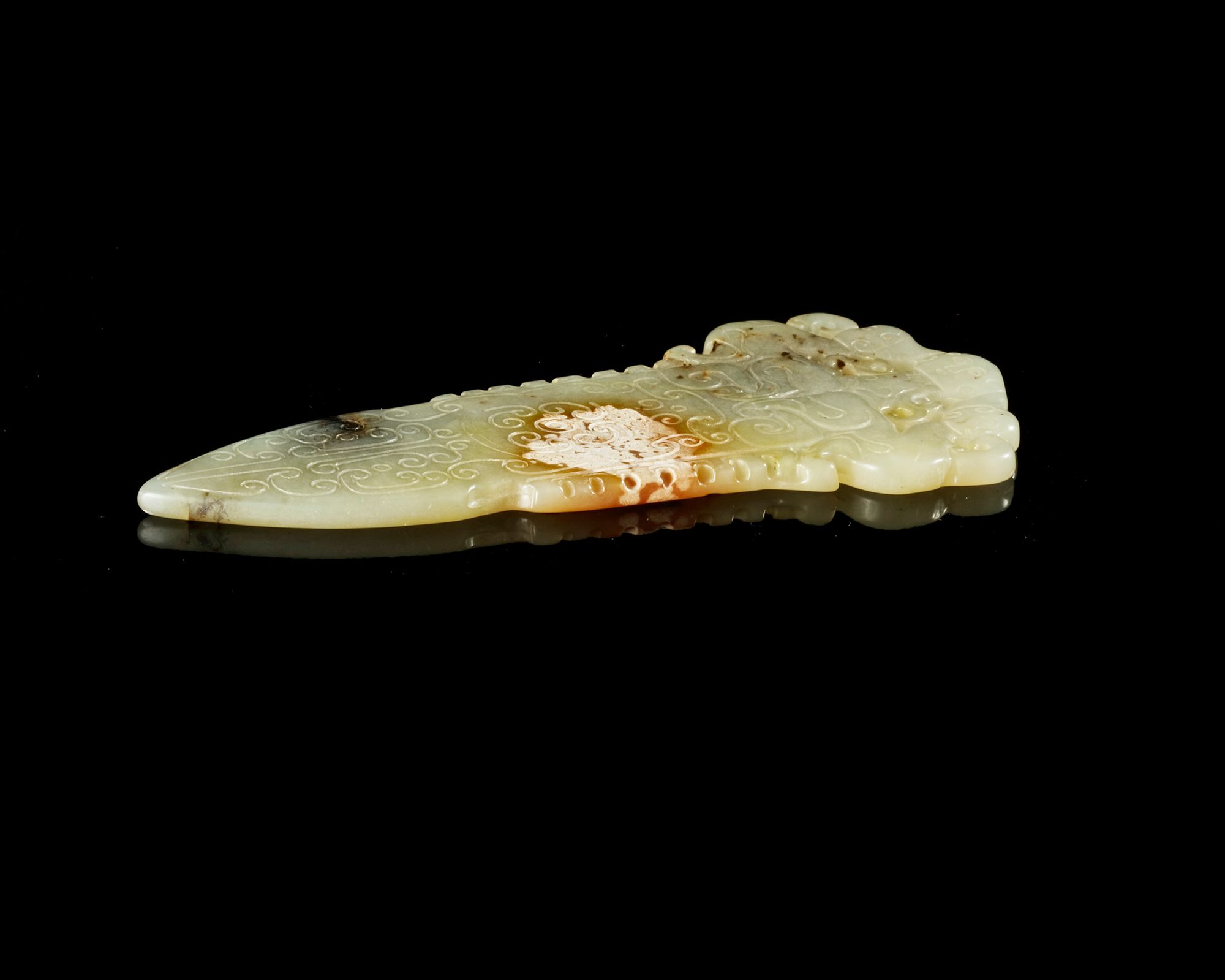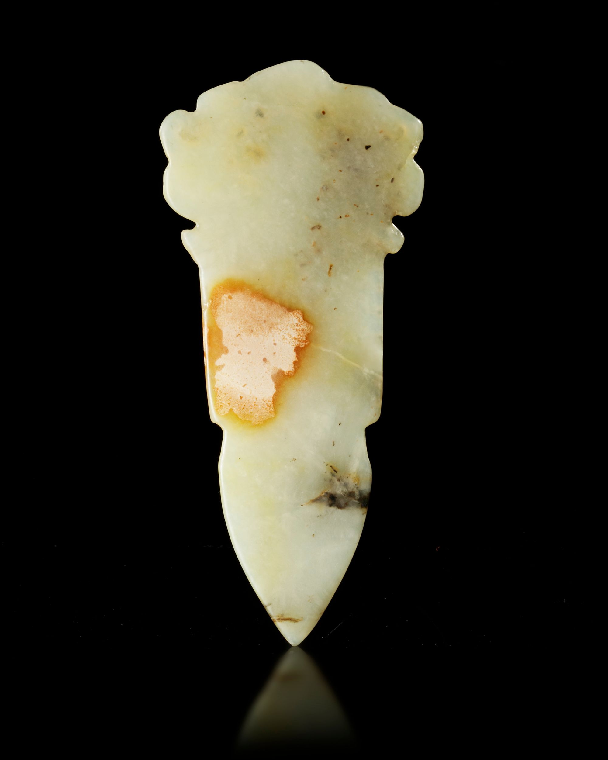 A Chinese jade axe head with archaic design, the stone of pale celadon tone with russet inclusions. Length: 11.2 cm