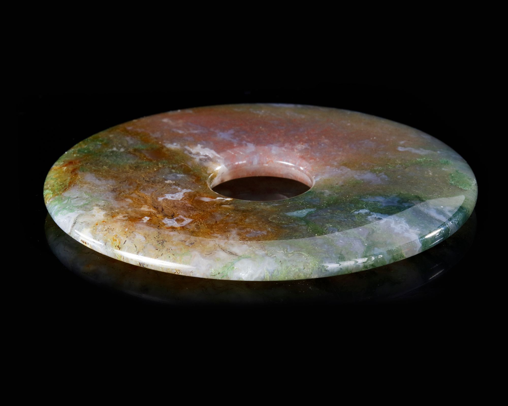 Of flattened circular form, with a circular central aperture with slightly bevelled edge, the green stone is suffused with russet and milky inclusions.