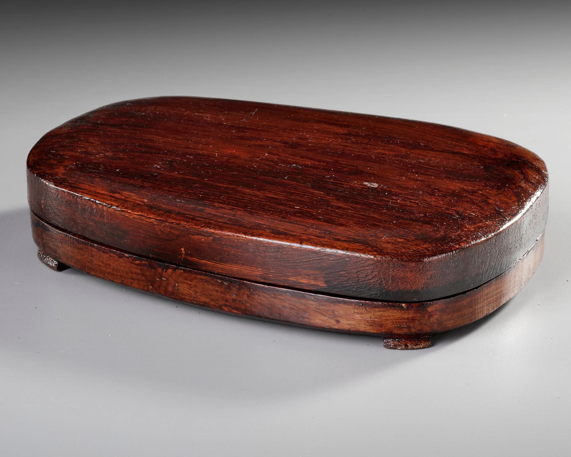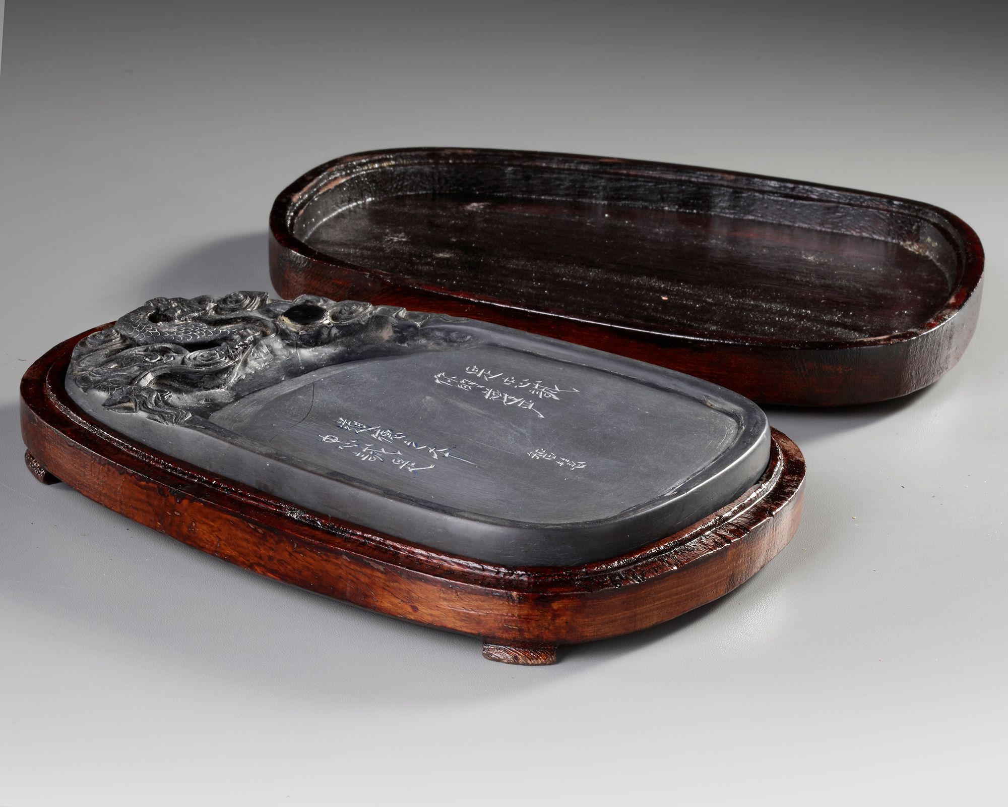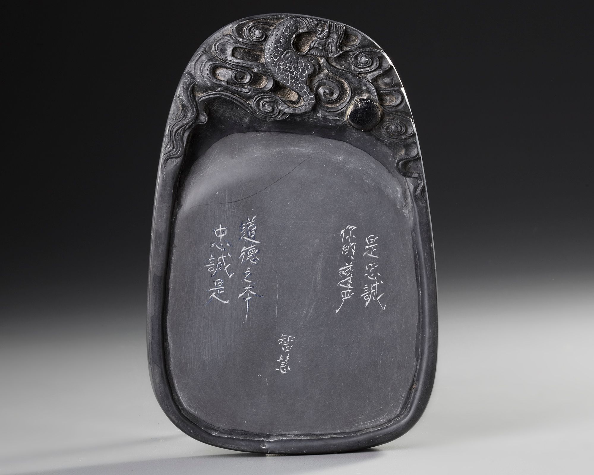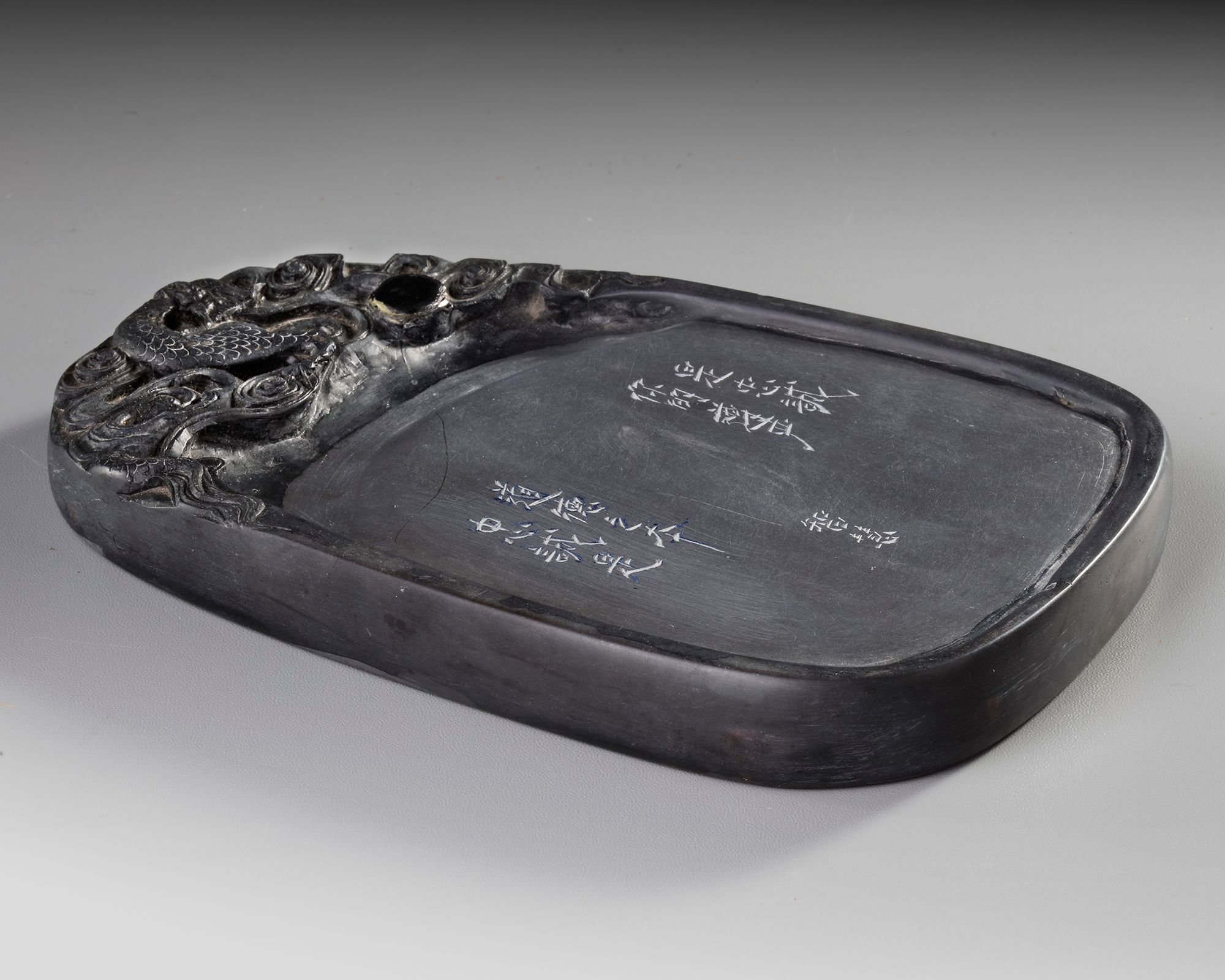 A Chinese duan ink stone carved in relief at one end with a dragon partially visible among waves with Chinese inscriptions. 20 by 14 cm.