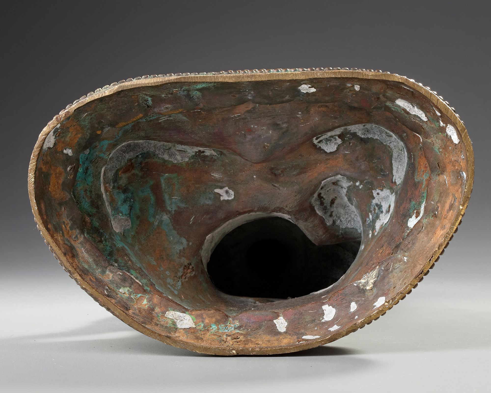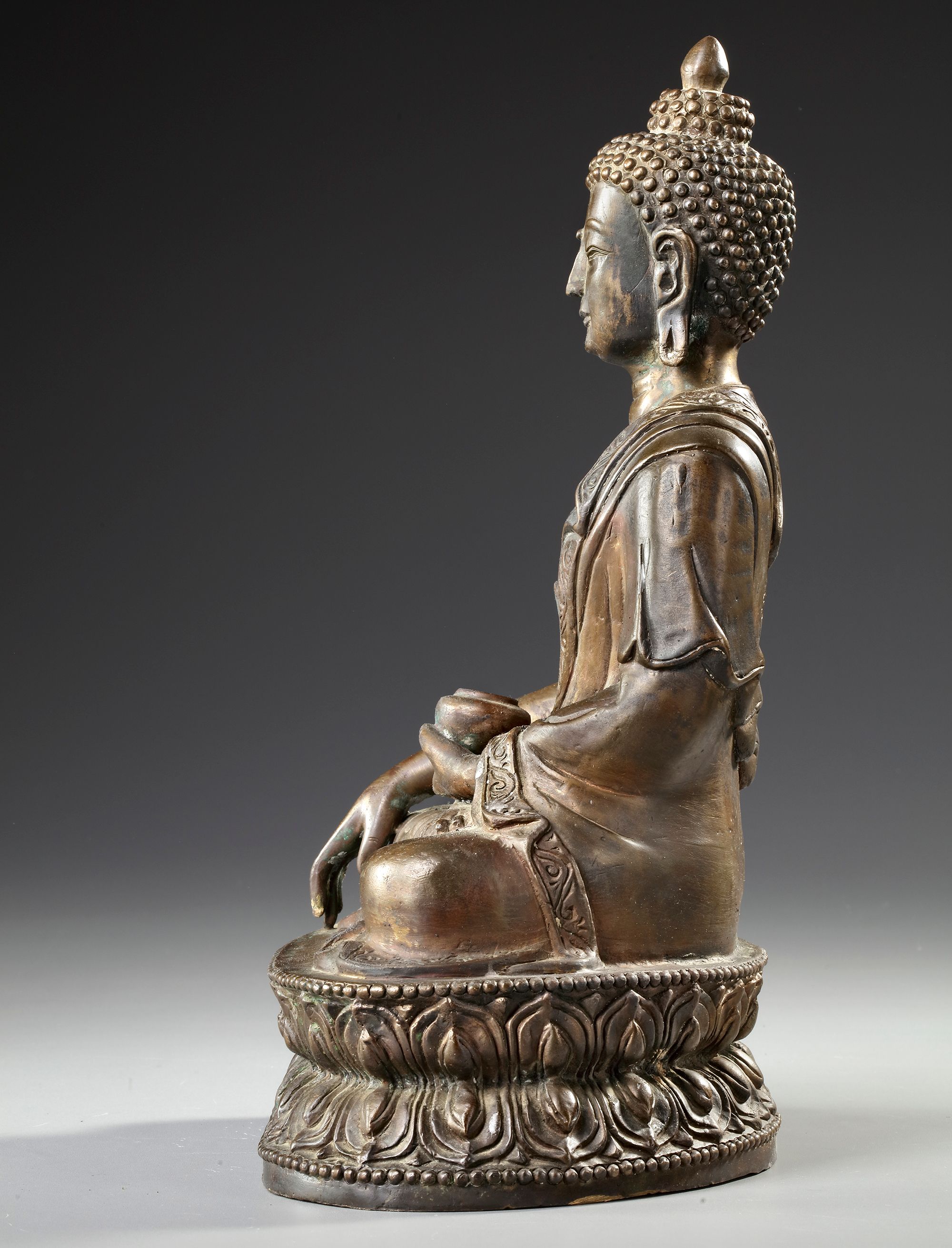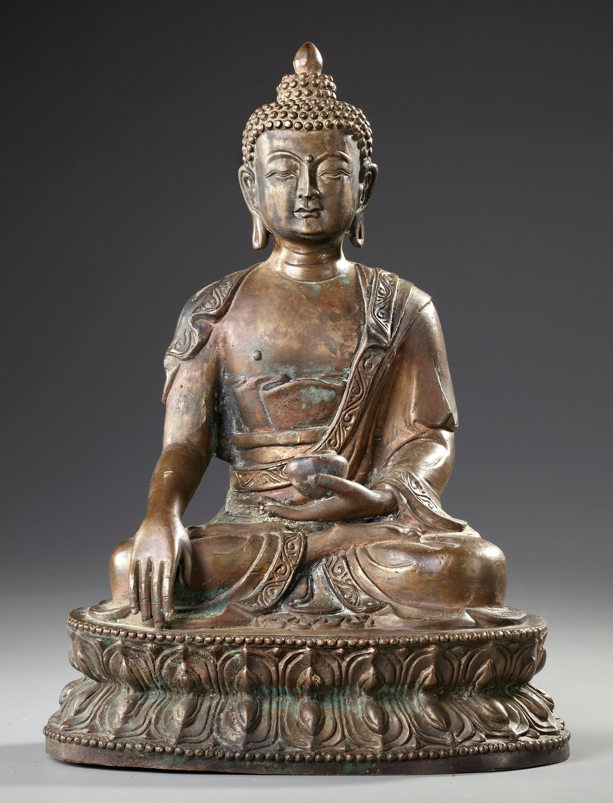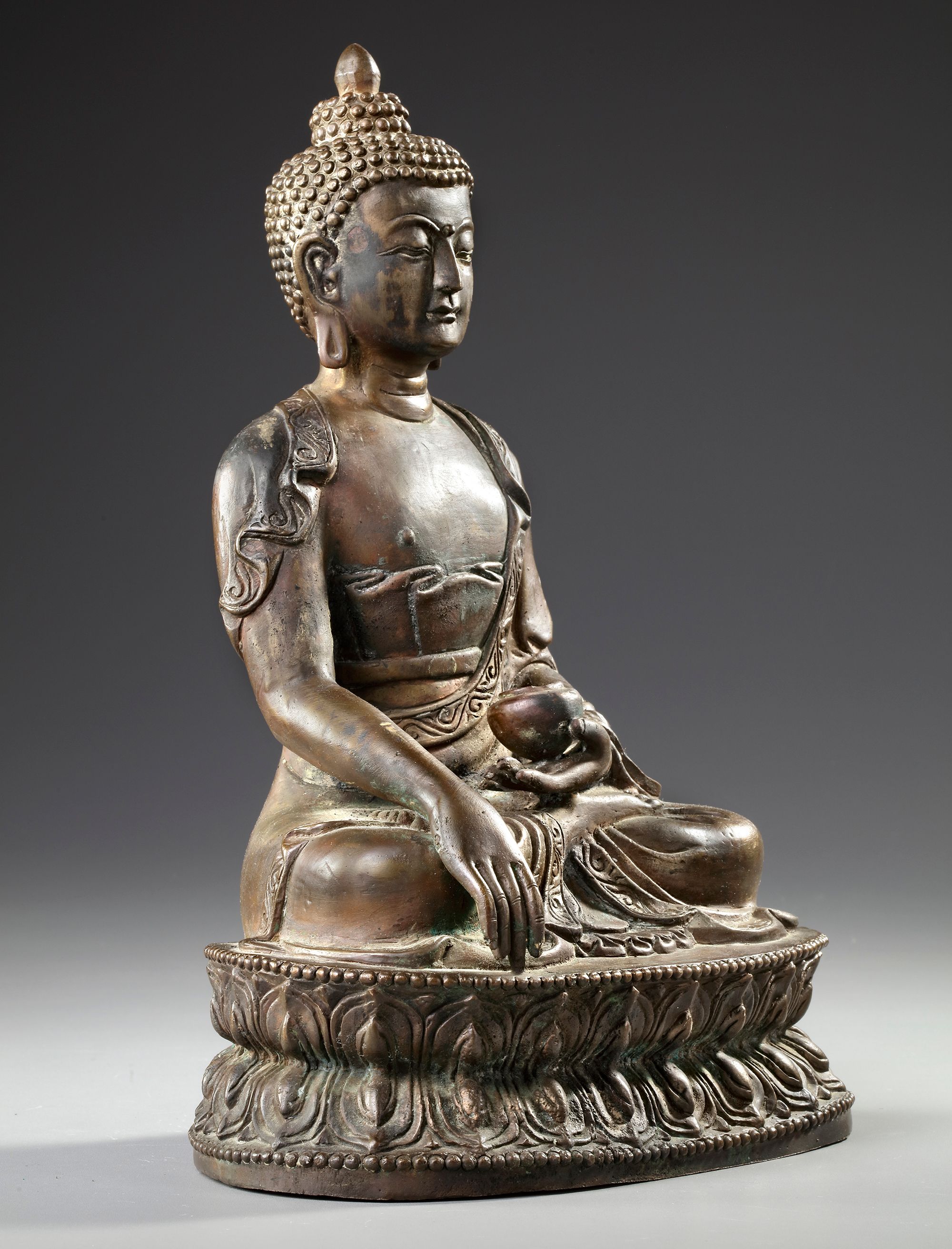 A bronze figure cast seated in paryankasna on a beaded double-lotus throne, his right hand in bhumisparsa mudra and the left in dhyana mudra, wearing a close-fitting sanghati decorated with incised foliate hem, pleated end draped over his left shoulder, portrayed with a serene face framed by a long pendulous earlobes, finely arched eyebrows, eyes downcast in contemplation, and slightly-smiling bow-shaped mouth, all below an ushnisha atop hair neatly arranged in rows of small whorls.