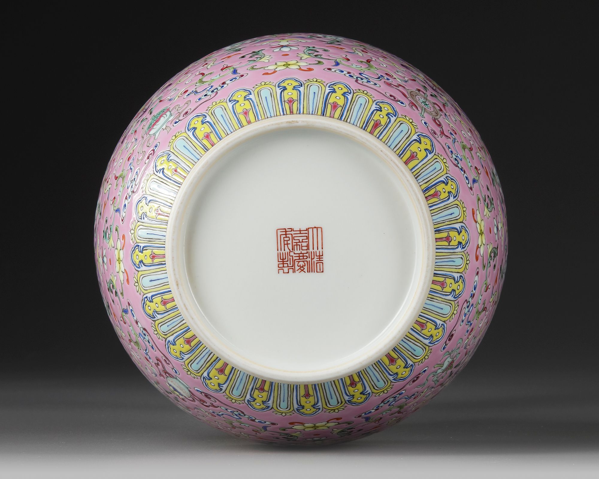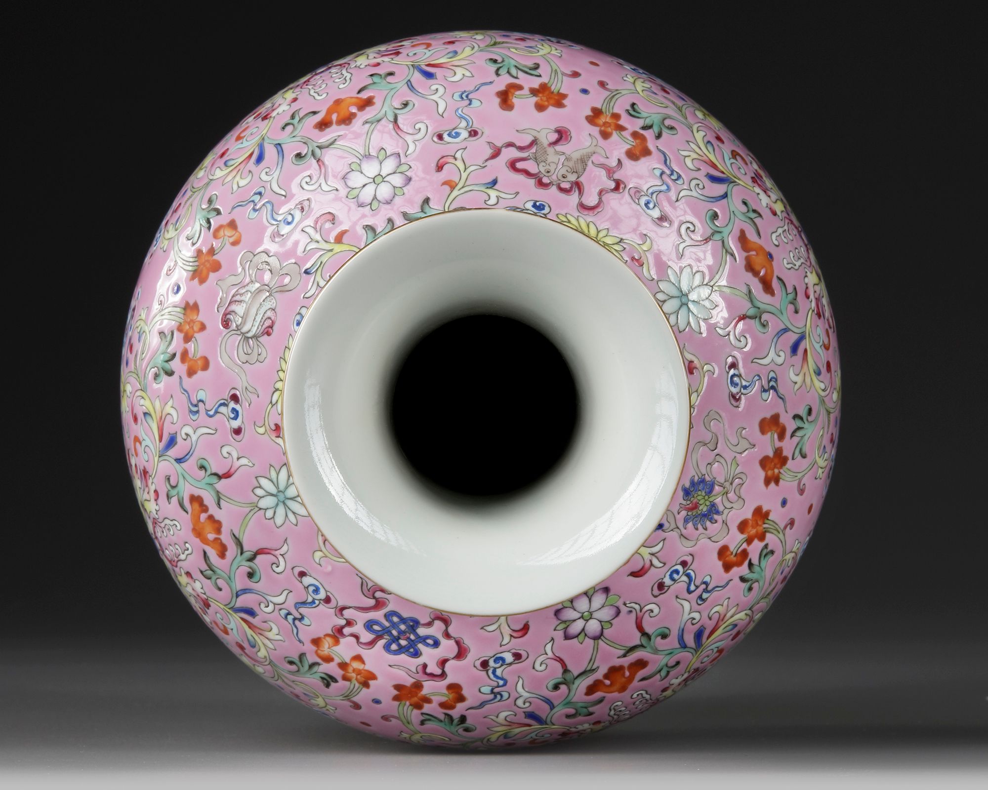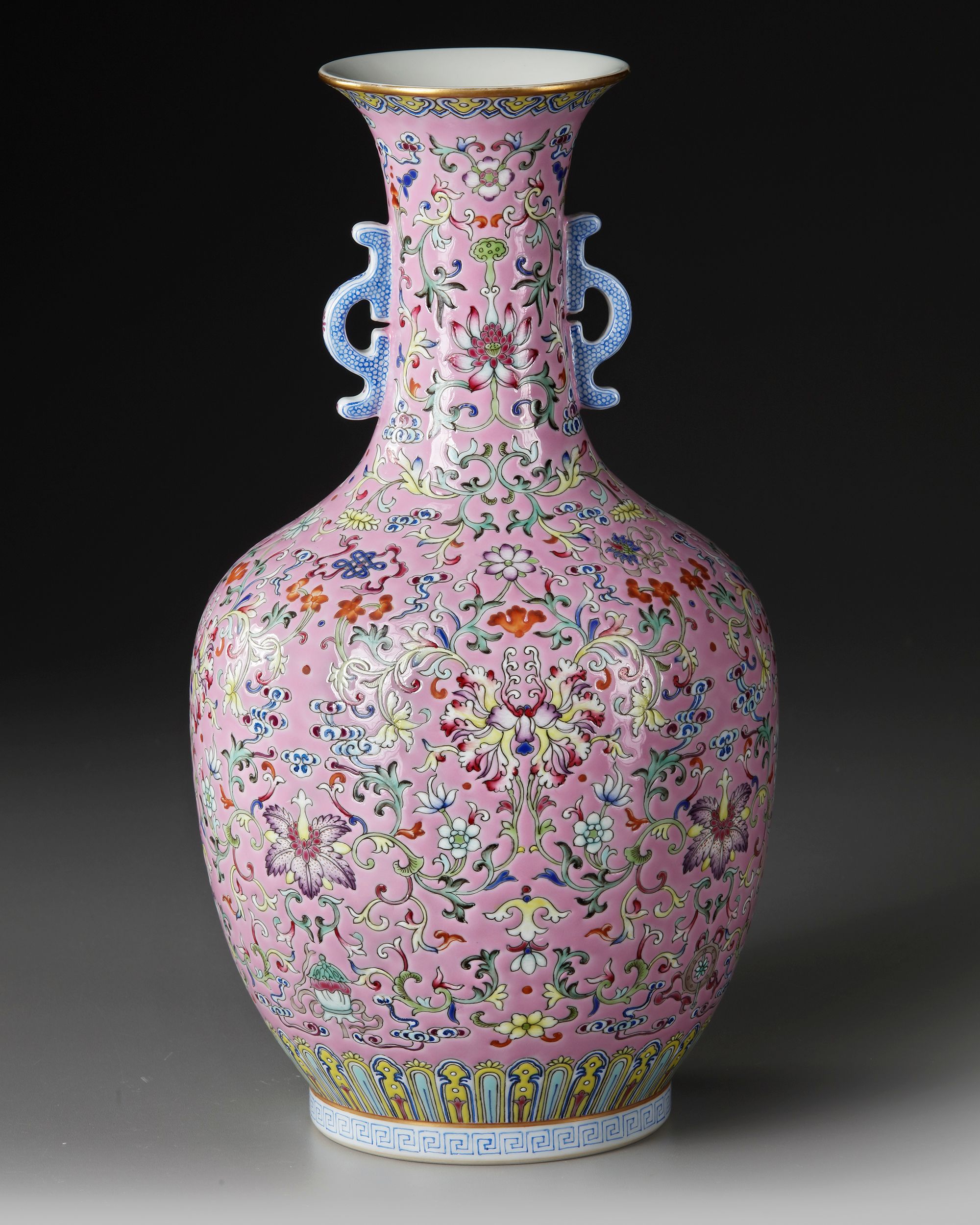 A Chinese porcelain vase, brightly enameled around the globular body with stylised lotus blooms alternating with auspicious emblems, borne on meandering leafy tendrils issuing further florets, surmounted by a slightly waisted neck, flanked by a pair of scrolled fretwork handles, beneath a band of ruyi-heads and above a a petal lappet border at the foot with gilt rims, all reserved on a pink ground. The bottom with a Chinese Jiaqing seal mark.