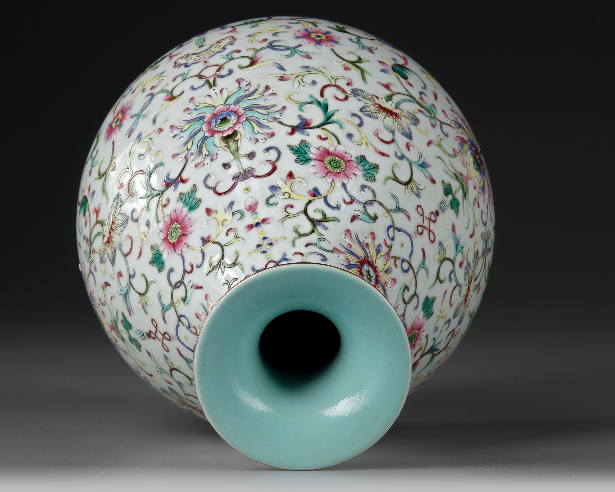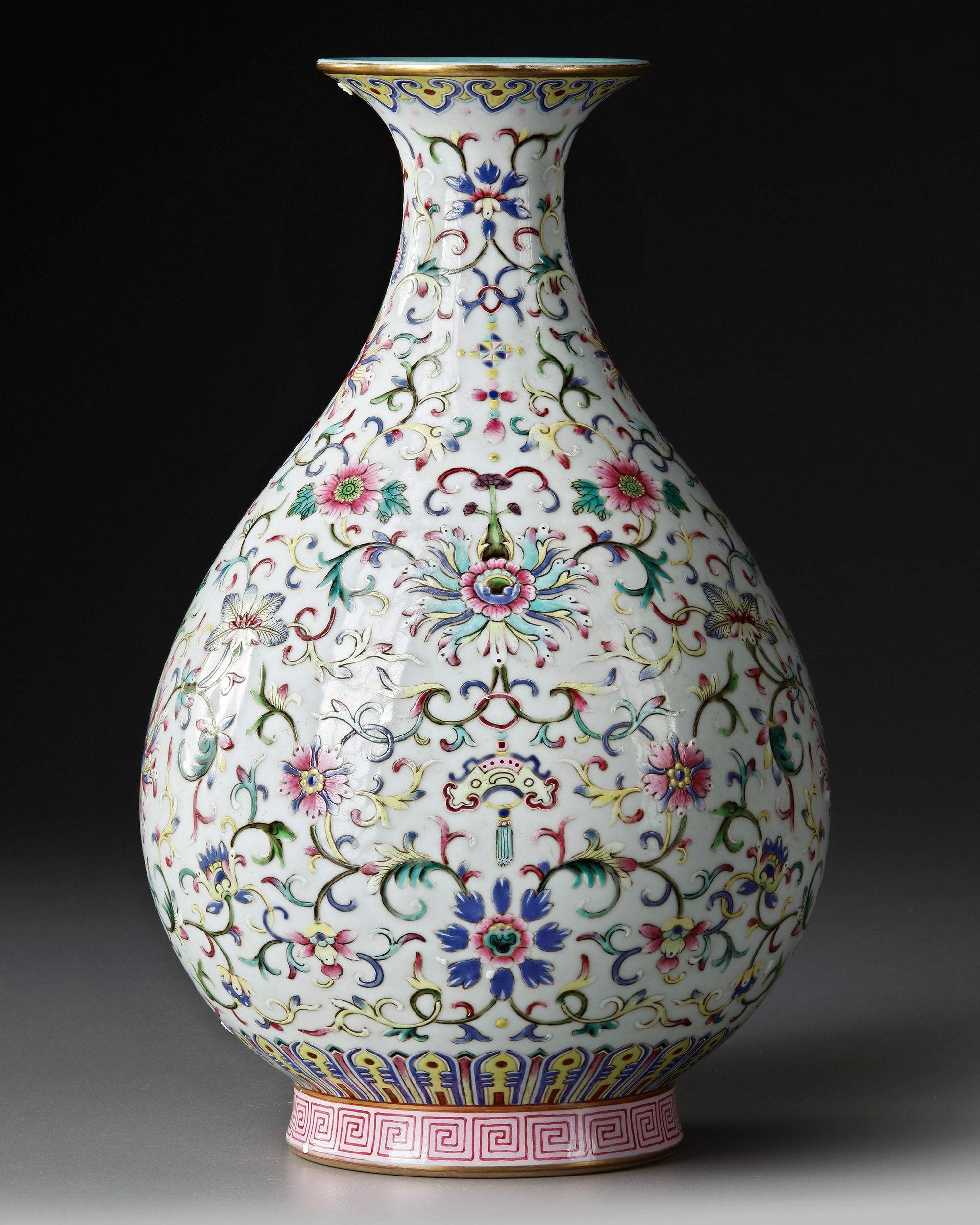 The pear-shaped vase is well-enamelled around the bulbous body with four large stylised lotus blooms amidst a network of scrolling tendrils bearing other minor blooms, all reserved on a white ground and between a band of pendant ruyi heads around the rim and upright lotus petals around the base, above a keyfret chain.The bottom with a Chinese Jiaqing seal mark on a turquoise glazed ground. Height: 29 cm.