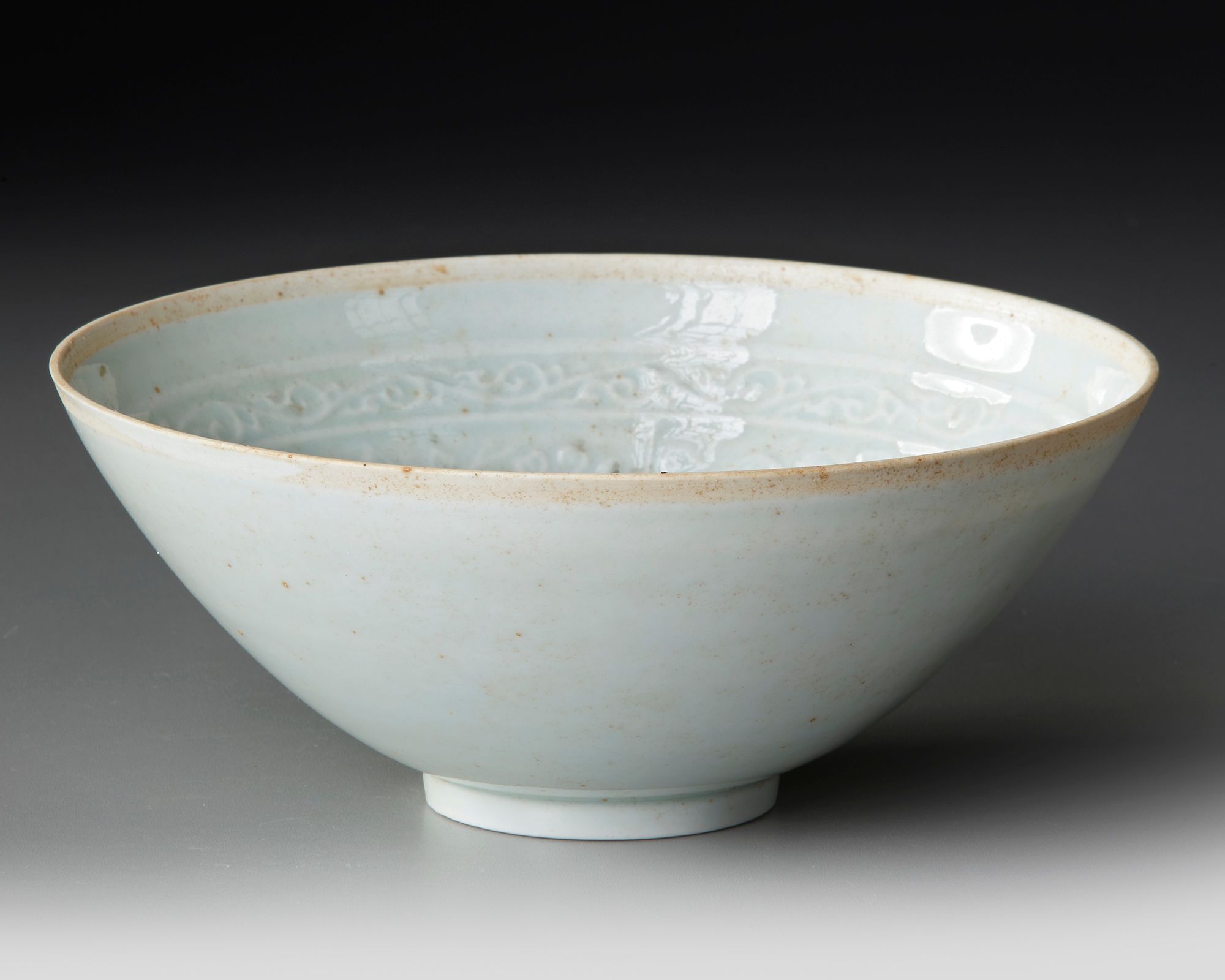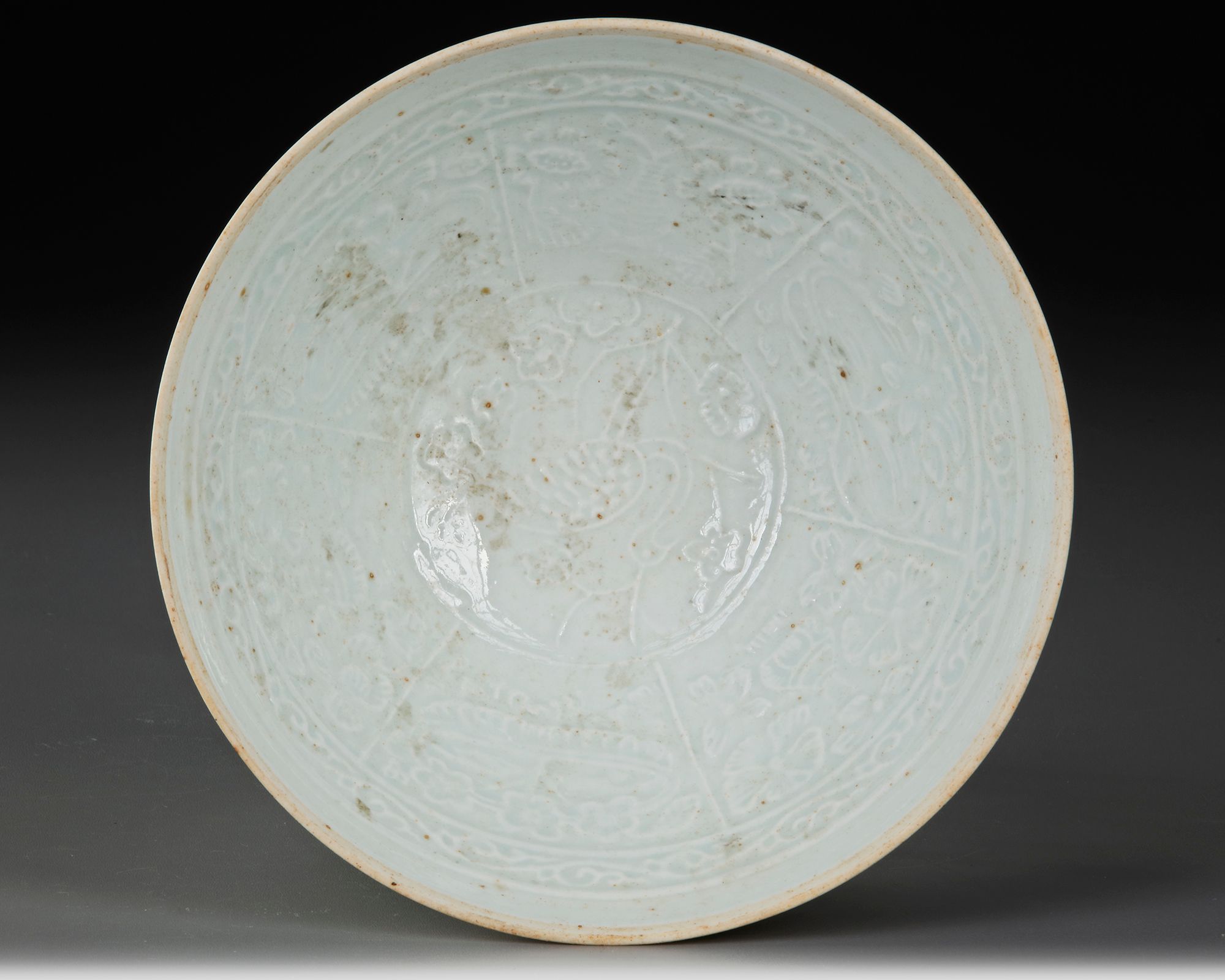 The bowl is carved to the centre and the cavetto with flowers amongst foliage. 20 by 8 cm.