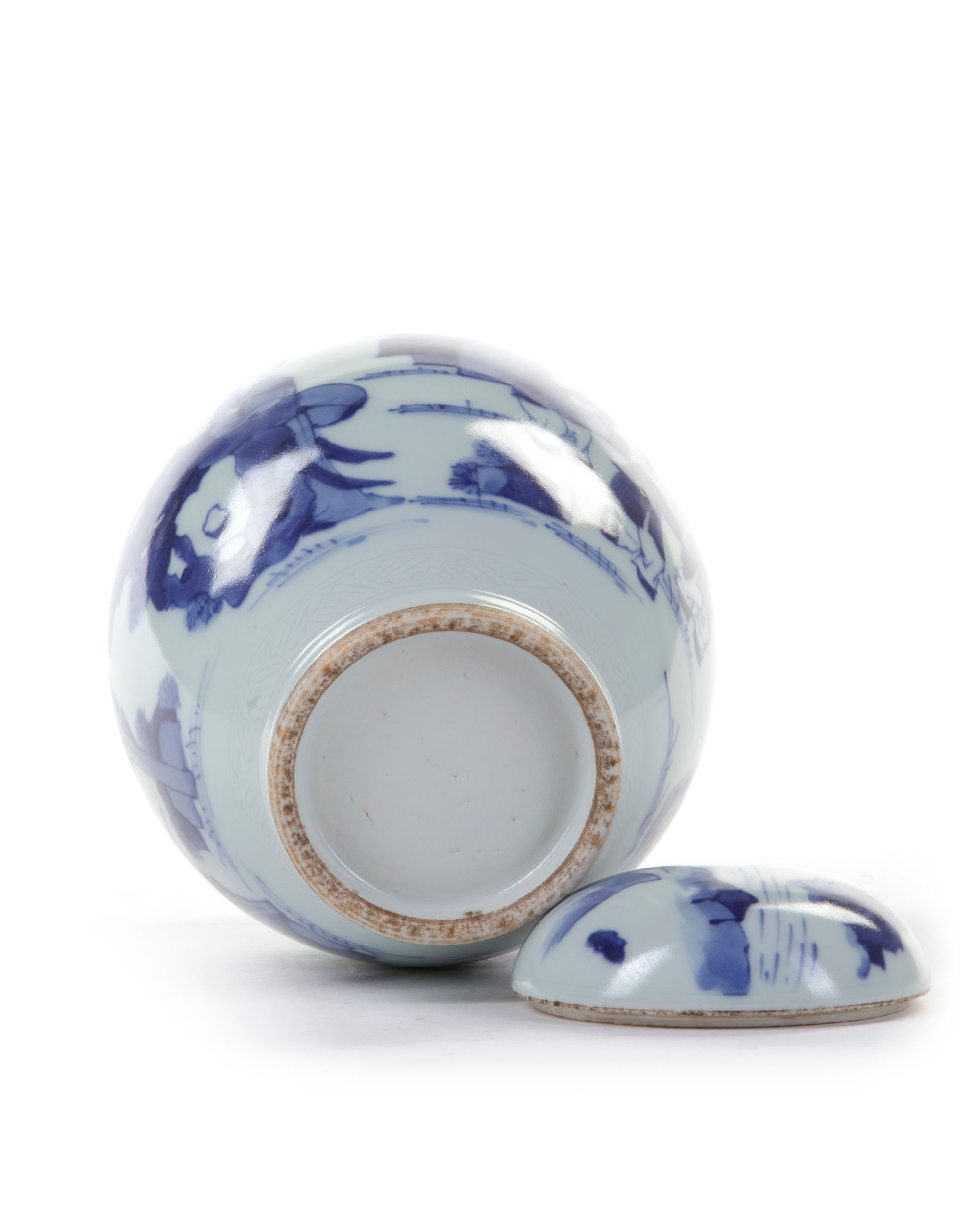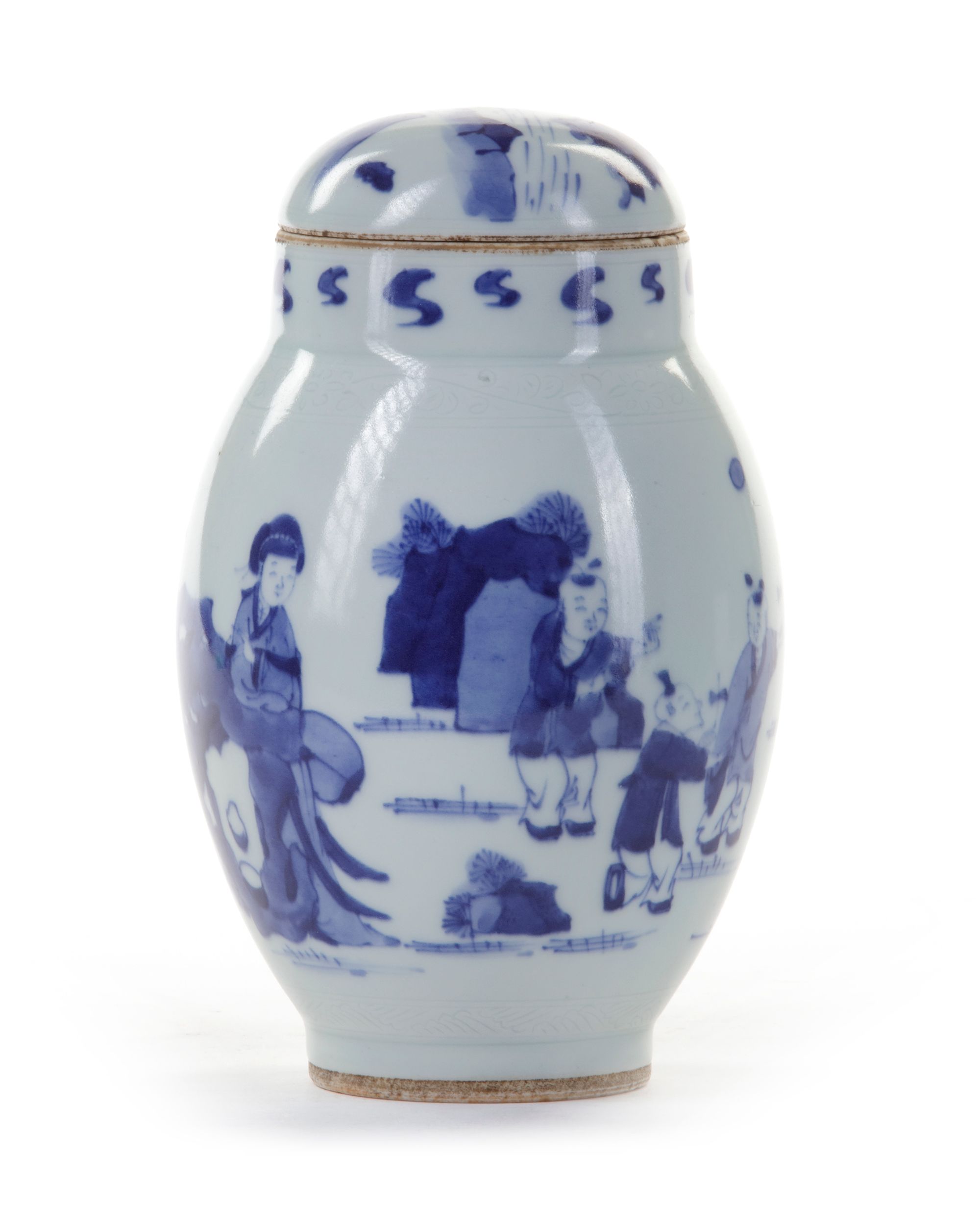 A Chinese porcelain pot decorated with an elegant lady and kids in a garden. Height 19 cm.