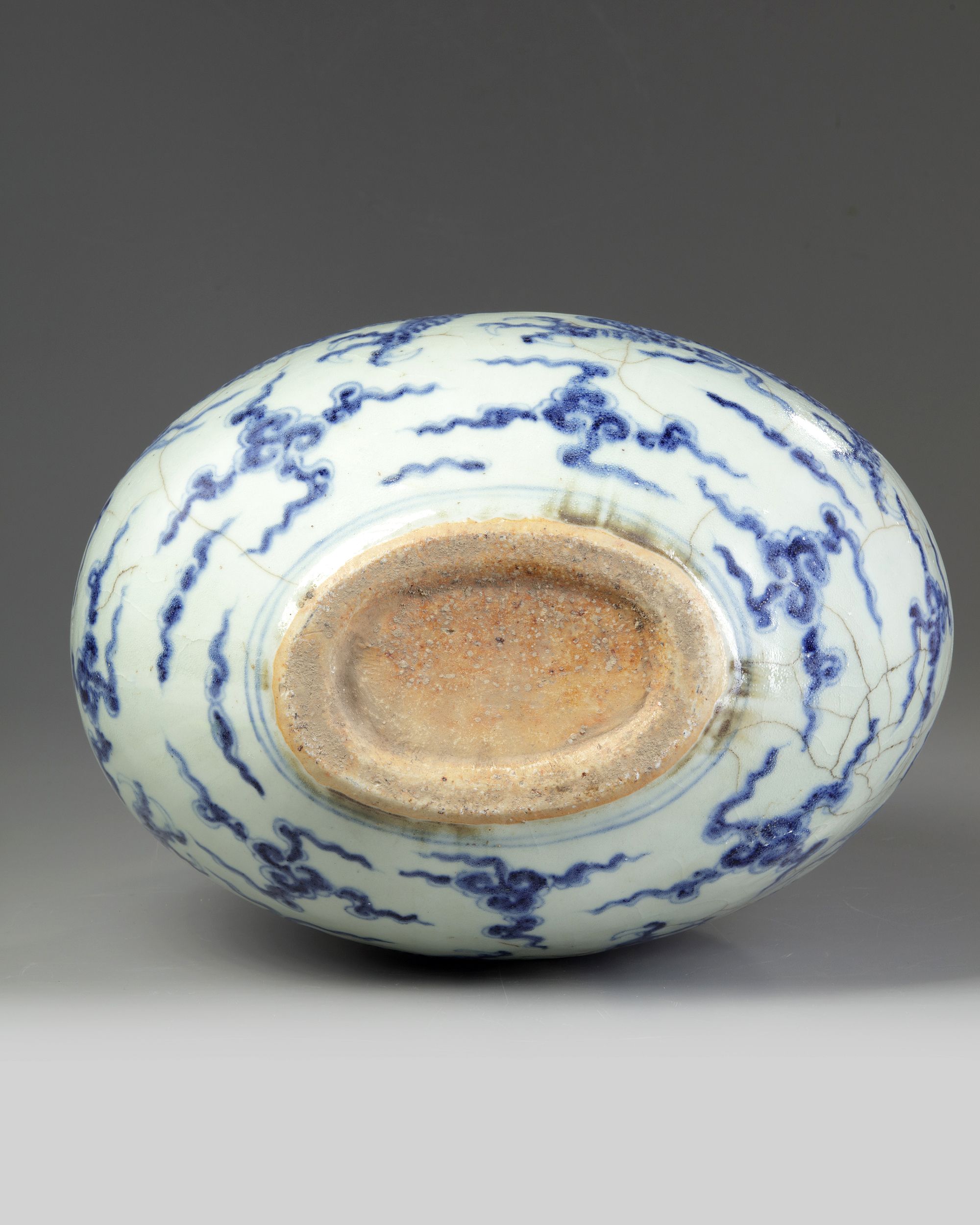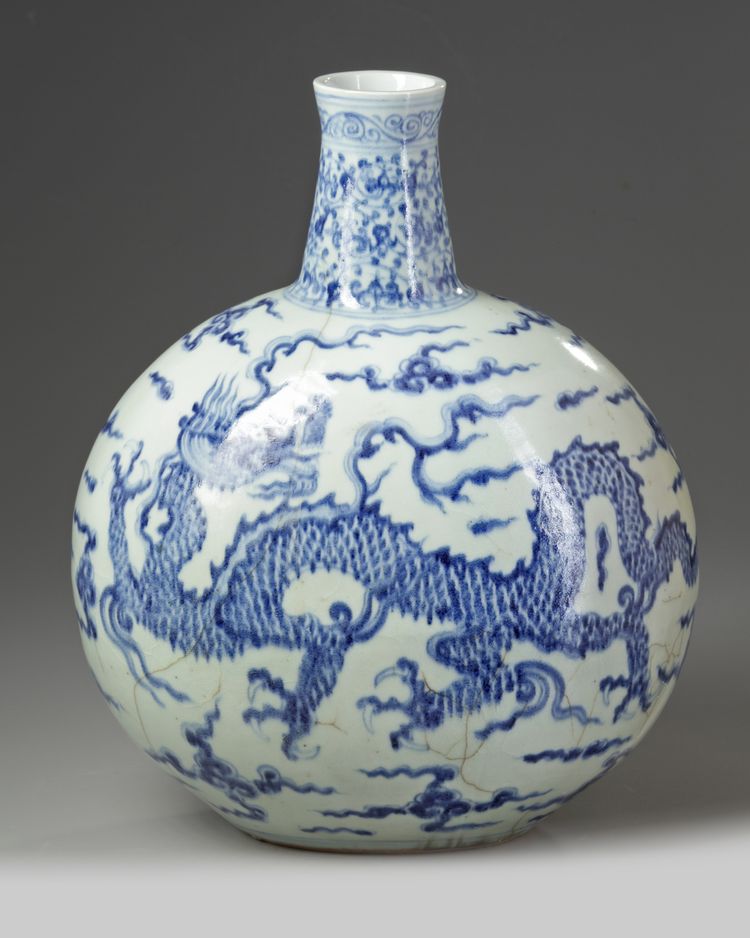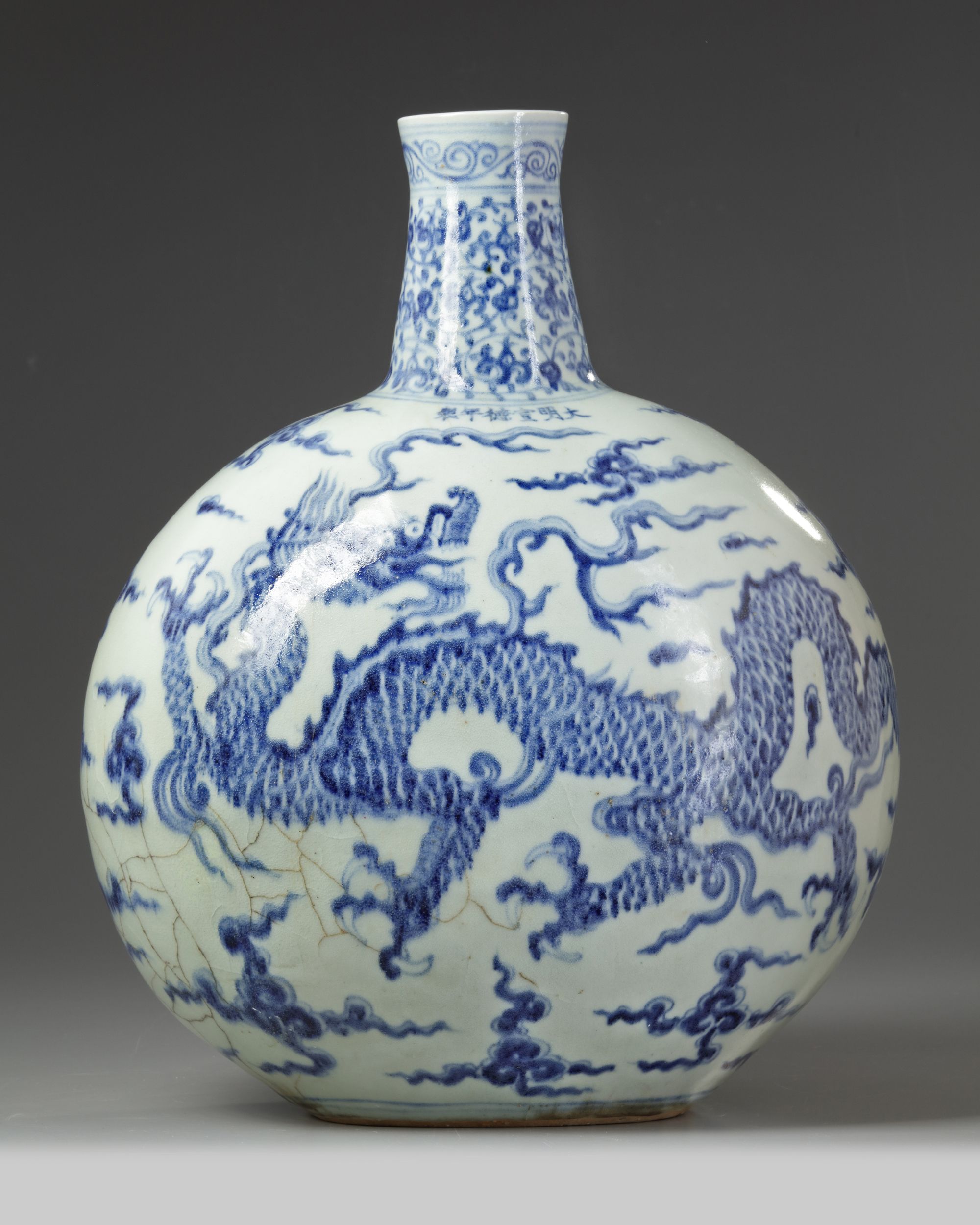 A LARGE CHINESE BLUE AND WHITE 'DRAGON' MOON FLASK