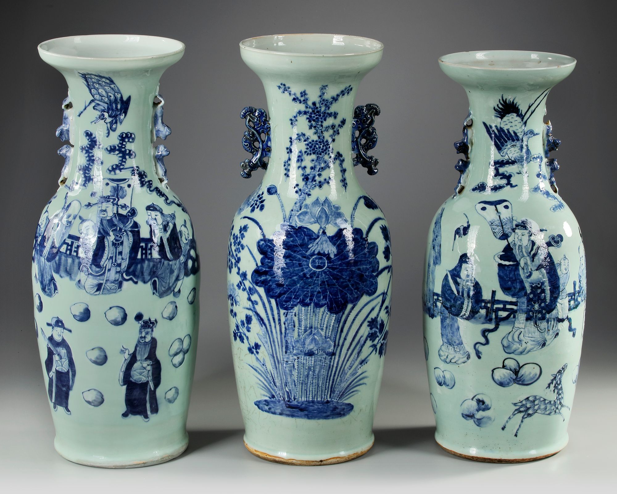 A Chinese porcelain vase, stylized with two pairs of Fu dog shaped handles, decorated in blue and white with Sanxing deities ( Fu Lu Shou) with children in a fenced garden with cranes at flight.