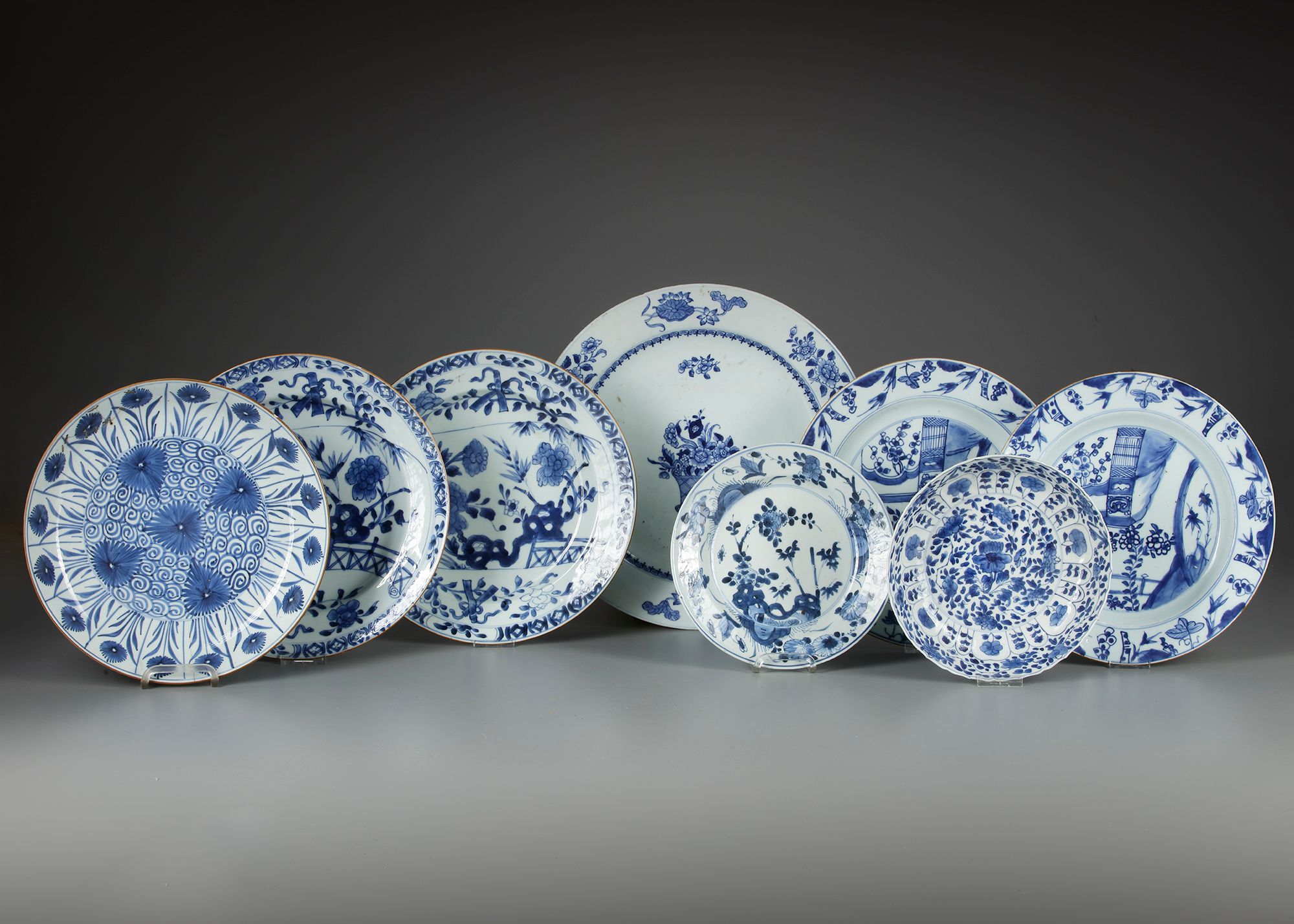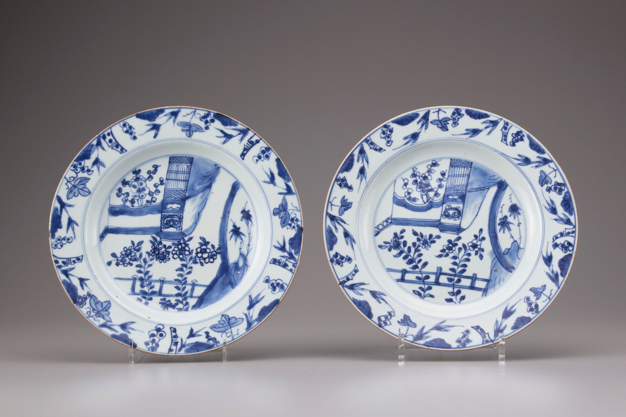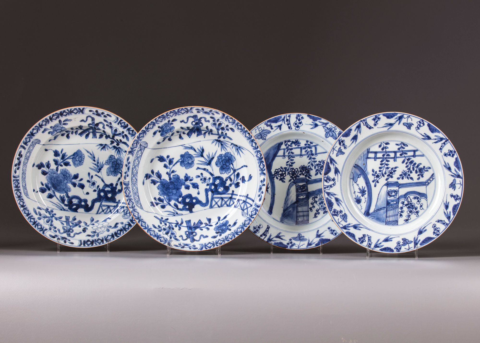 Four Chinese blue and white plates, 18th century Decorated in underglaze blue with a fenced terrace with peony, prunes and bamboo, the rim decorated with grapes and bamboo. Two plates of different design. Diam 27.5 cm.