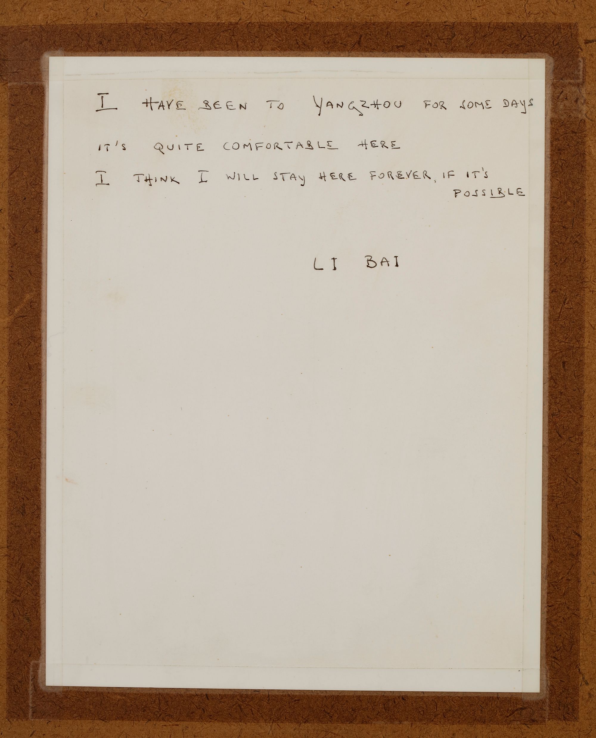 One of the most important figures of the Tang Dynasty. He is renowned for his poetry, which often reflects the beauty of nature, the enjoyment of wine, and philosophical musings. In this image, Li Bai is portrayed in a relaxed position, leaning against a wine jar. His eyes are closed, and he wears a peaceful smile, reflecting his carefree, reflective nature.Next to him are chrysanthemums, a symbol of autumn and impermanence, frequently seen in the literature and art of that time. The painting also features calligraphy, likely a quote from one of his famous poems, where he often celebrates life, nature, and the pleasures of wine. The red seals are stamps that possibly represent the artist and their studio.The scene exudes tranquility and contemplation, typical of Li Bai’s outlook on life, where he found joy in simple pleasures like wine while deeply pondering the grandeur of nature and the universe. 49 by 36 cm.