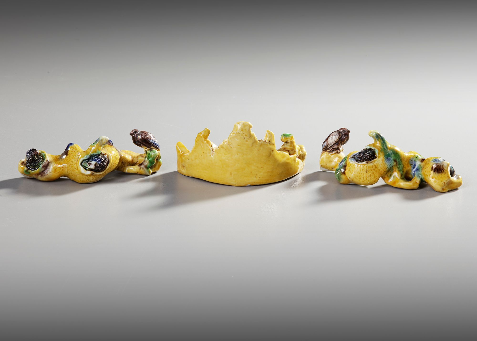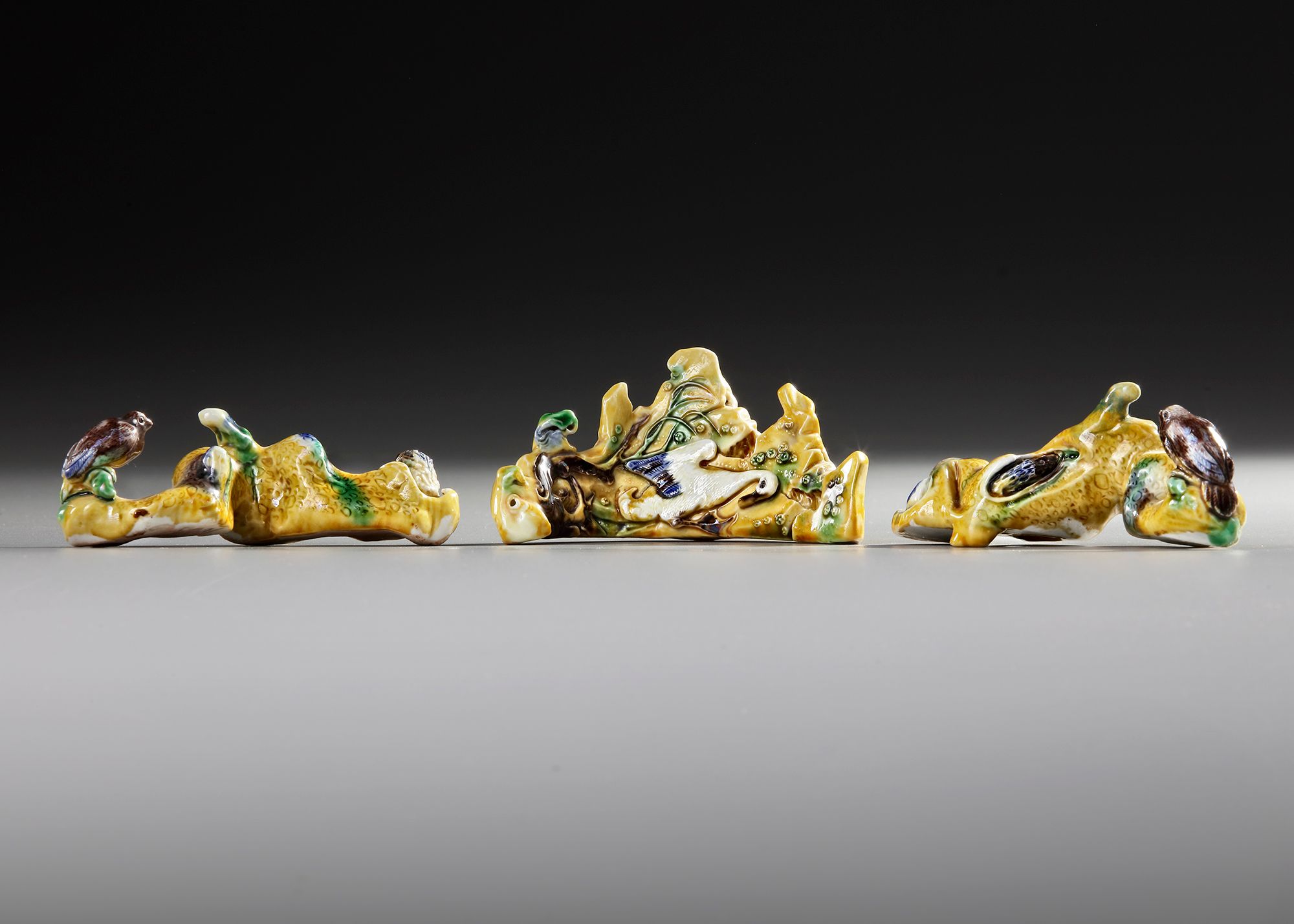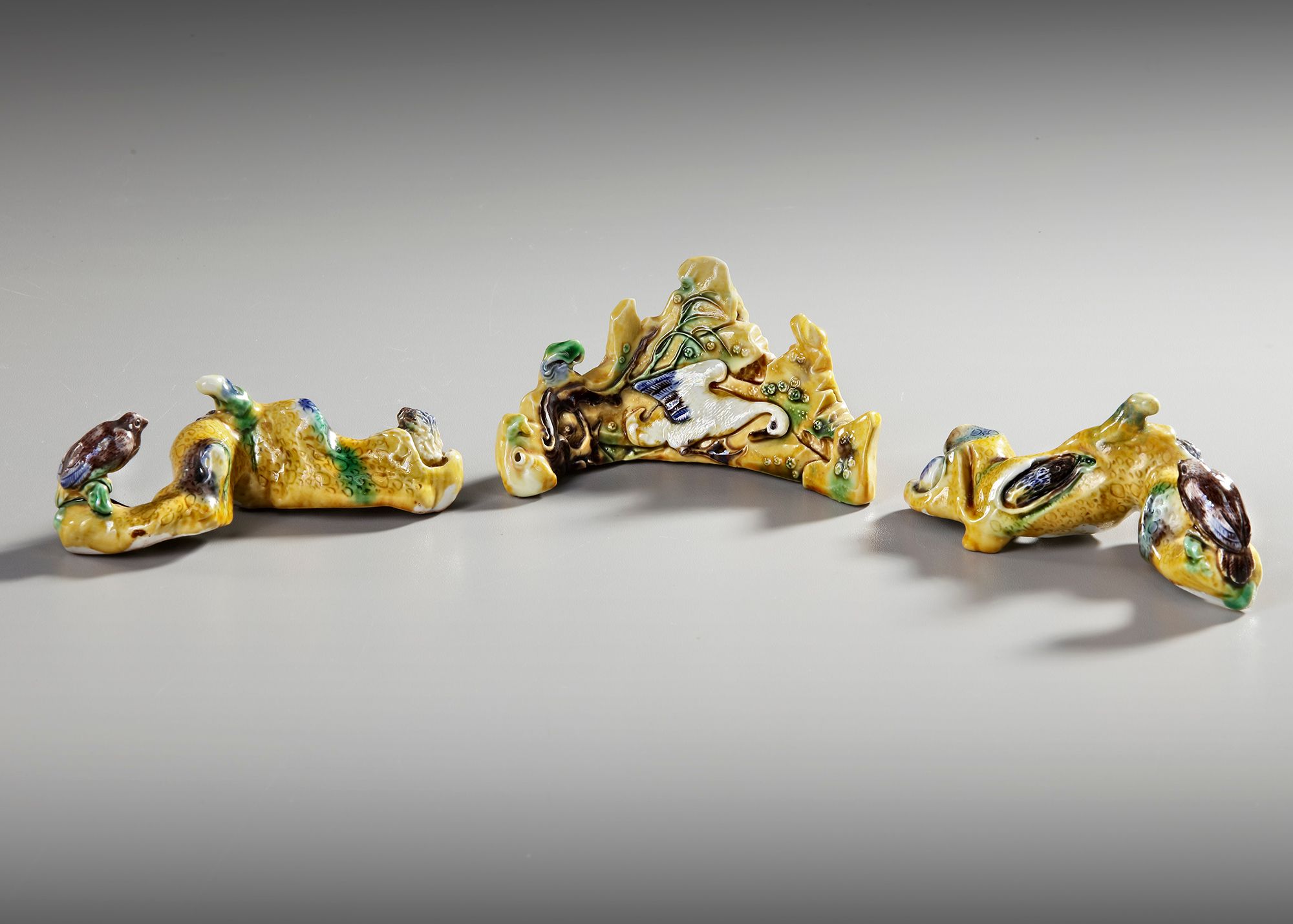 The central biscuit rock-molded brush rest is decorated with a white-glazed duck in low relief, the other two brush rests are molded as tree branches with a bird perched in high relief.