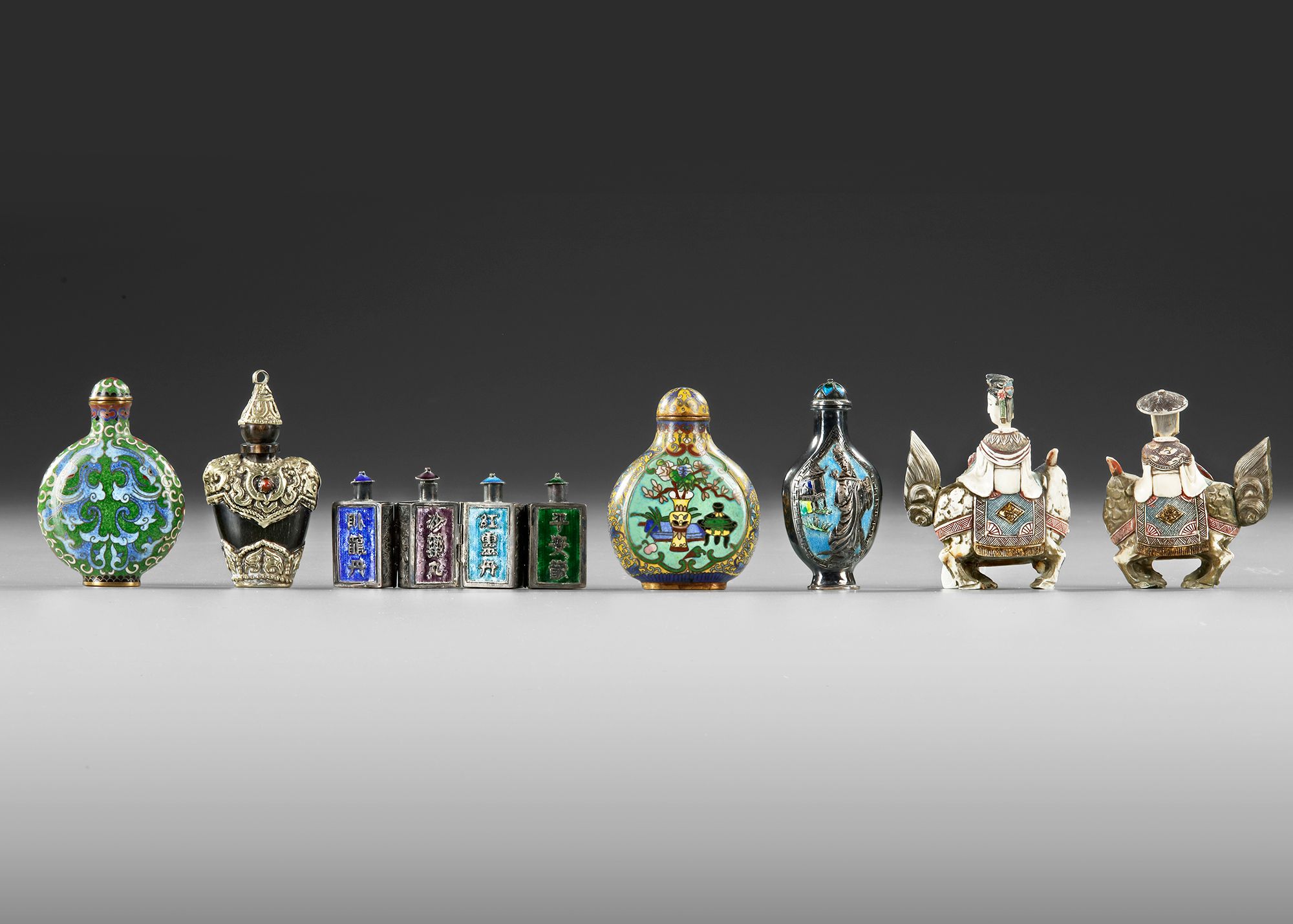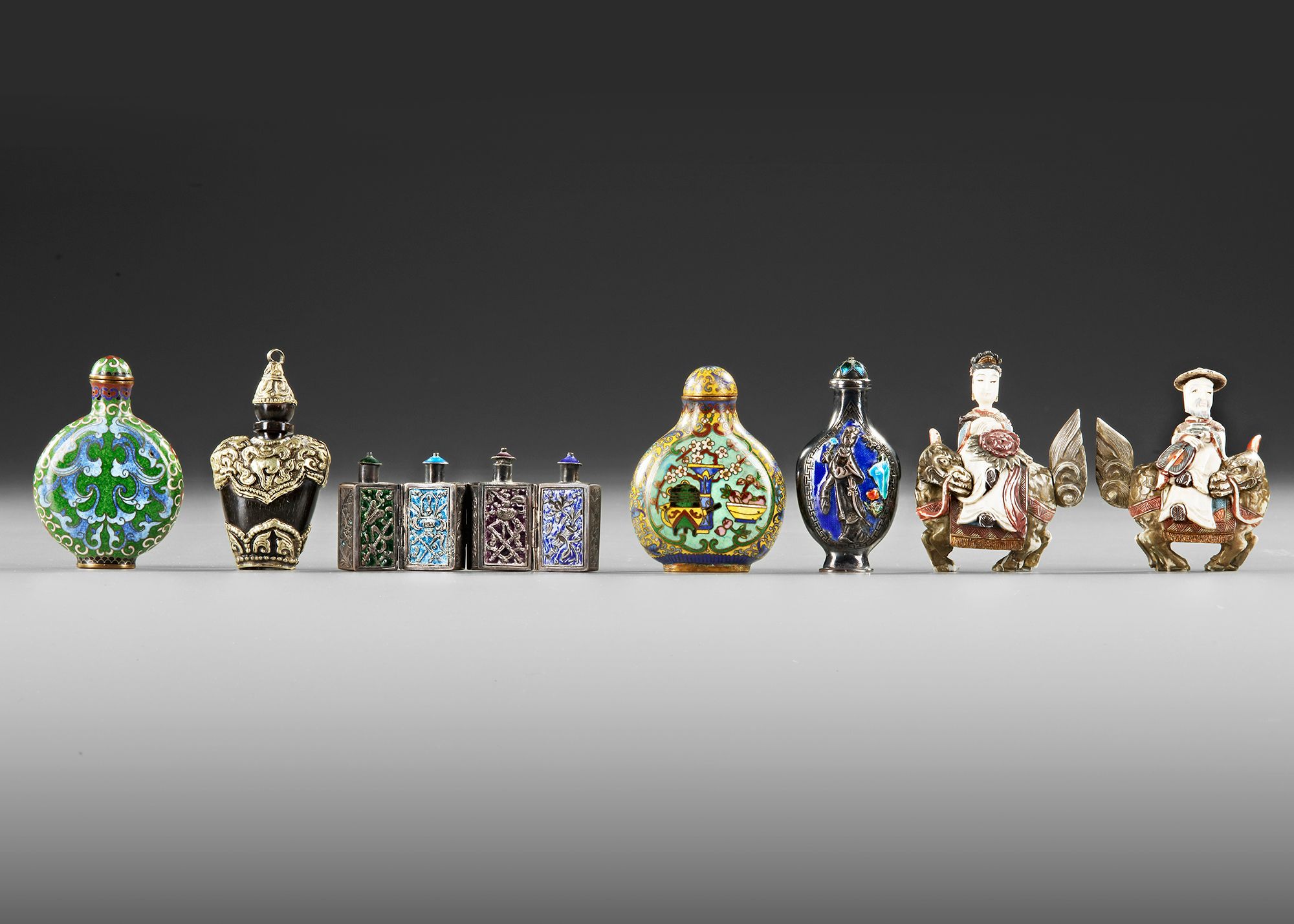 The group comprises: a Chinese hinghed silver and enamel fourfold snuff bottle (4 particular parts), two Chinese cloisonne snuff bottles decorated with floral scrolls and precious items, two carved figures, and a Tibetan snuff bottle with silver fittings.