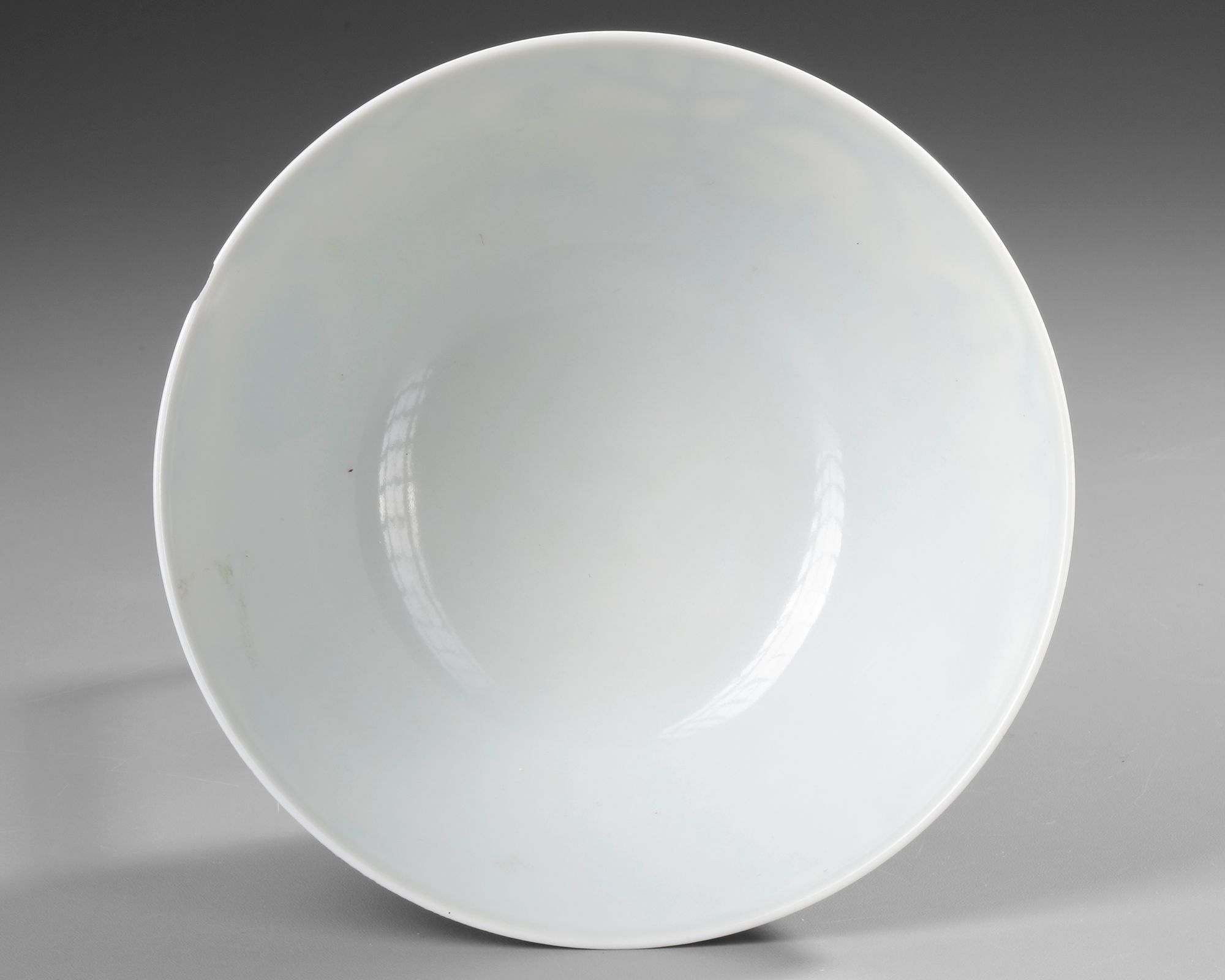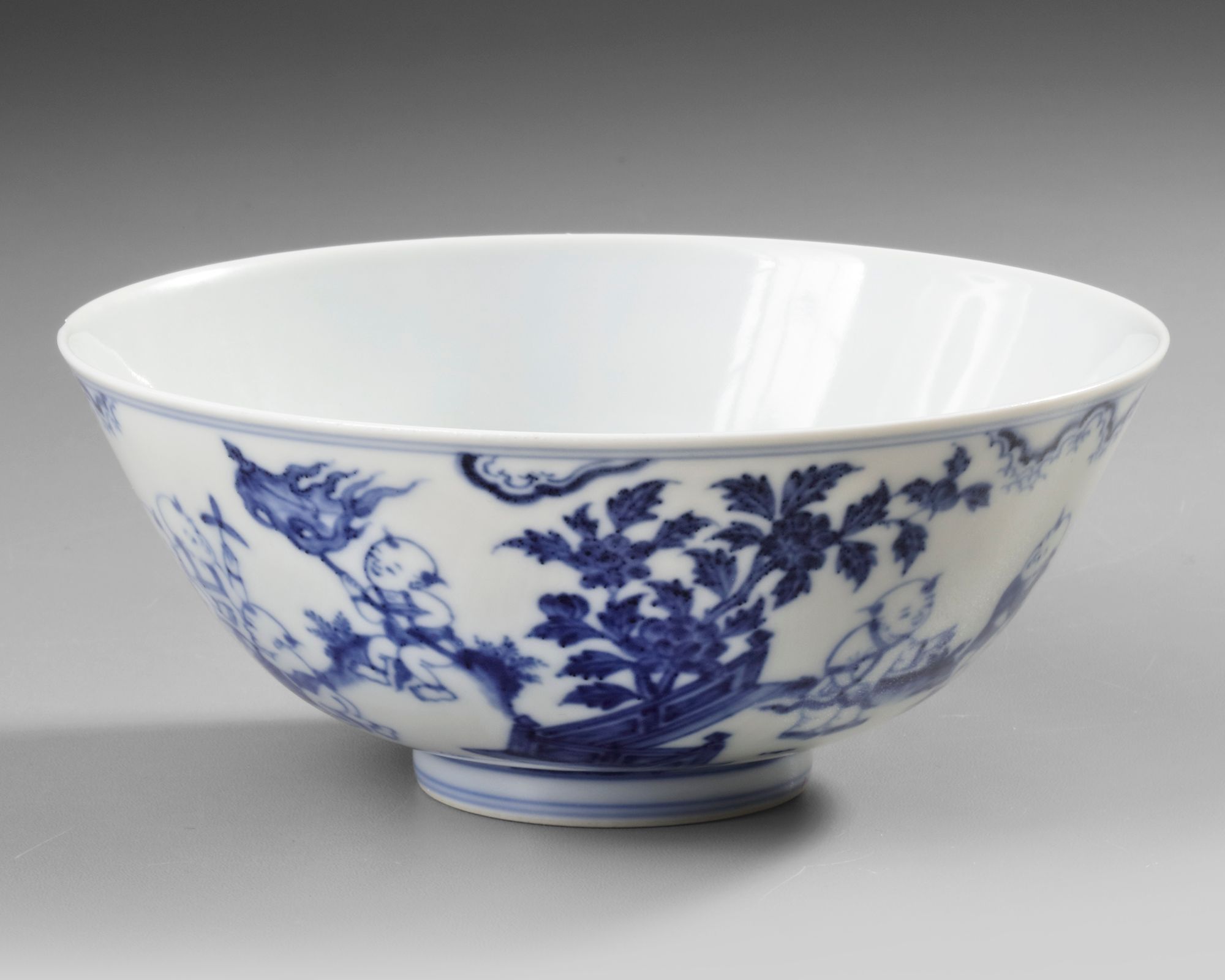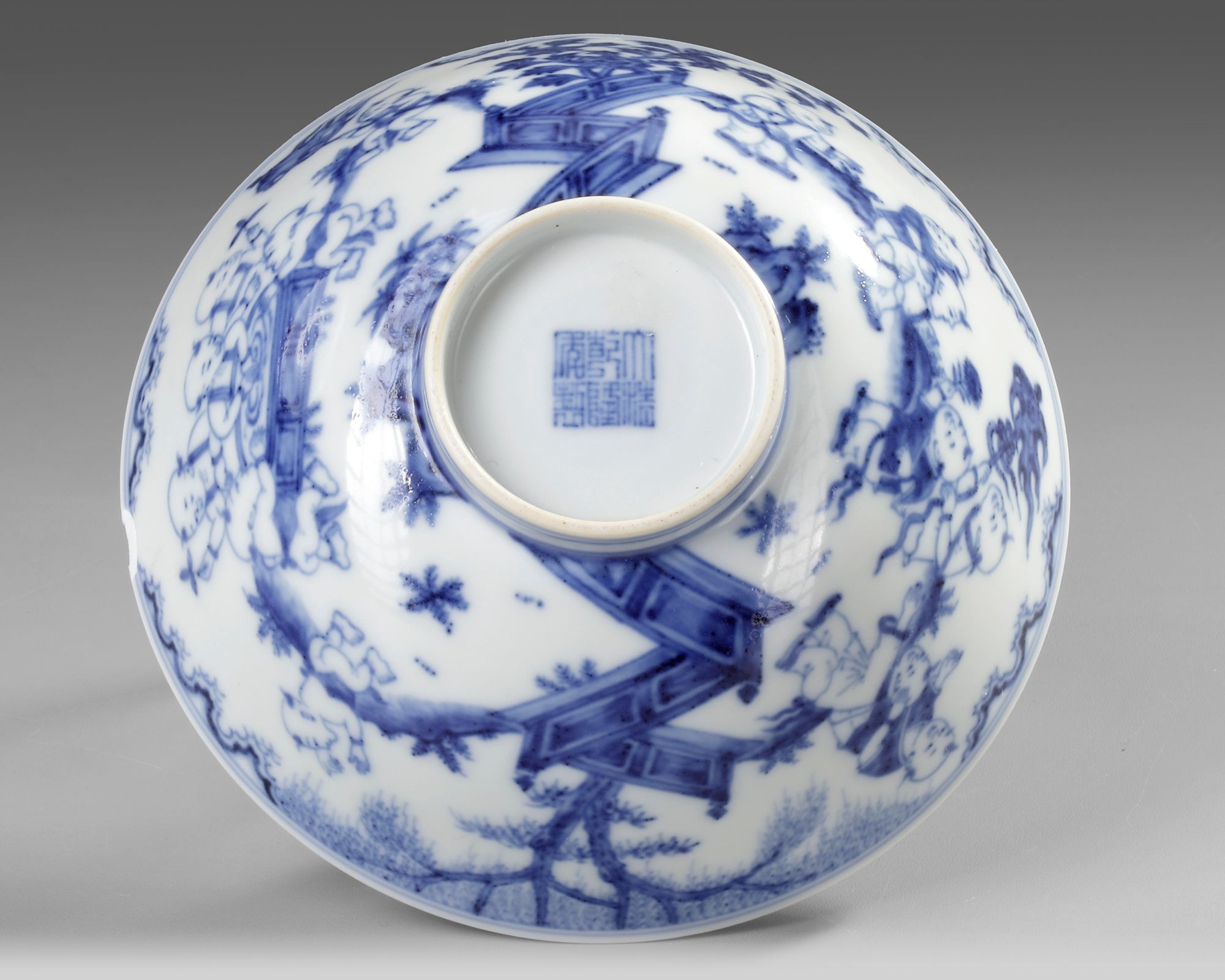 A Chinese porcelain bowl of deep, rounded form, painted in soft tones of underglaze cobalt blue with two continuous scenes of boys playing in a balustrade garden beneath scrolling clouds, the bottom with a Chinese Qianlong seal mark.