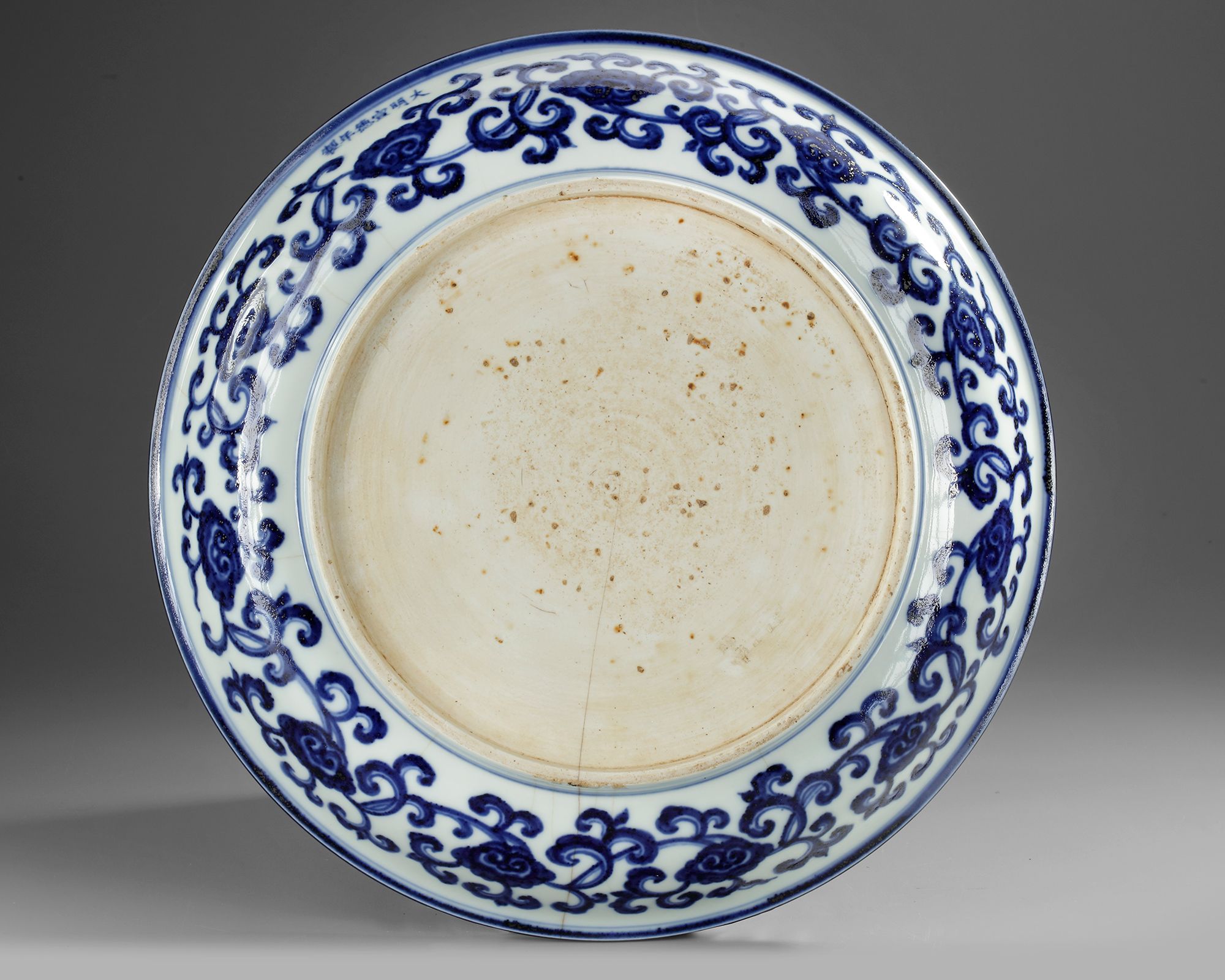 A Chinese porcelain blue and white charger with rounded sides and an everted rim, decorated in cobalt blue with an asymmetric 'flower-and-bird' composition depicting two long-tailed birds perched on a branch of peach, with fully ripe peach fruit hanging pendent. The cavetto is bordered with evenly spaced sprays of chrysanthemum, lily, and peony, alternating with sprays of pomegranate, cherry, lychee, and peach. On the exterior, there is a peony scroll pattern and a Chinese Xuande six-character mark. Diameter 37 cm. With a hairline.