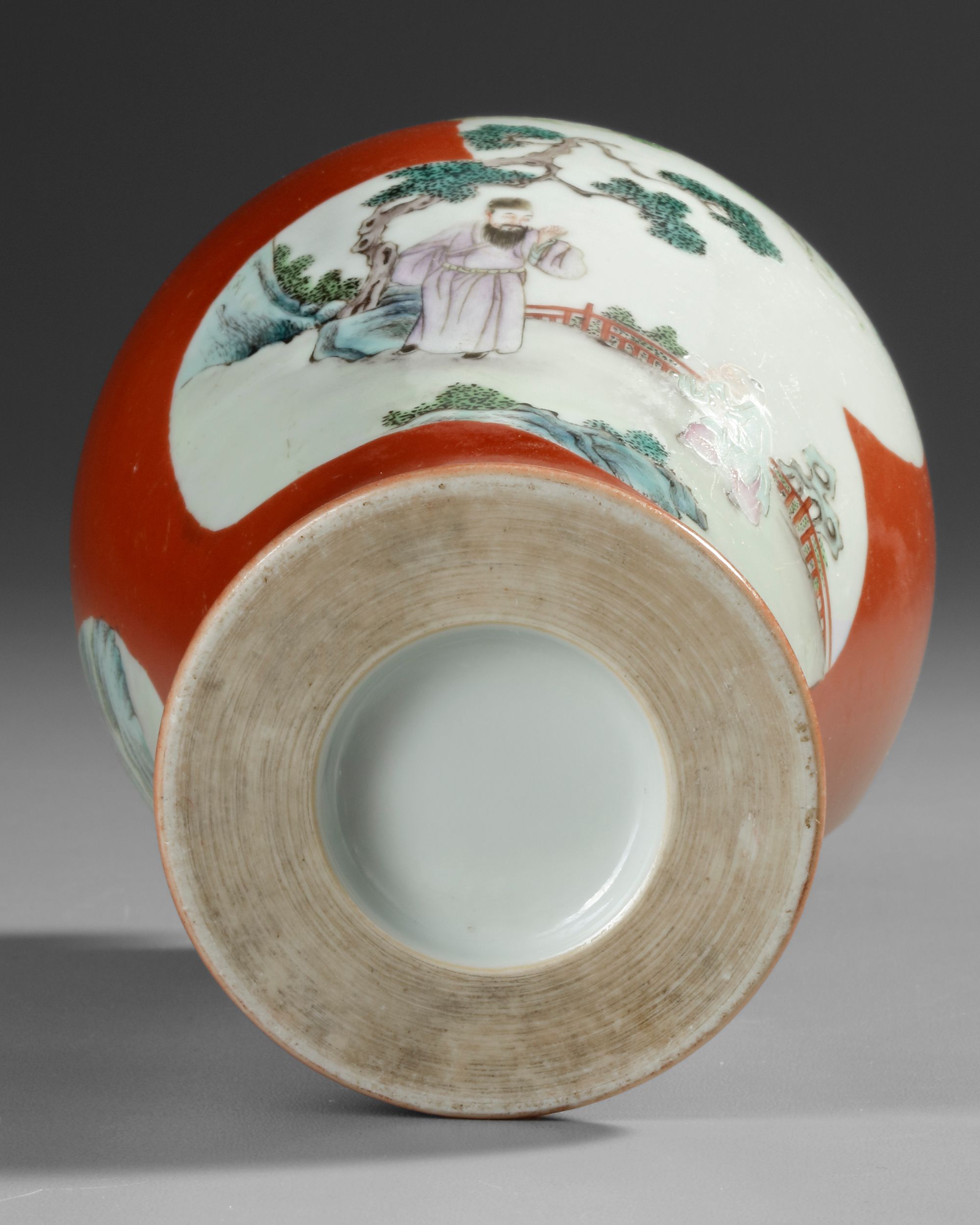 A Chinese meiping porcelain vase, covered with a coral-red glaze and decorated in famille rose enamels, featuring two pomegranate-shaped panels, each depicting a scholar with a child under a pine tree in a fenced garden.