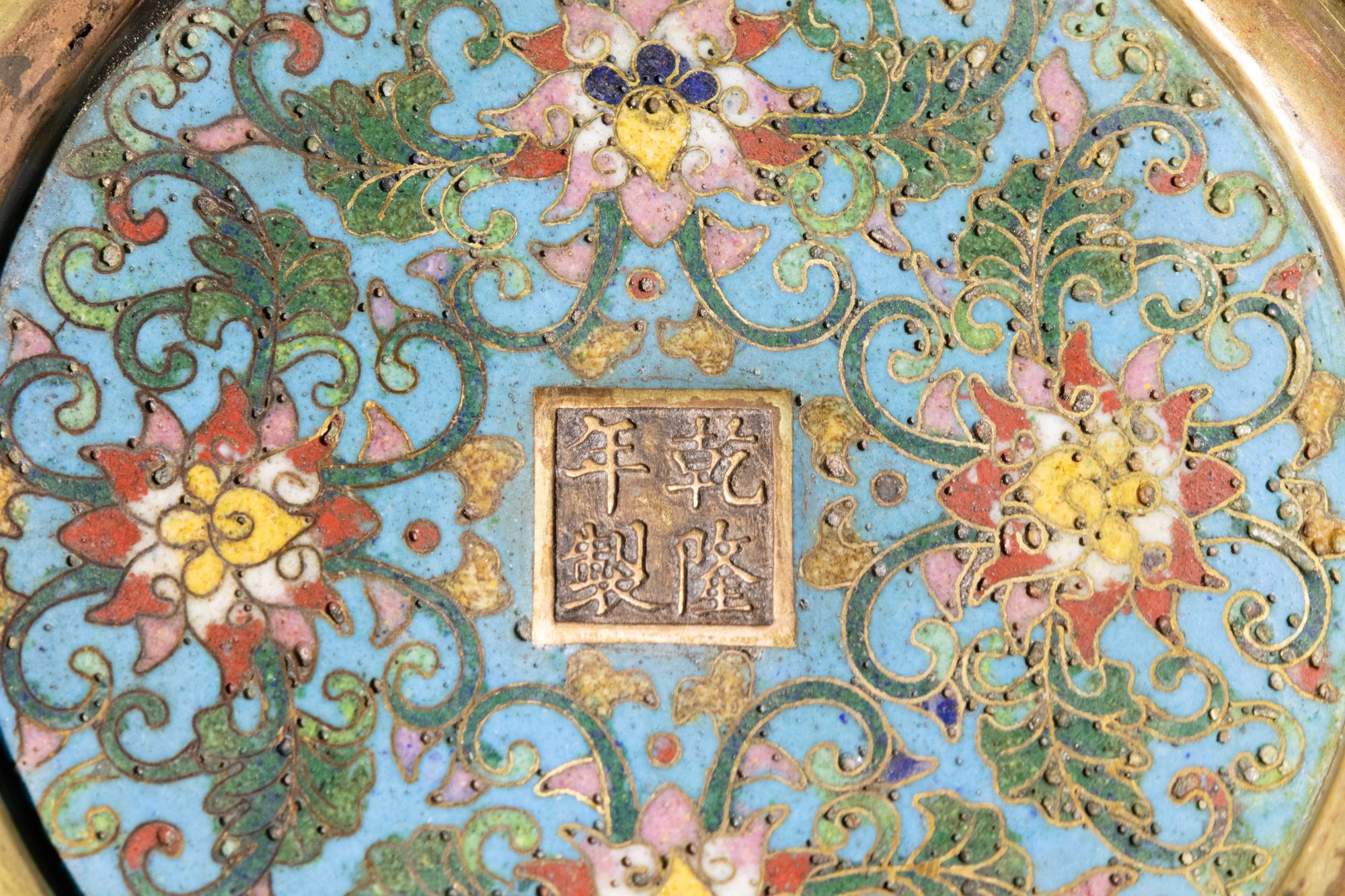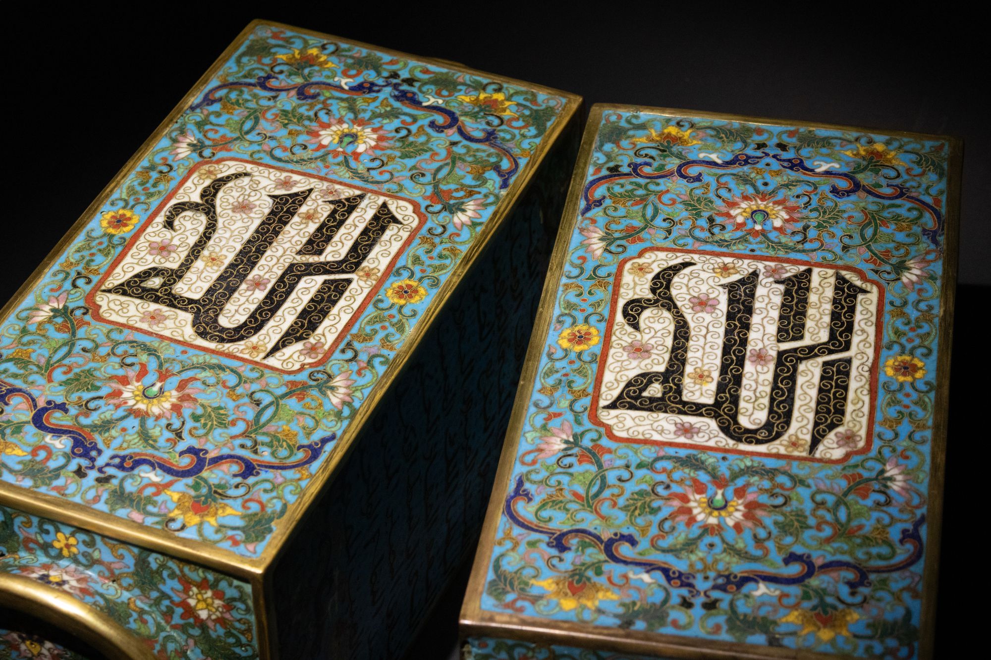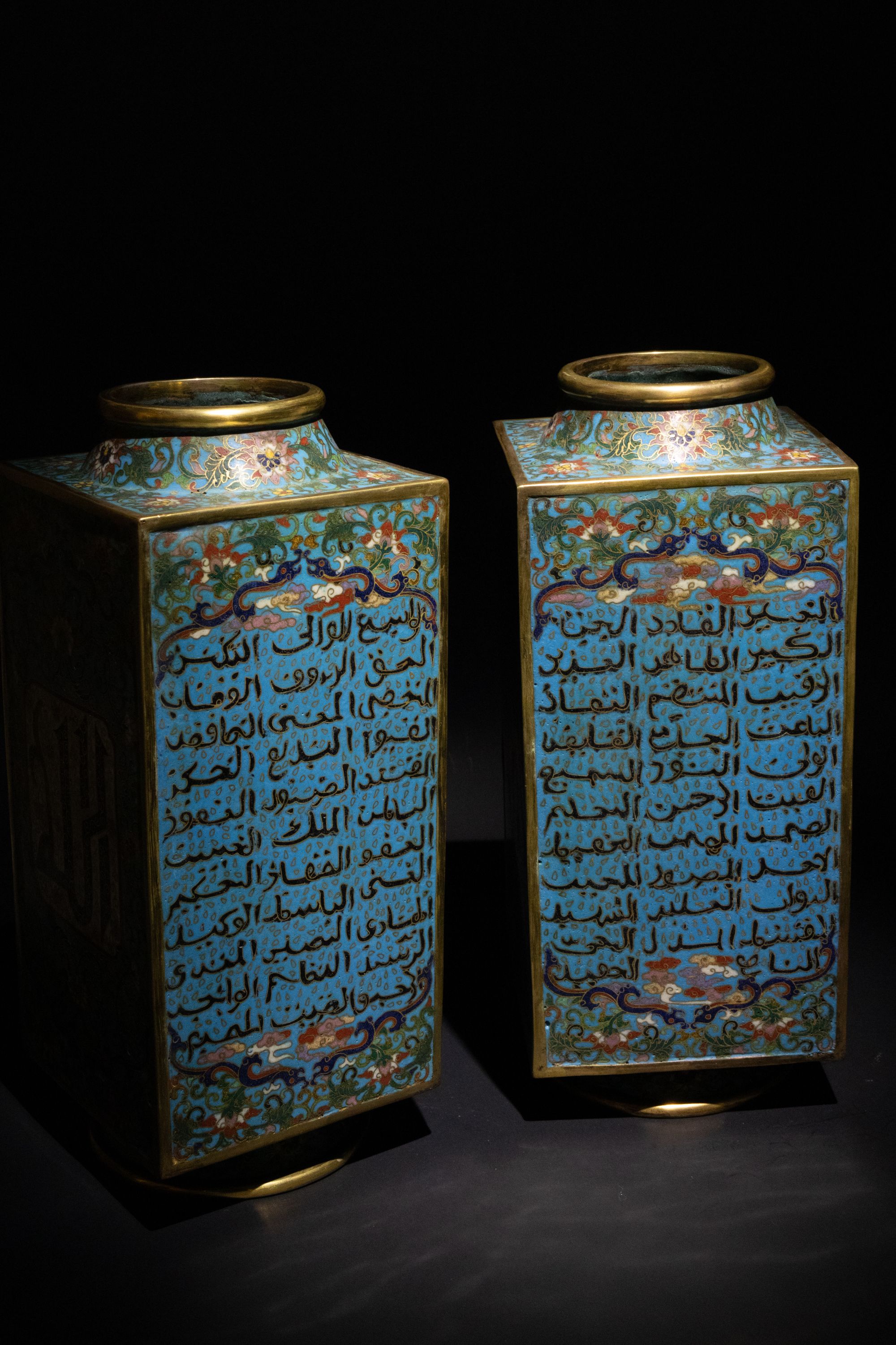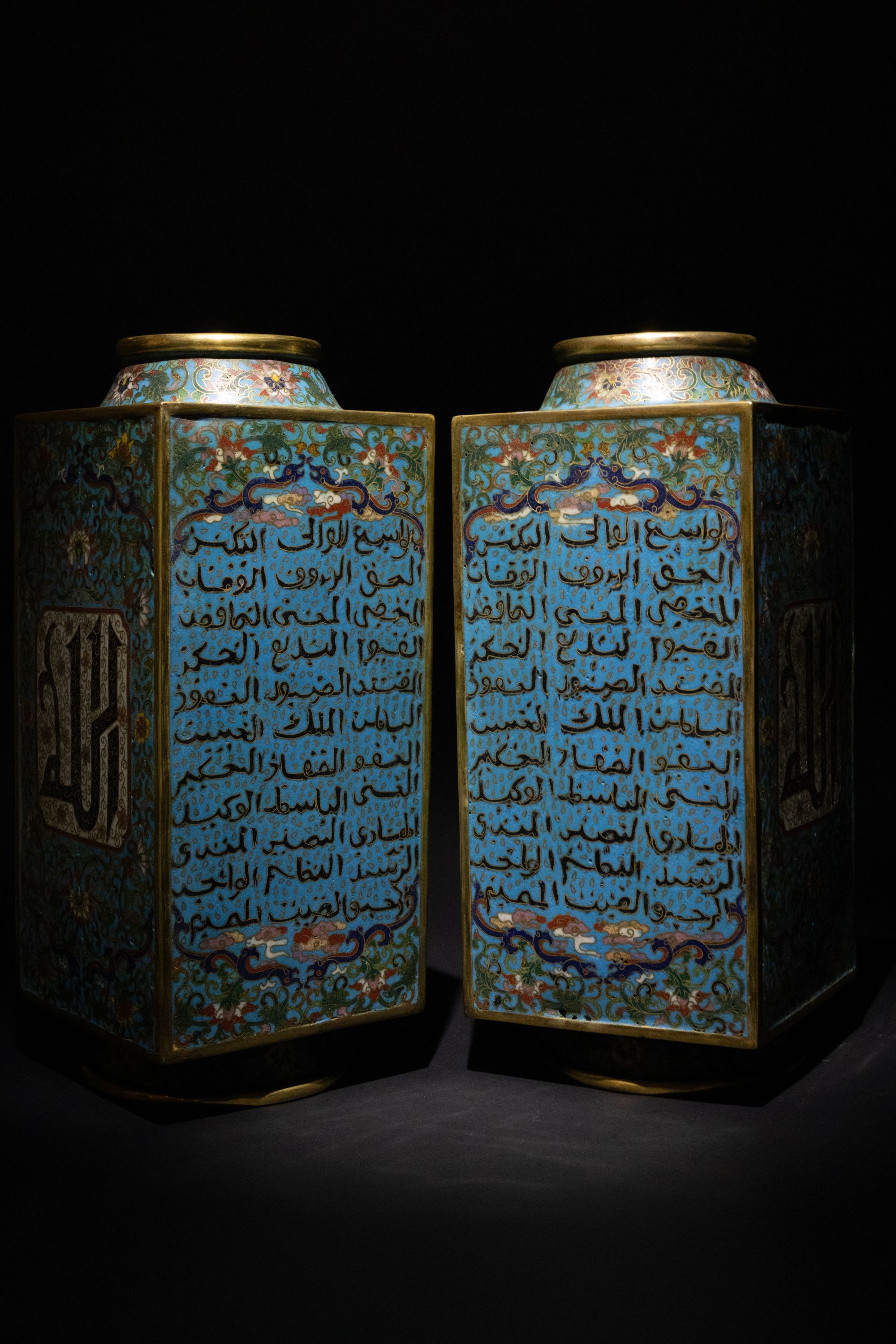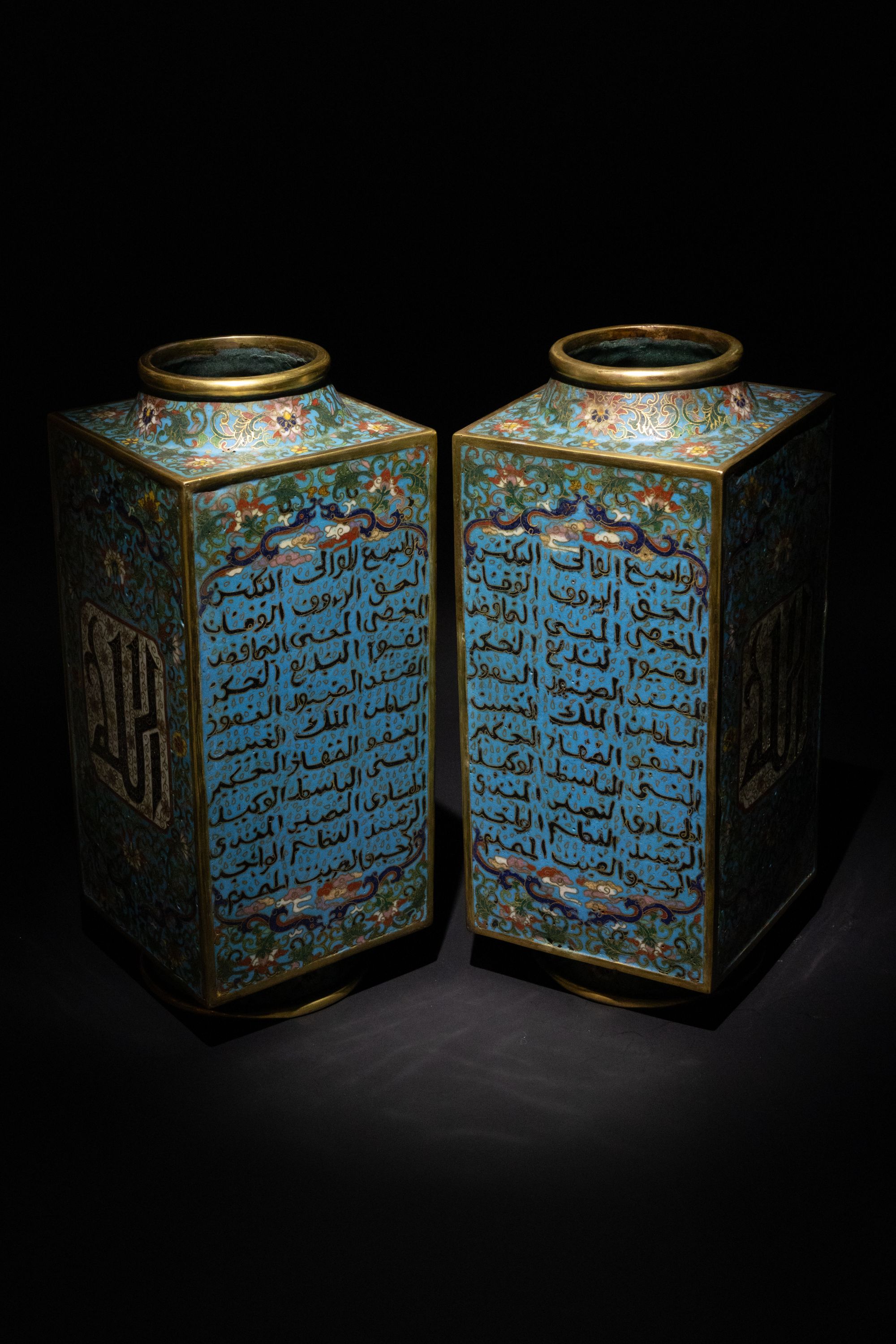 Each modeled after the archaic form, of square section raised on a broad circular foot and surmounted by a slightly waisted neck. Decorated with a large panel enclosing Allah in thuluth script, another side with a panel enclosing the names of Allah, all surrounded by lotus scrolling foliage and further blossoms on a turquoise ground.The bottom with a four Chinese Qianlong mark surrounded by four lotus heads with foliage. 31 by 13.5 by 13.5 cm