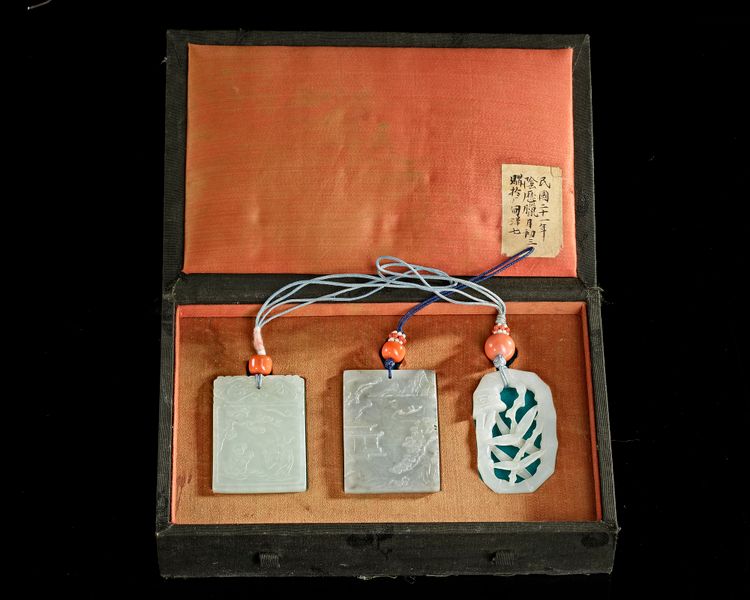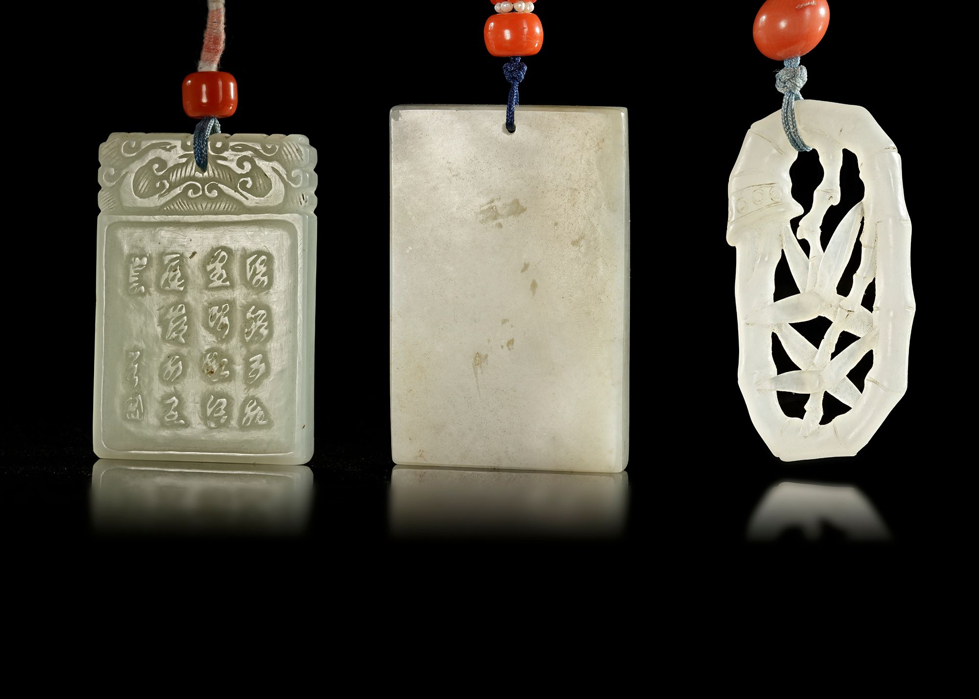 A Chinese rectangular jade pendant, carved to one side with an elegant scene of two figures in a garden setting under a tree. The top has an intricate scroll-like carving. The reverse carved with Chinese characters. 4 by 6 cm