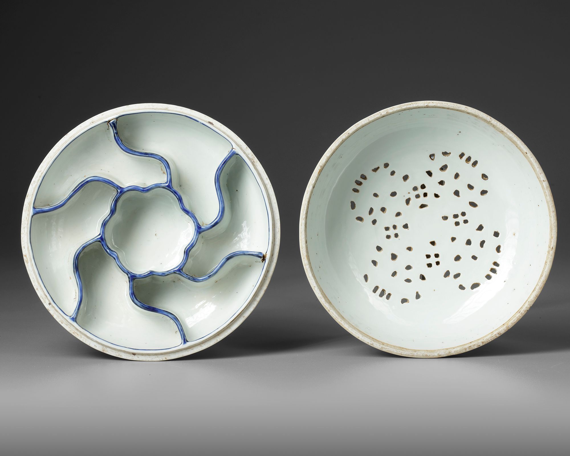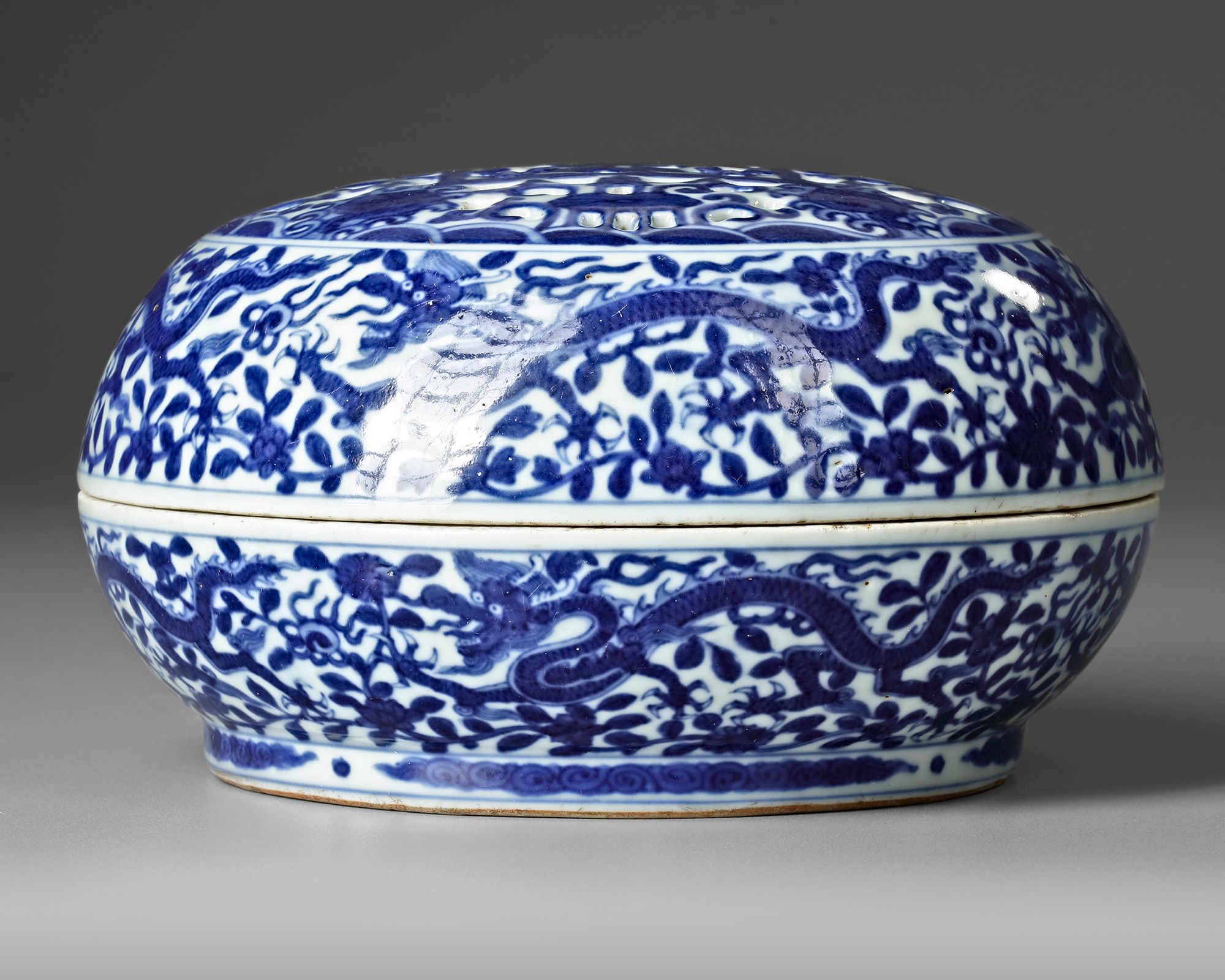 A Chinese porcelain circular box, the domed top is decorated with a central pierced roundel stylized in cobalt blue with flower and ruyi heads, on the sides decorated with five-clawed dragons chasing a flaming pearl amidst flower scrolls. The bottom with a Chinese Wanli six character mark. Diameter: 21 cm Height: 10.5 cm