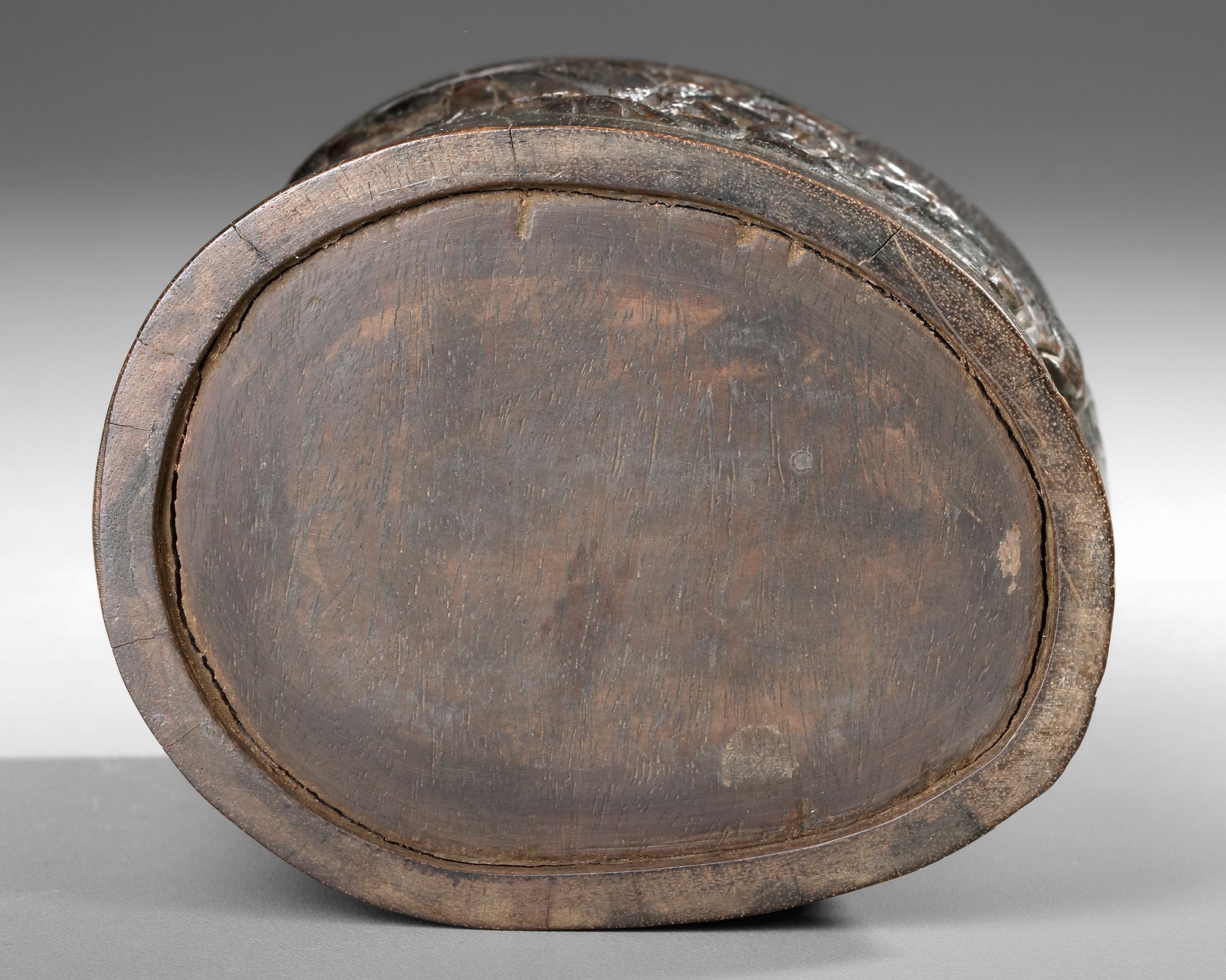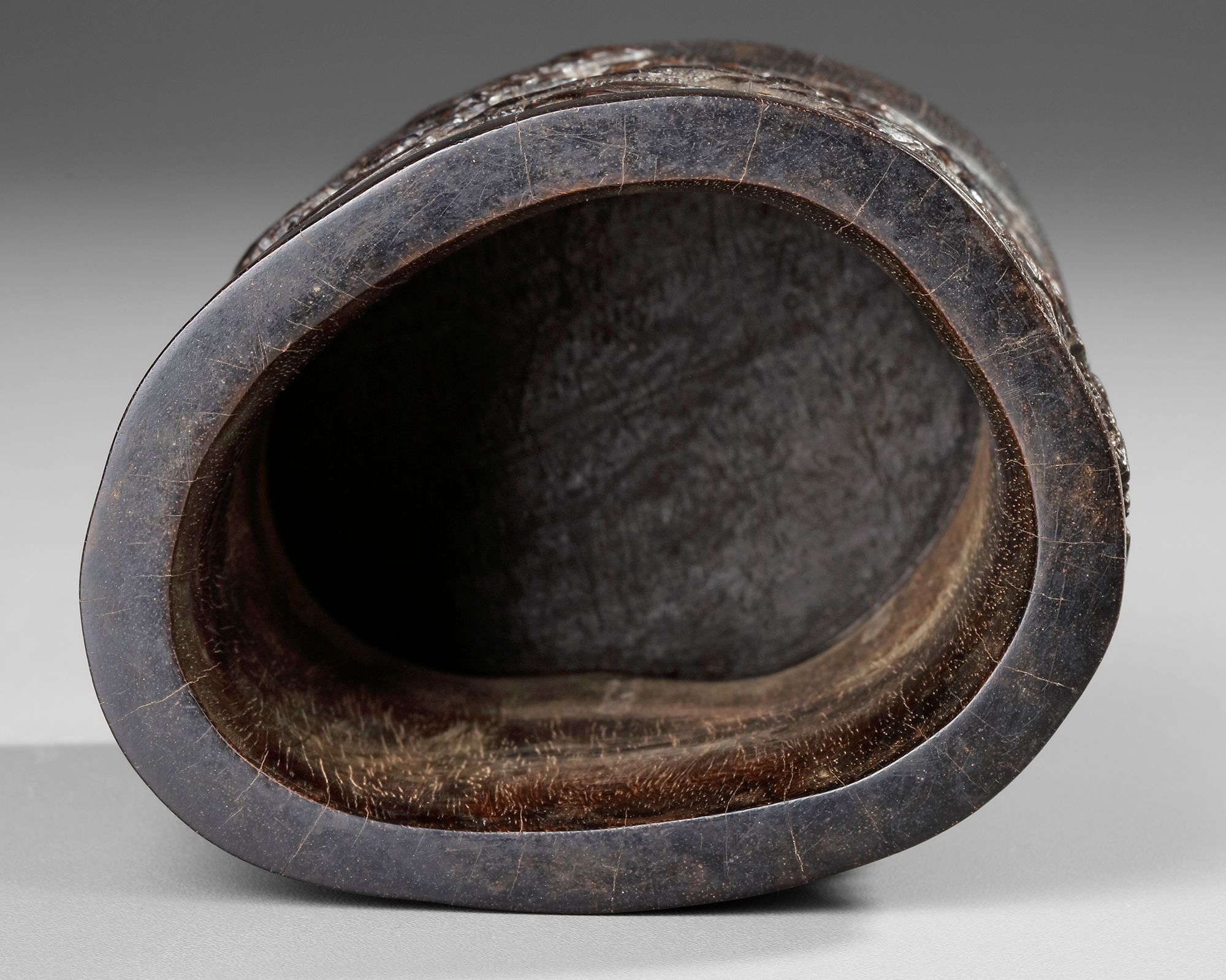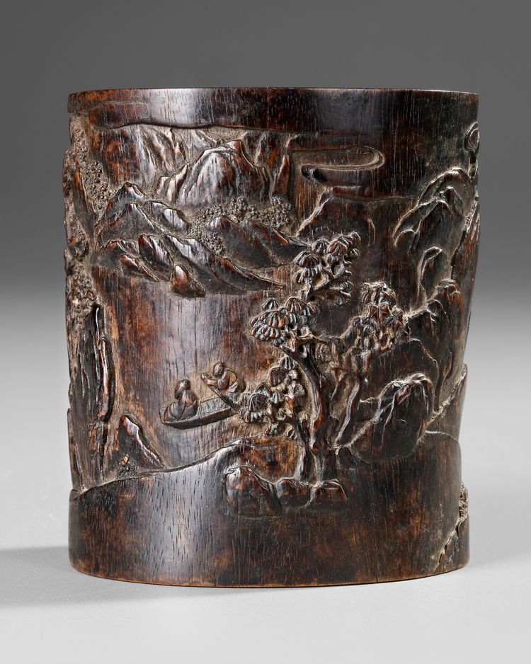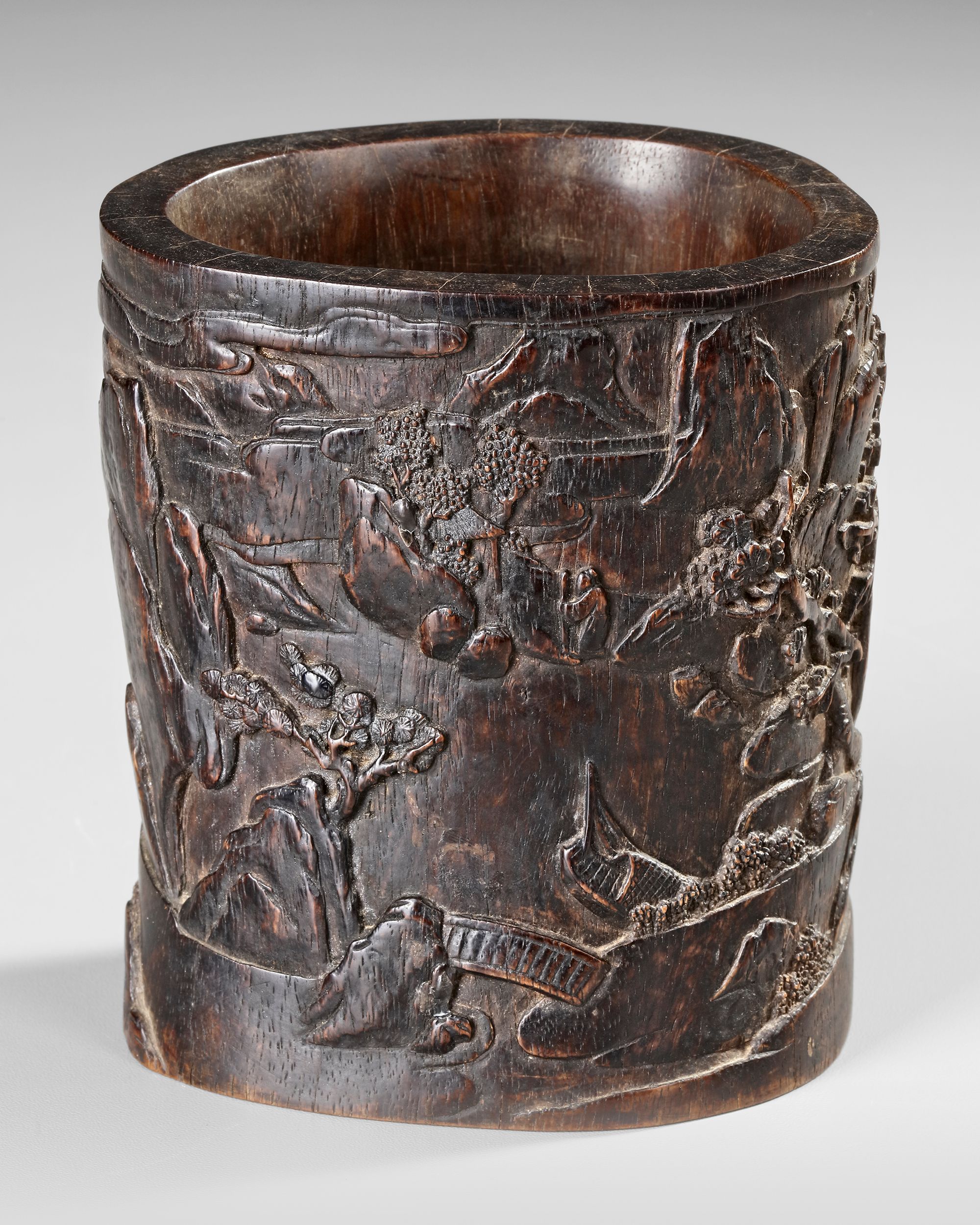 A Chinese zitan wooden brush pot, carved around the body with figures under pine trees in a riverine mountainous landscape. Height: 12 cm.