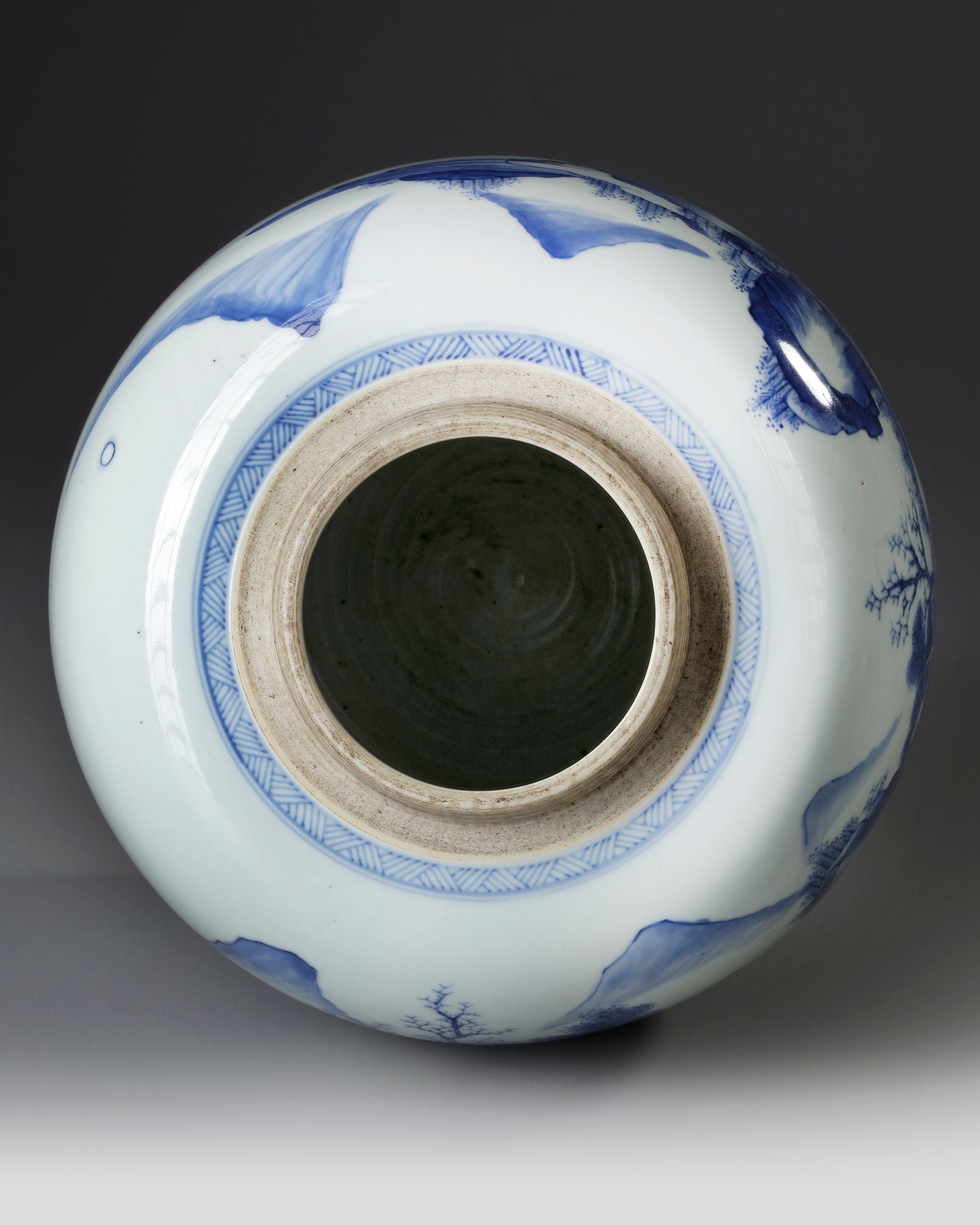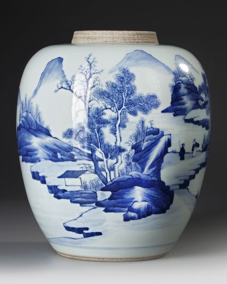 A Chinese porcelain ginger jar, decorated with figures and pavilions under pine trees in a mountainous landscape with mountain peaks in the background.