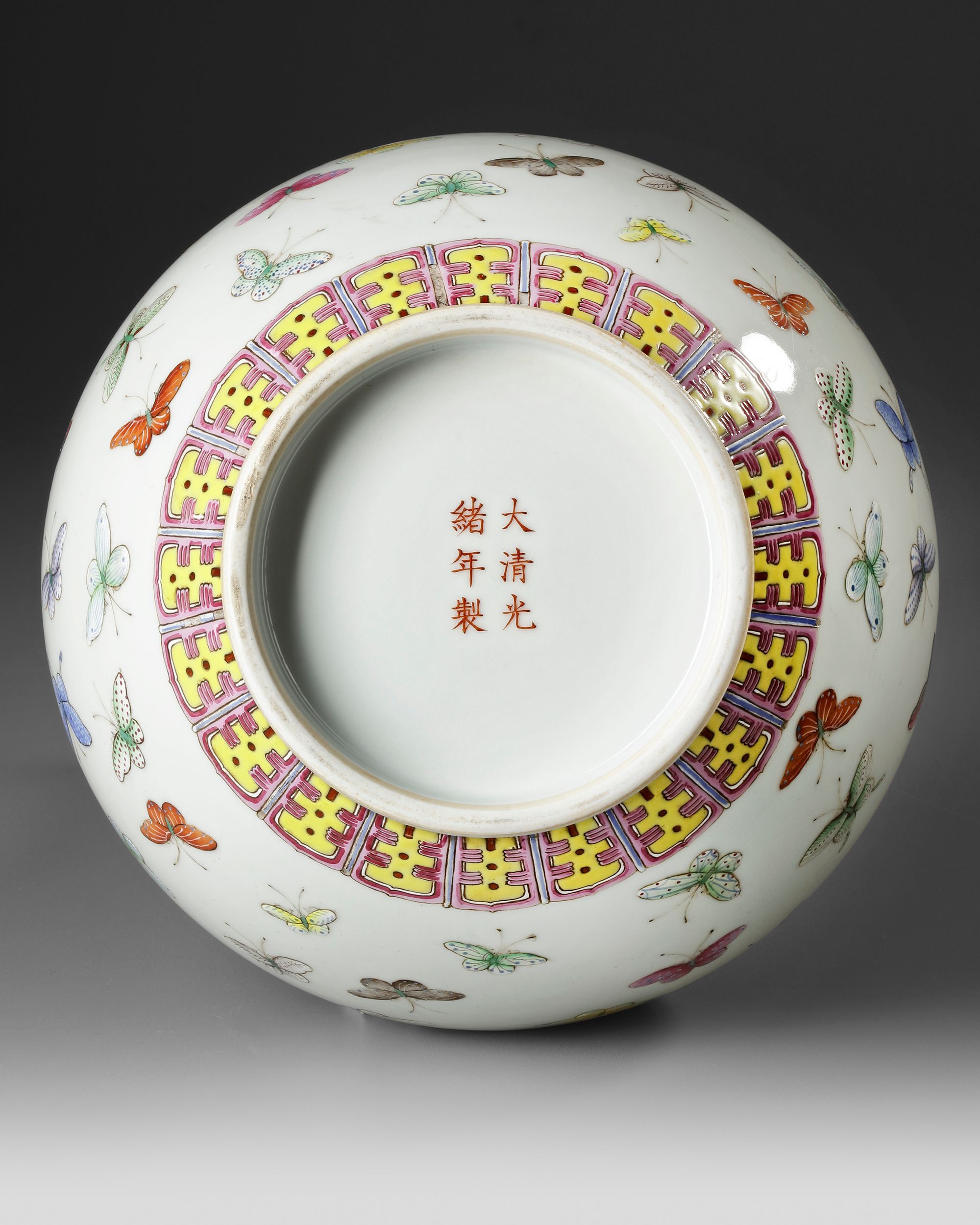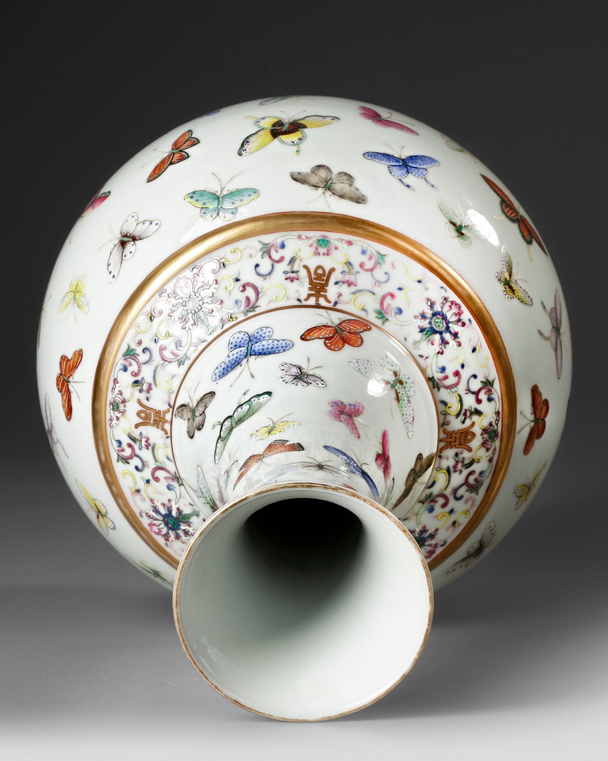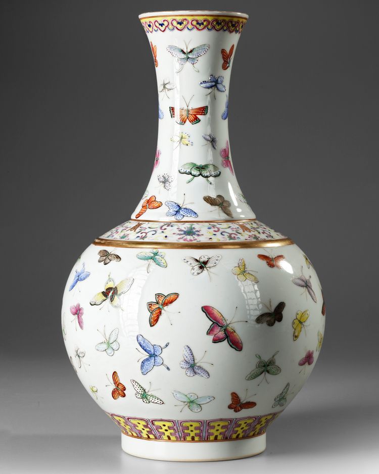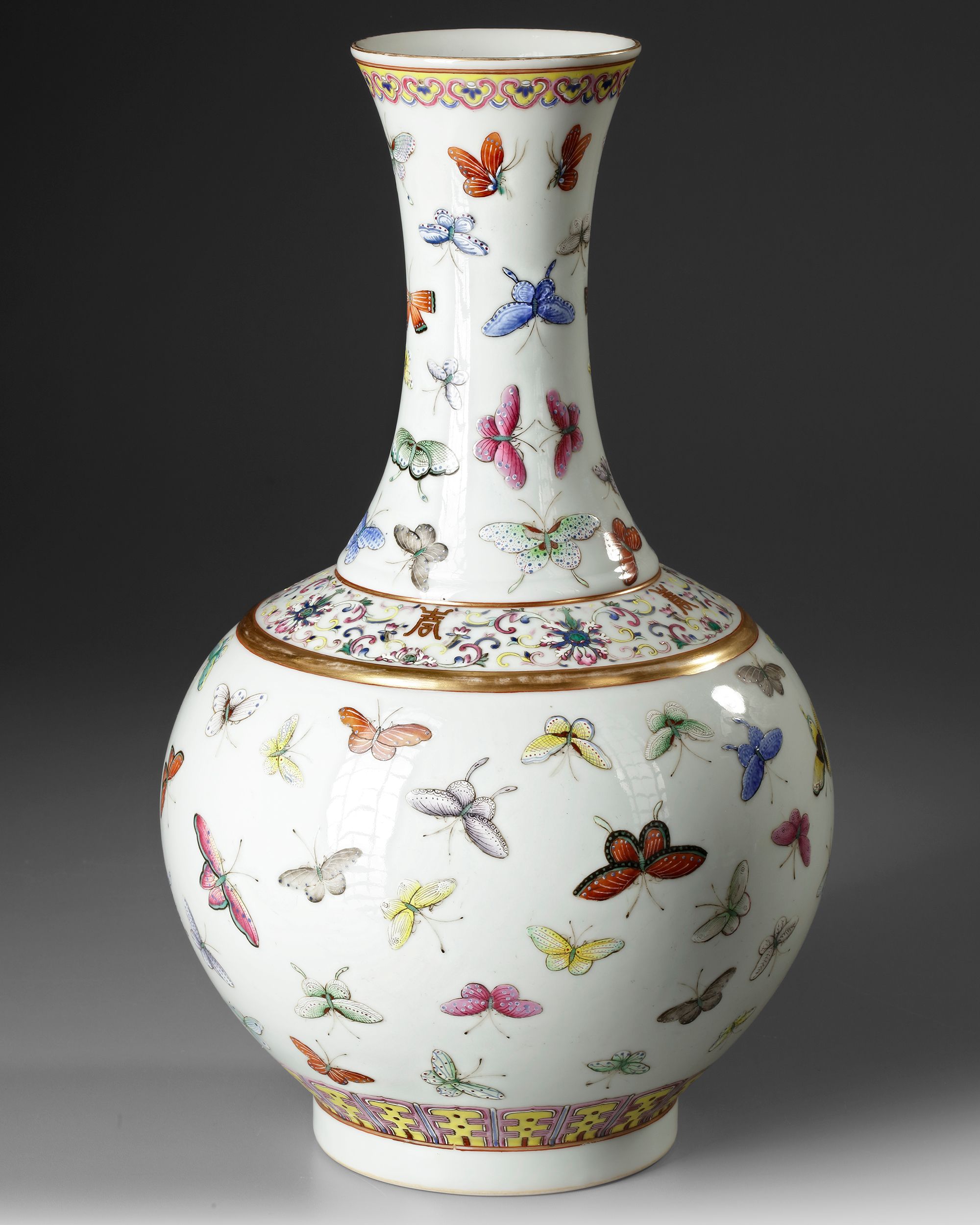 A Chinese porcelain bottle vase, enamelled and gilt with dainty butterflies scattered over the bulbous body above stiff lappets at the foot and below a band containing four gilt shou characters alternating with lotus amid foliate scrolls at the shoulder, the neck similarly decorated with butterflies beneath a band of ruyi-head at the rim. The bottom with a Chinese Guangxu six character mark.