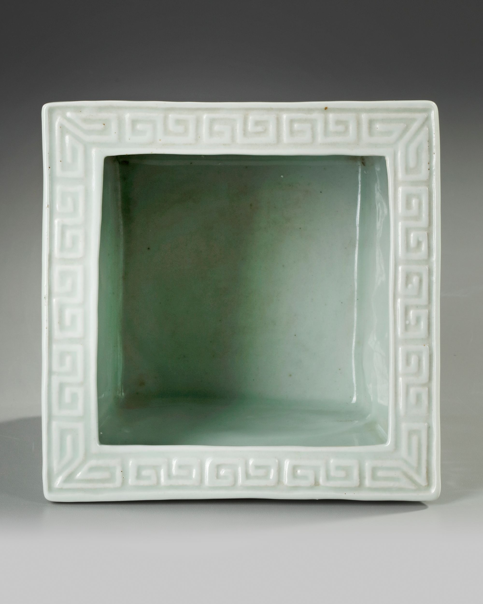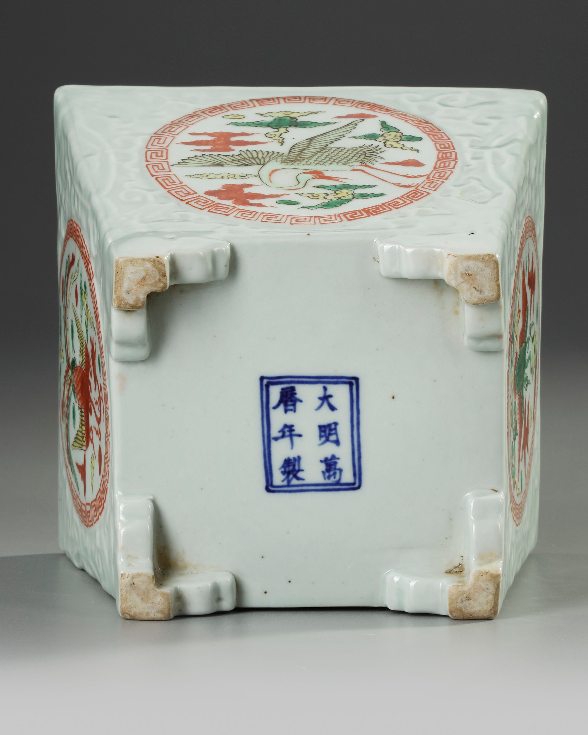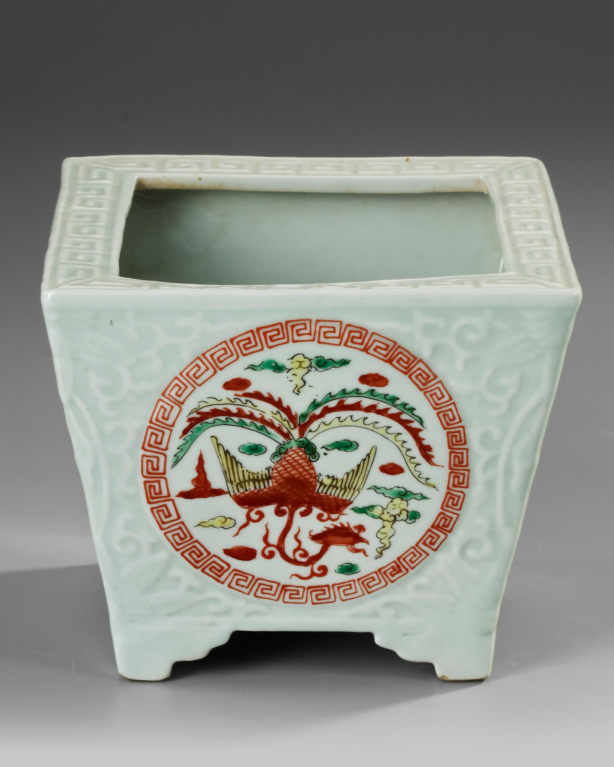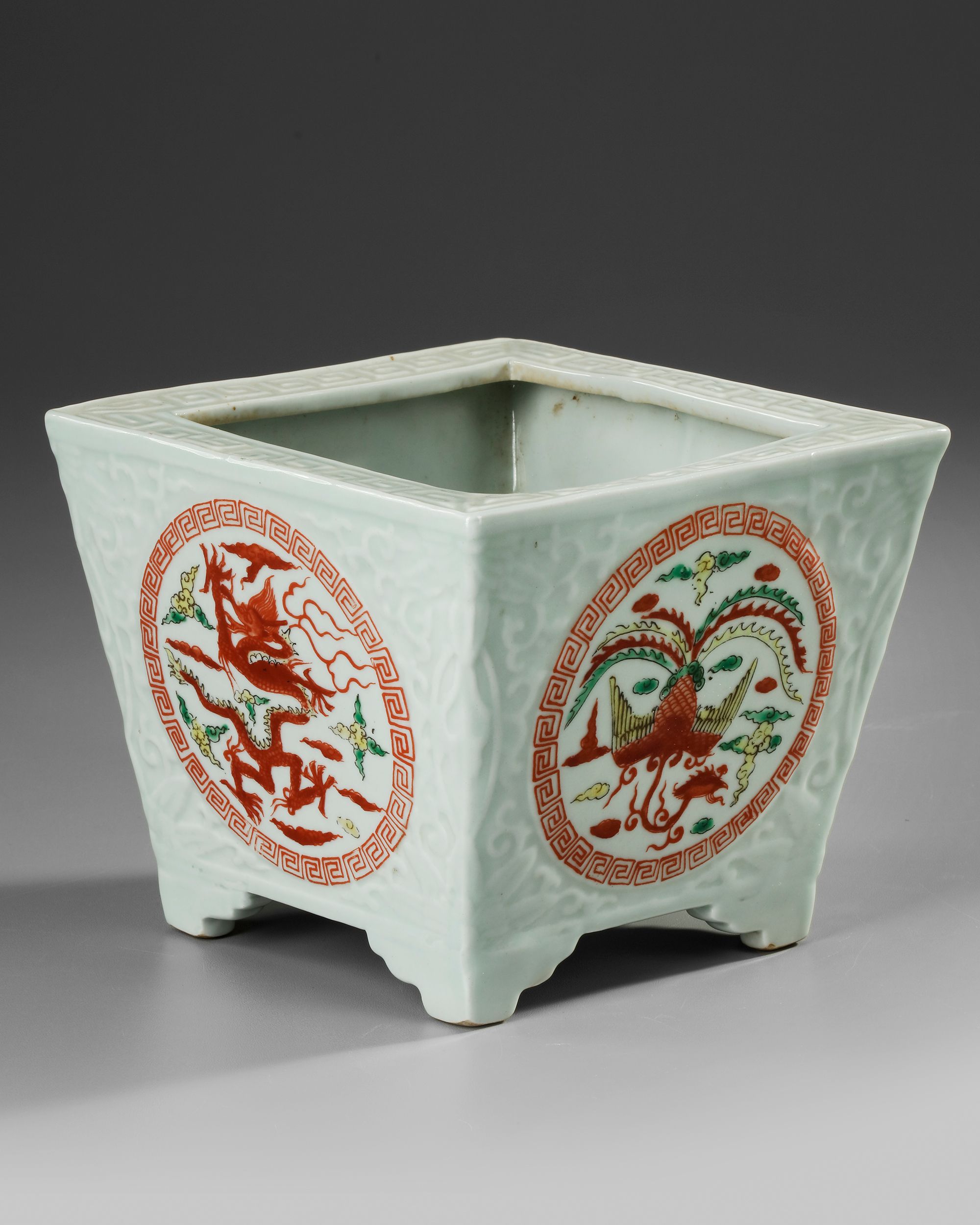 A Chinese porcelain incense burner, resting on tapering feet, decorated on each side with a roundel of key-fret chain enclosing a dragon, cranes, or a phoenix amidst clouds, all on a celadon ground adorned with a floral design in low relief. The bottom bears a Chinese Wanli six character mark.