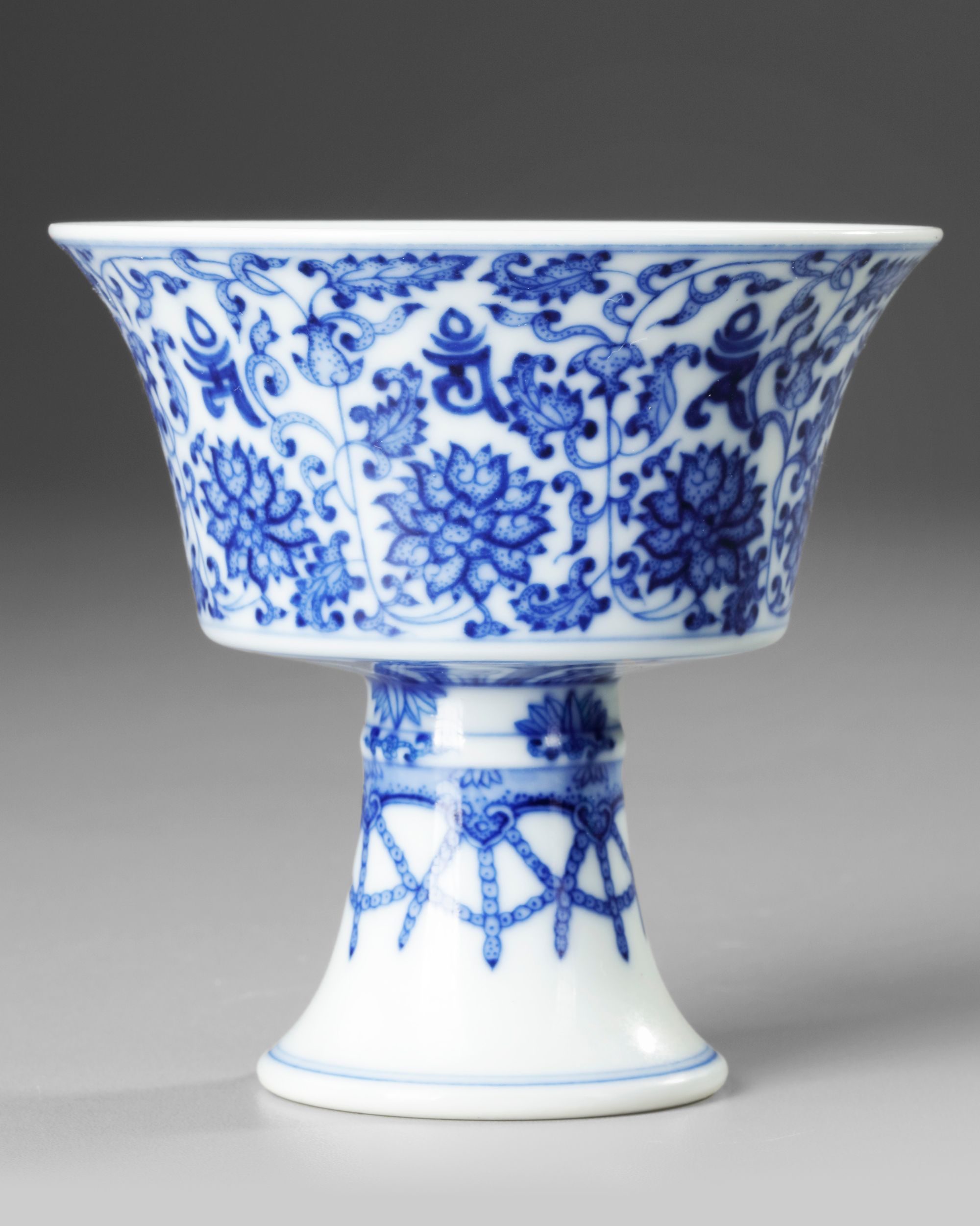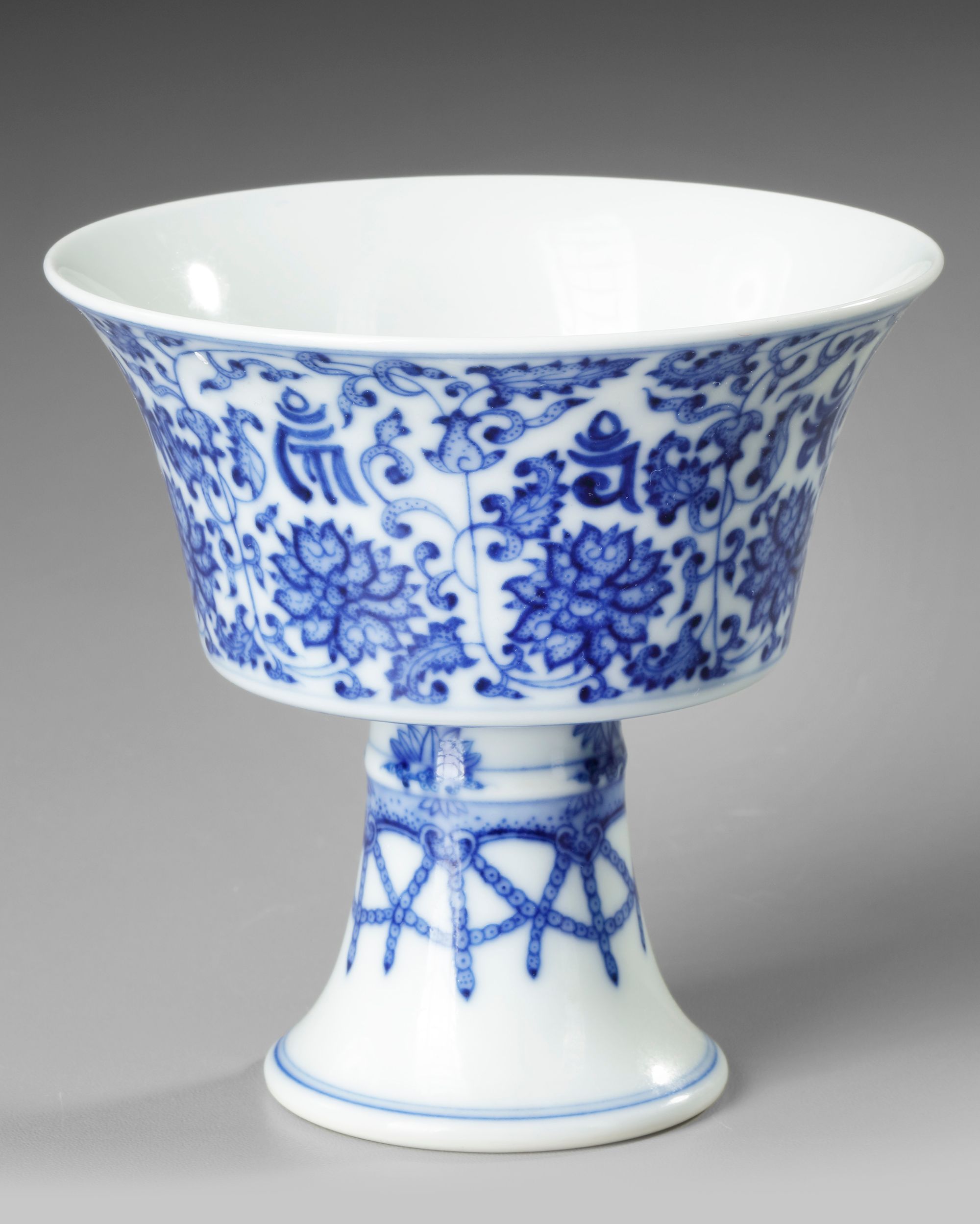 Painted around the steep flaring sides with eight lança characters enclosed within undulating lotus stems issuing stylised blossoms and acanthus leaves, the underside with a frieze of tightly-bound lotus lappets, all raised on a tall spreading stem decorated with bands of half-flowerheads and floral sprays on a raised rib above pendent interlinked tassels issuing from ruyi-heads, the interior with a stylised peony medallion within a double-line border, the interior of the foot with a Chinese Yongzheng six character mark.