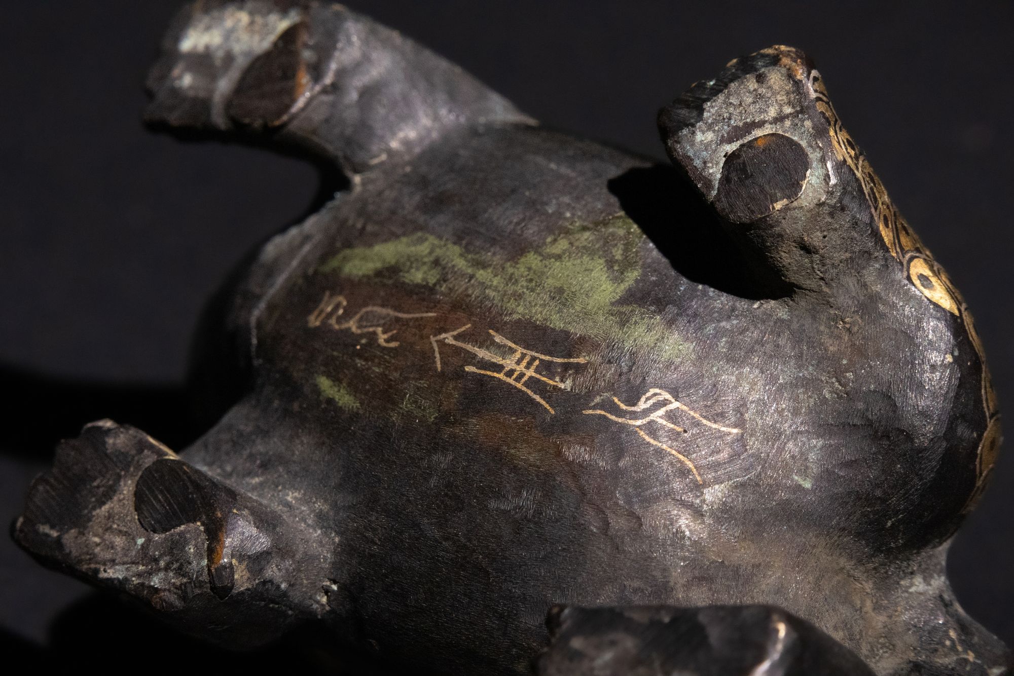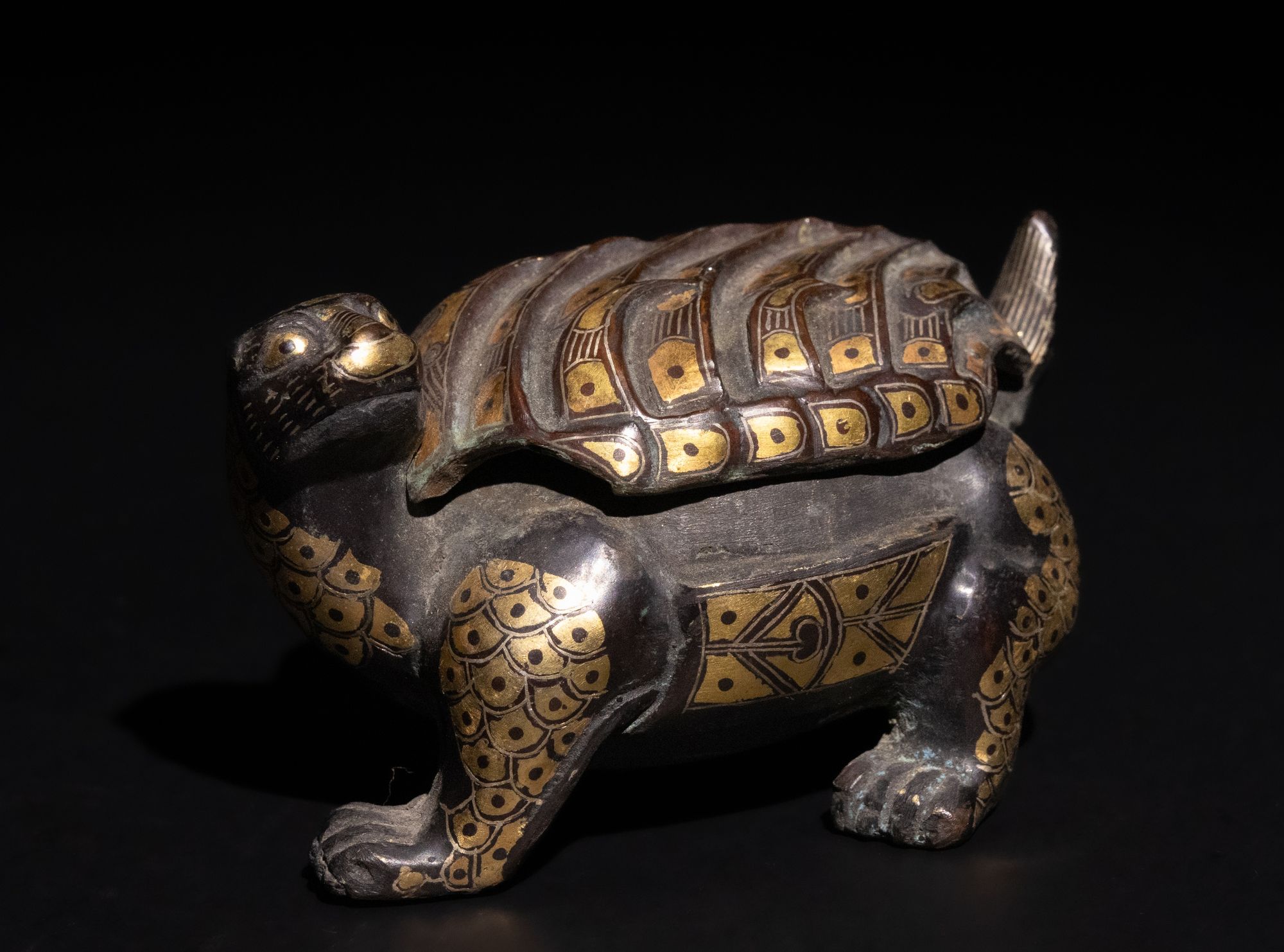 A Chinese Bronze Tortoise Container,Han Dynasty or later. This Chinese bronze container is intricately designed in the form of a tortoise, featuring detailed gold patterns across its body and shell. The tortoise's removable shell serves as a lid, revealing a hollow interior.