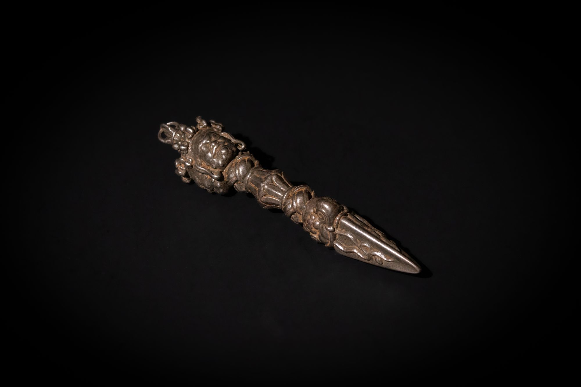 A Tibetan buddhist iron Mahakala Vajra dagger, depicting 3 faces on the handle. Length approximately 15 cm.