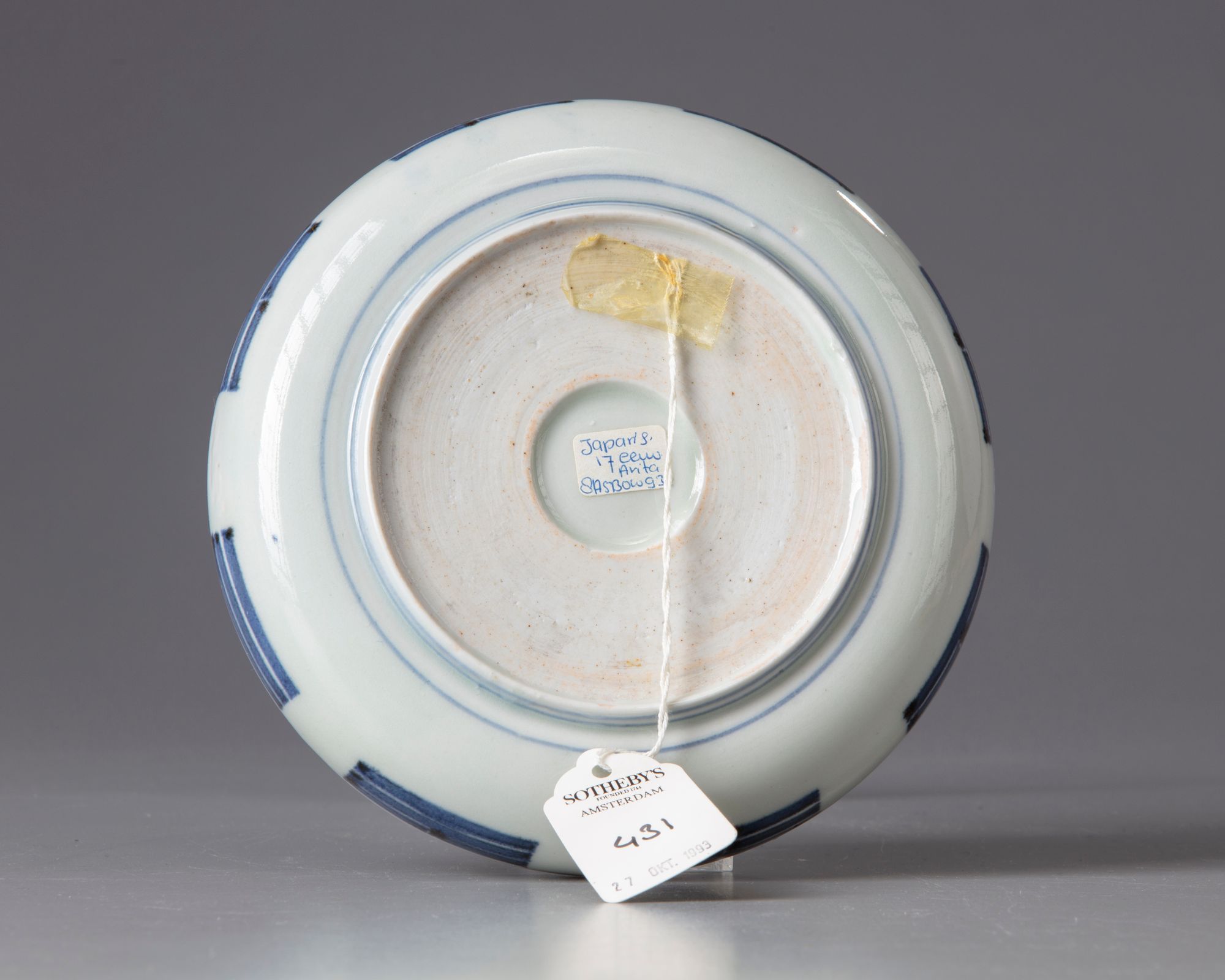 The dish is decorated to the centre with two figures in a room with thick stripes to the sides. Diameter: 14.5 cm.