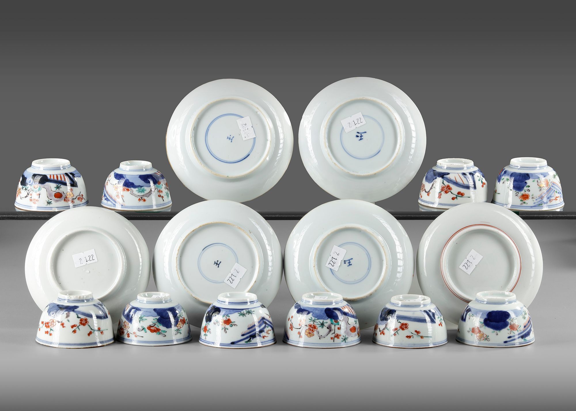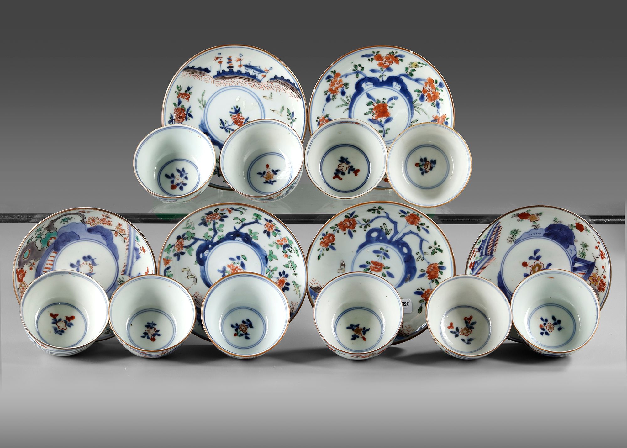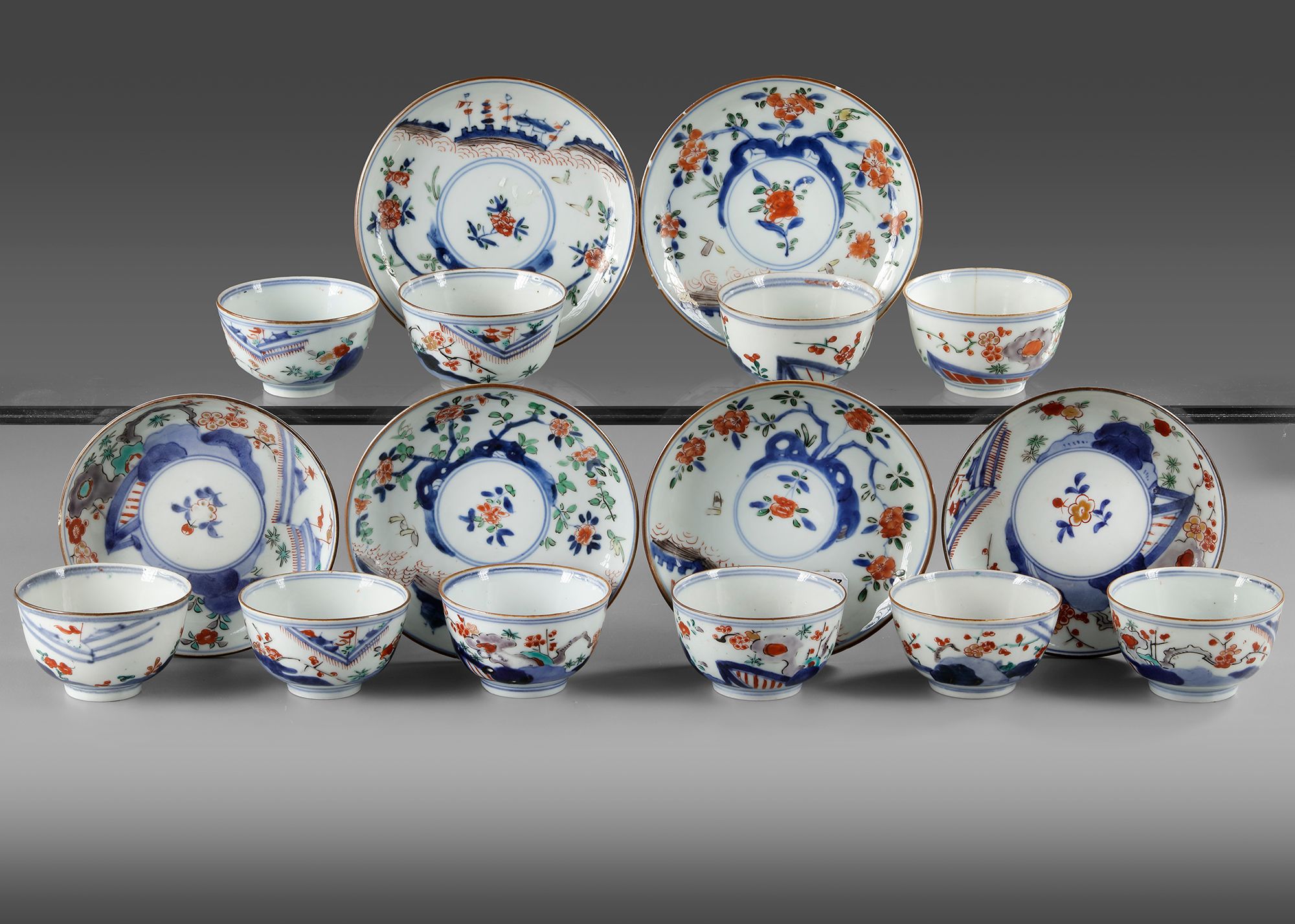 Six saucers and ten Imari cups, decorated with various flowers. cups: 4.50 cm. High Saucers 12.50 cm. Diam.