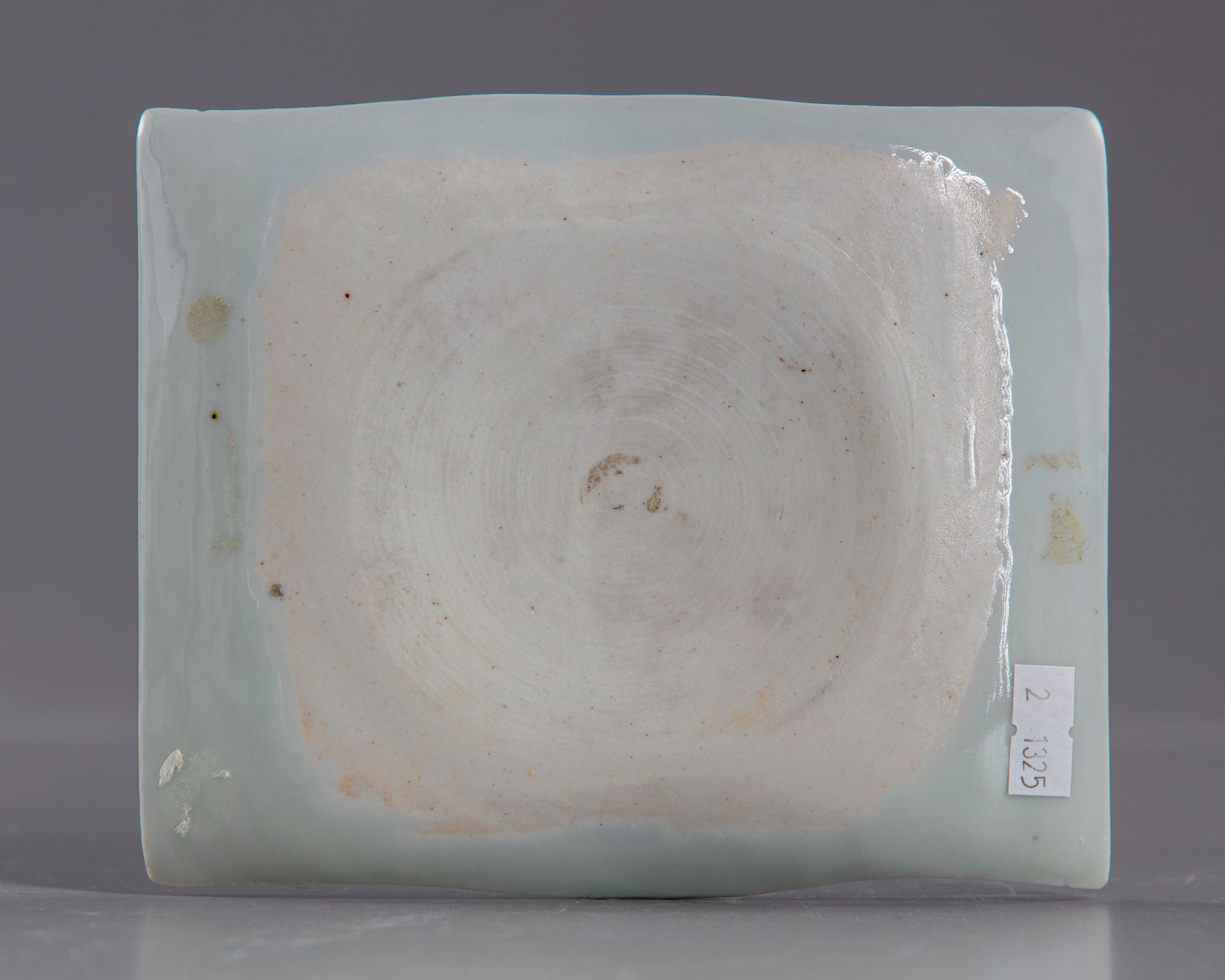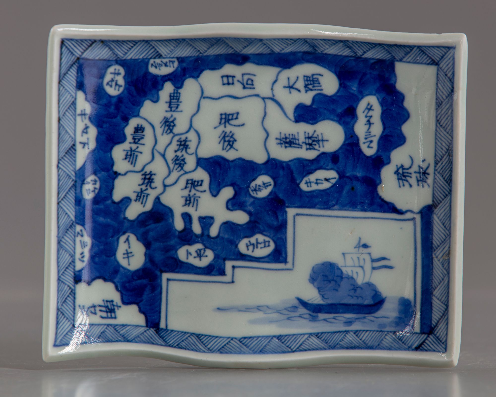 A Japanese blue and white rectangular saucer derated with a map of islands and a ship. 15 by 13.5 cm