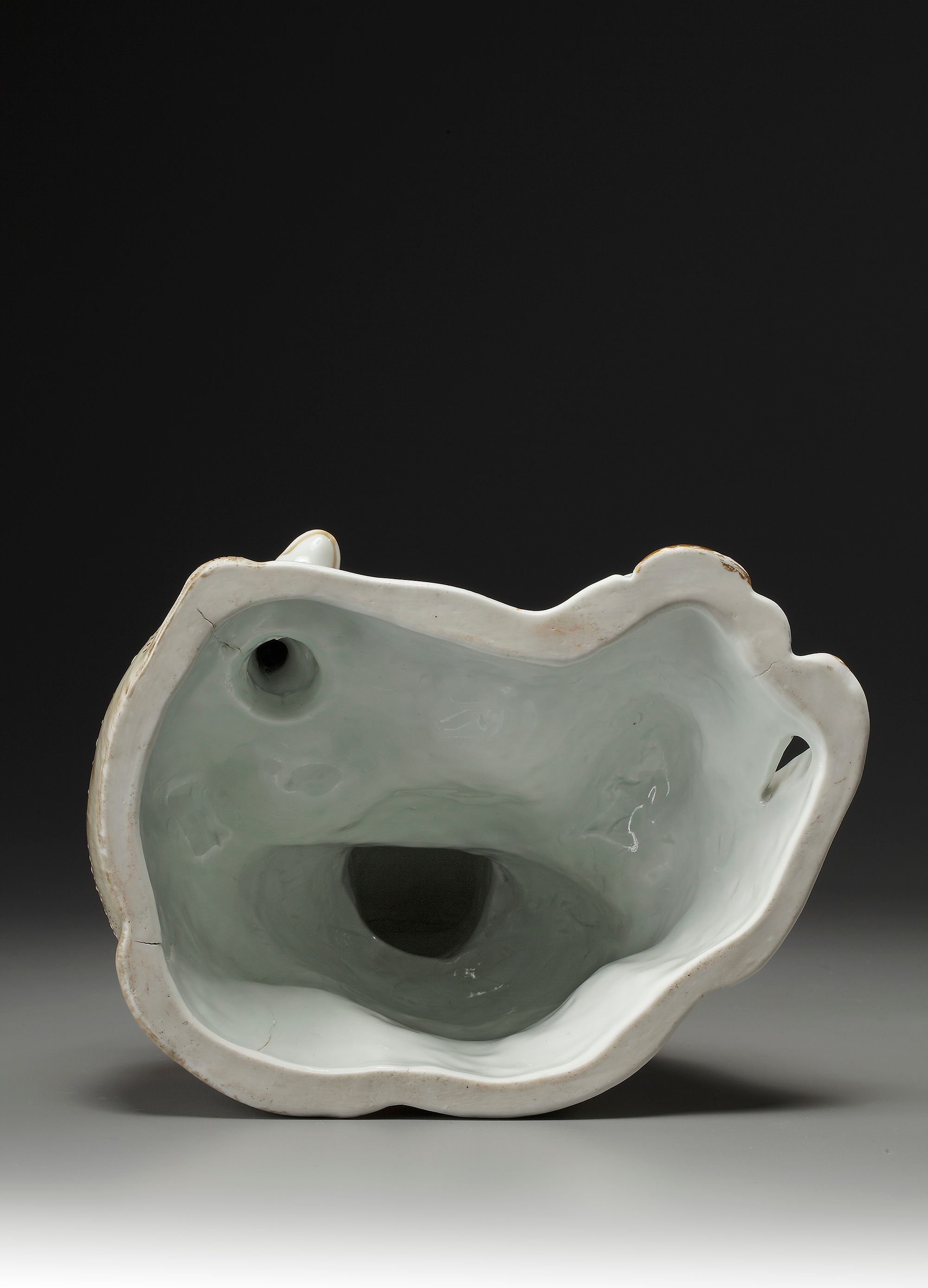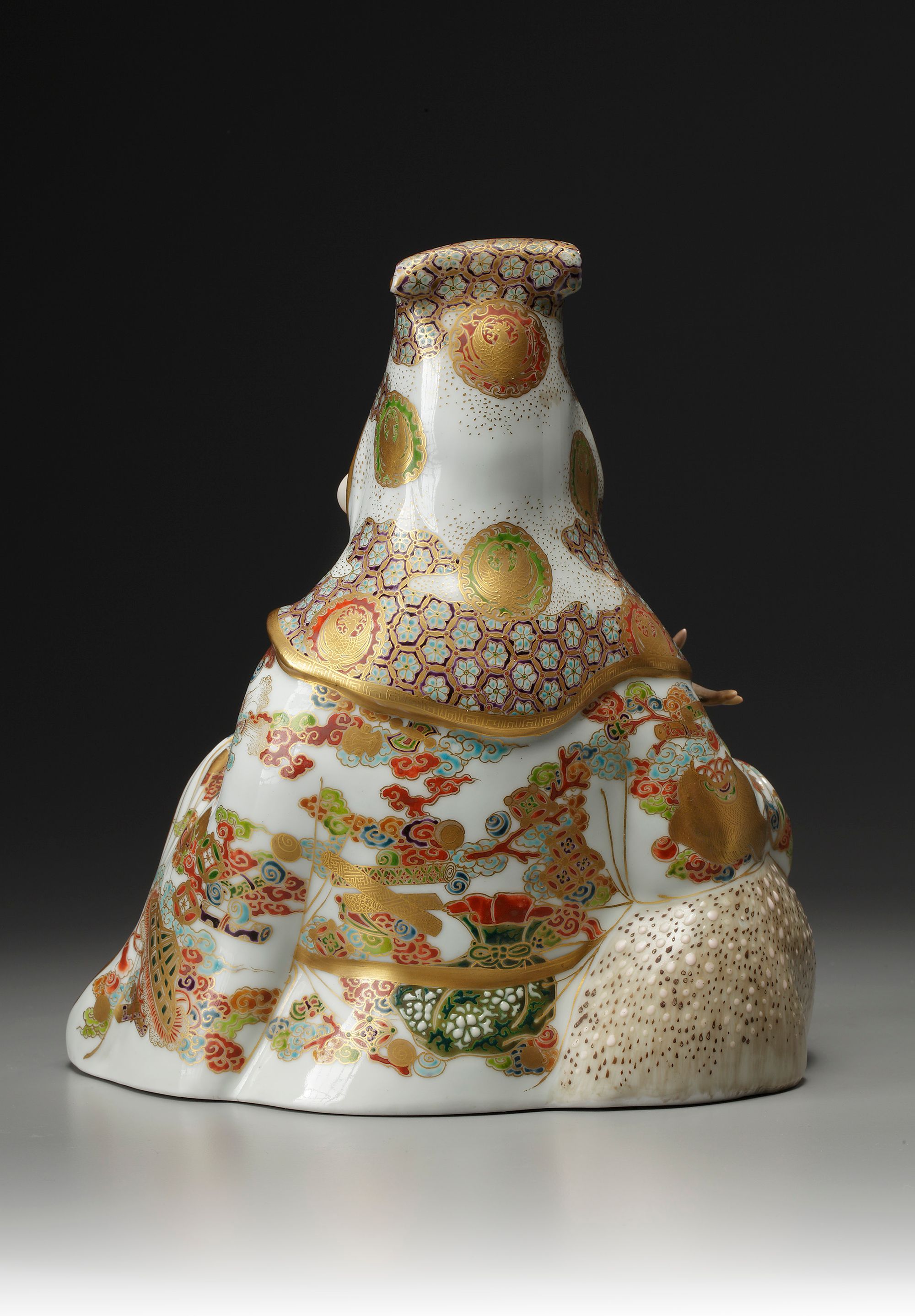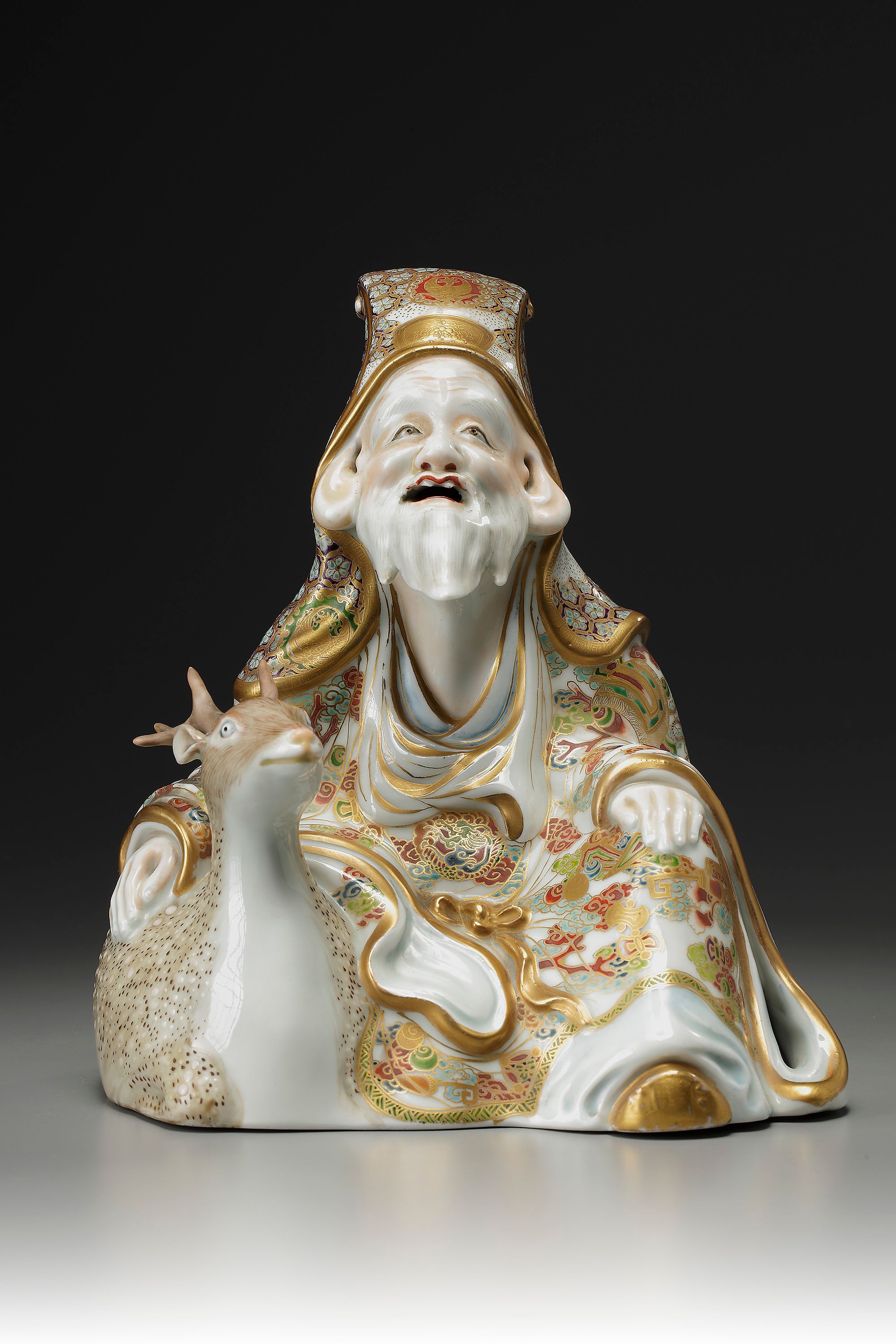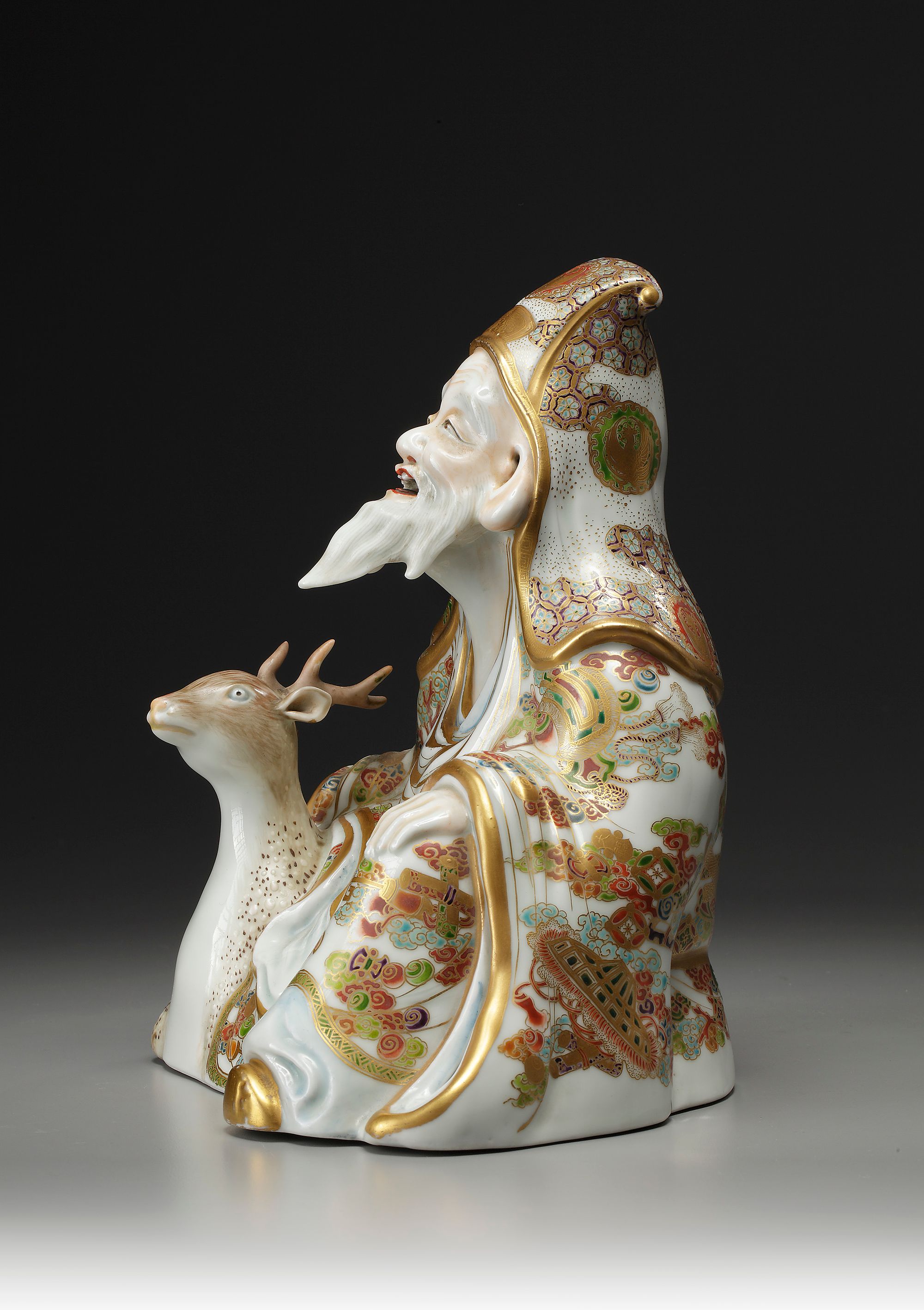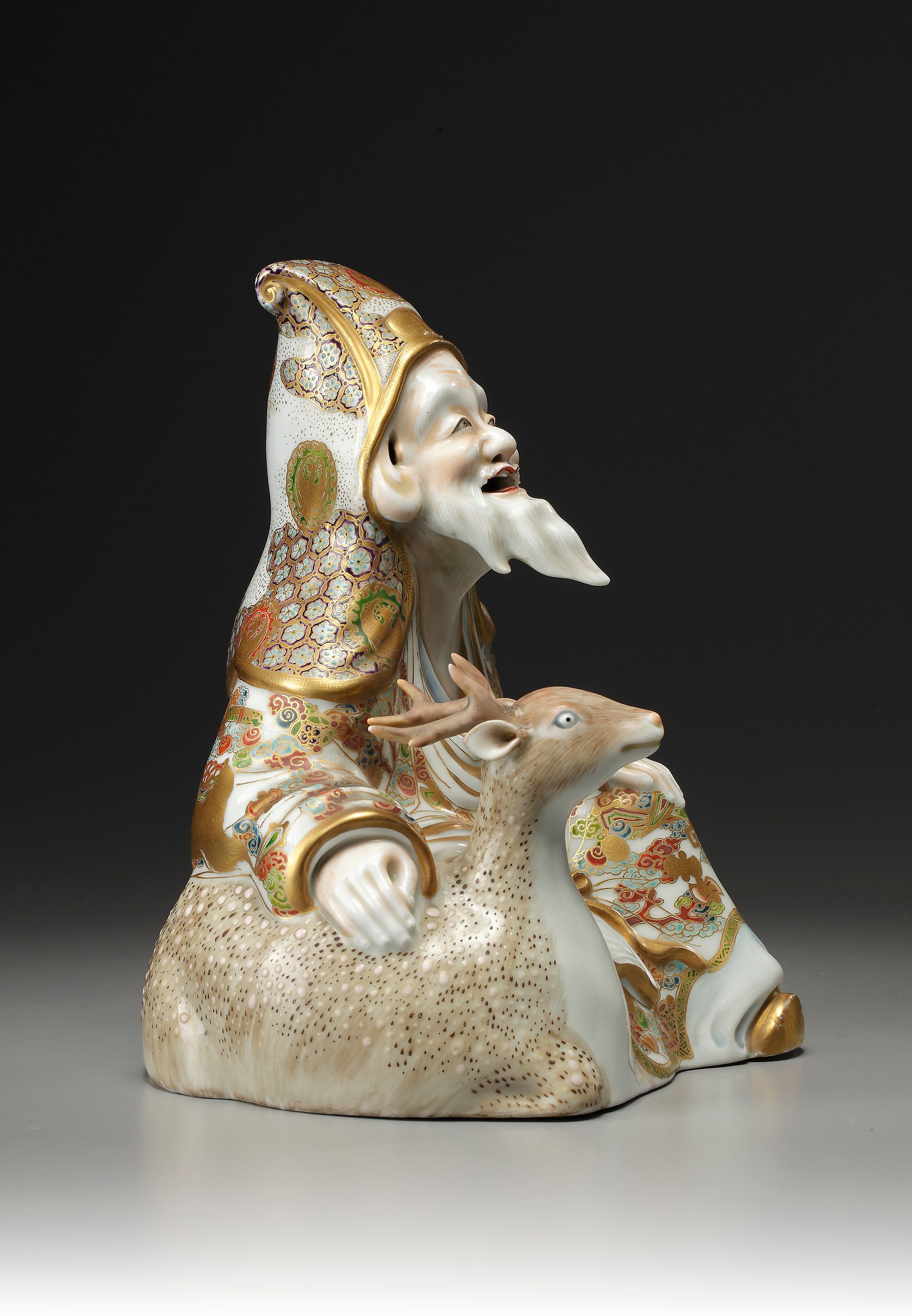 Japanese Satsuma figure of a seated Jurojin (one of the seven lucky gods) and a deer. Height 22 cm.