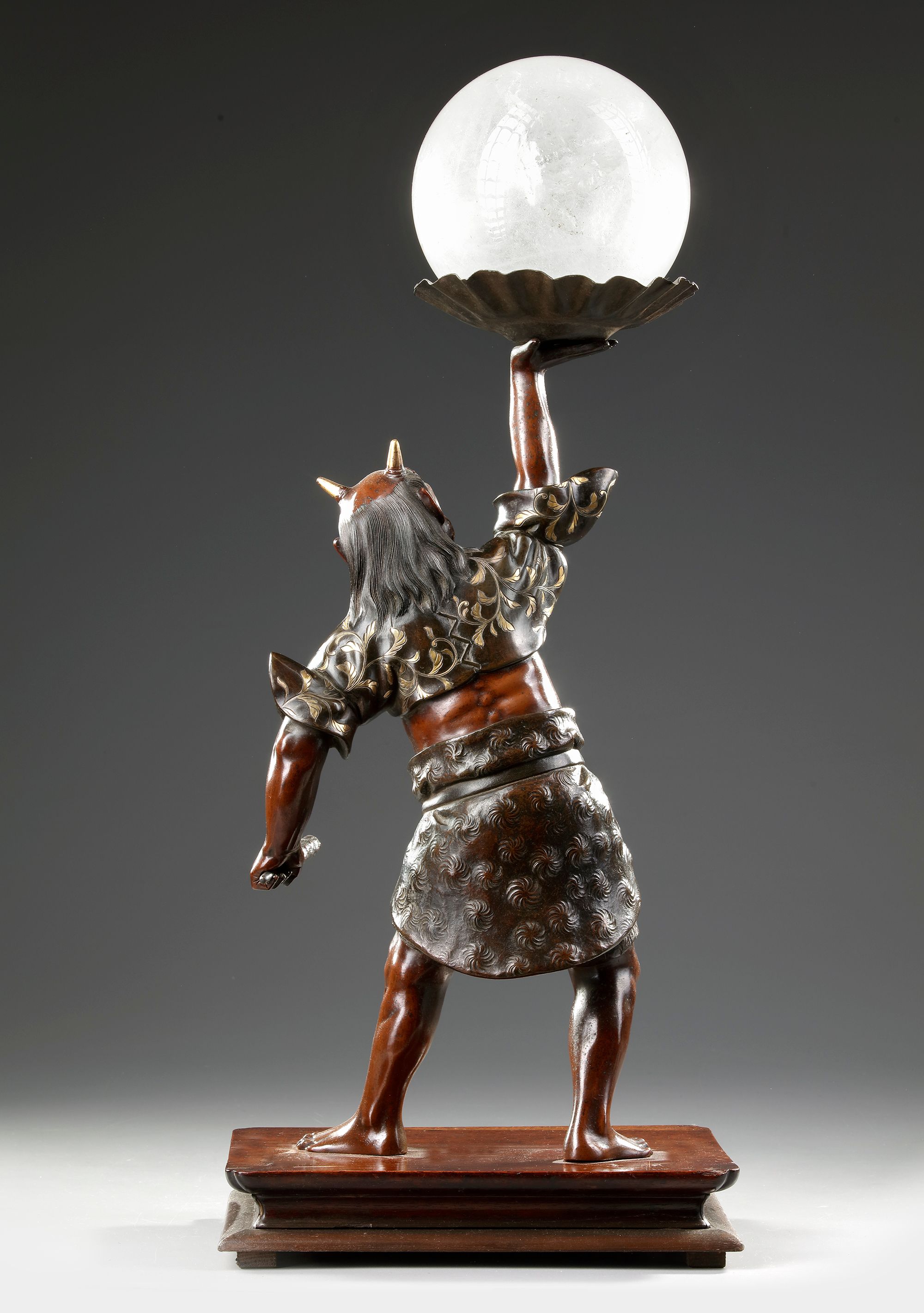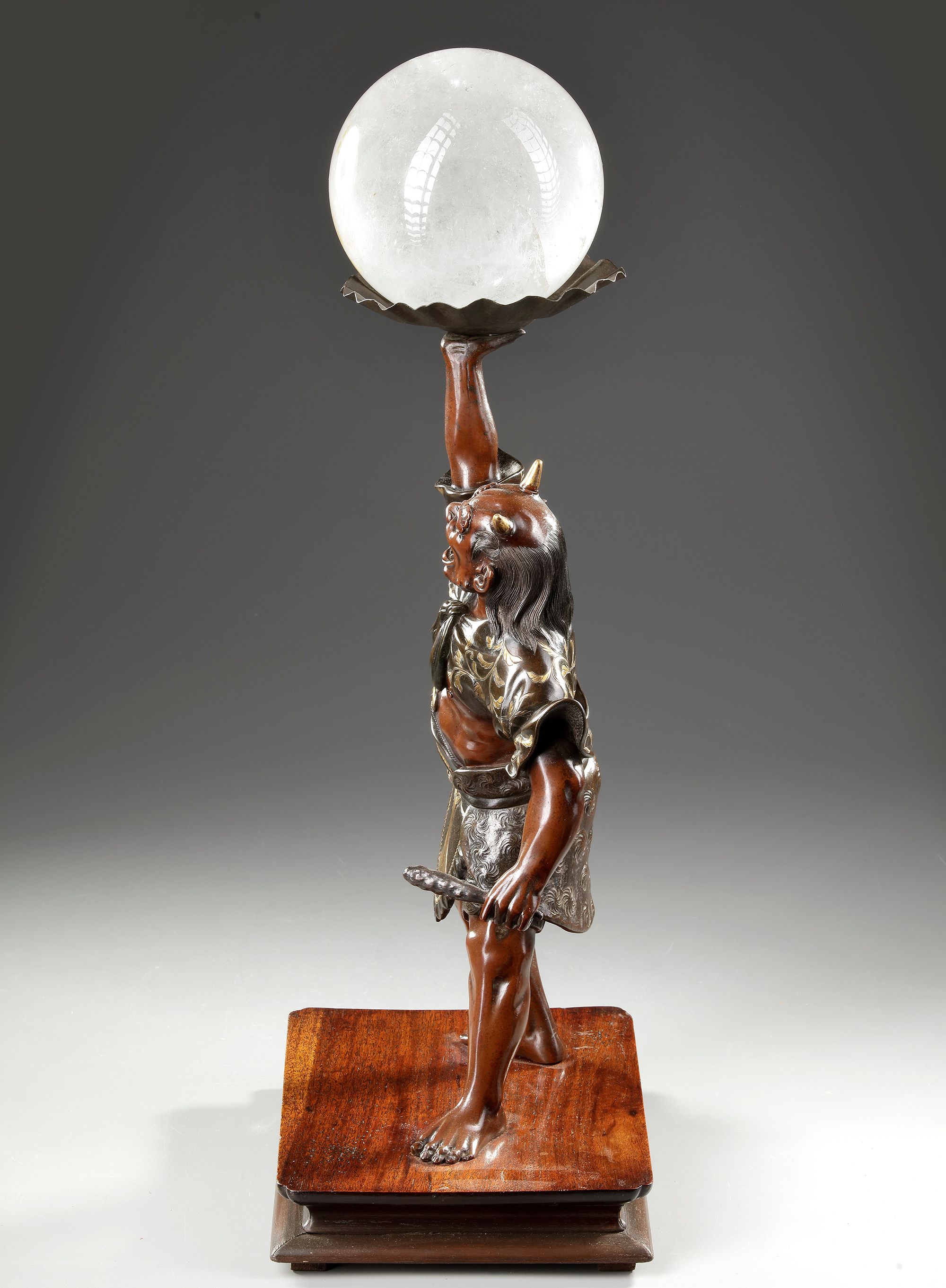 The Oni devil standing on a wood base, his right arm aloft carrying a ribbed bowl with a glass ball.
