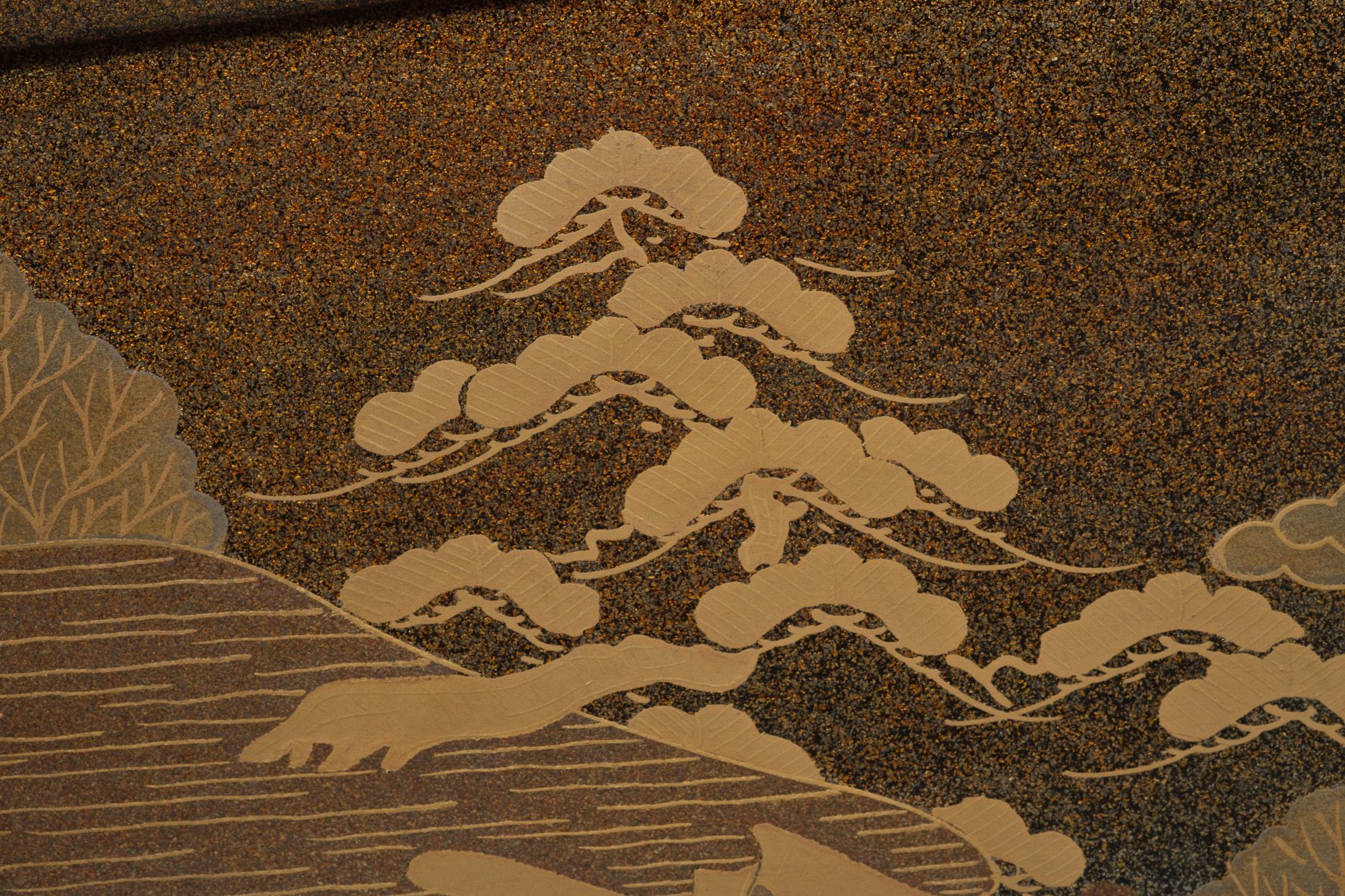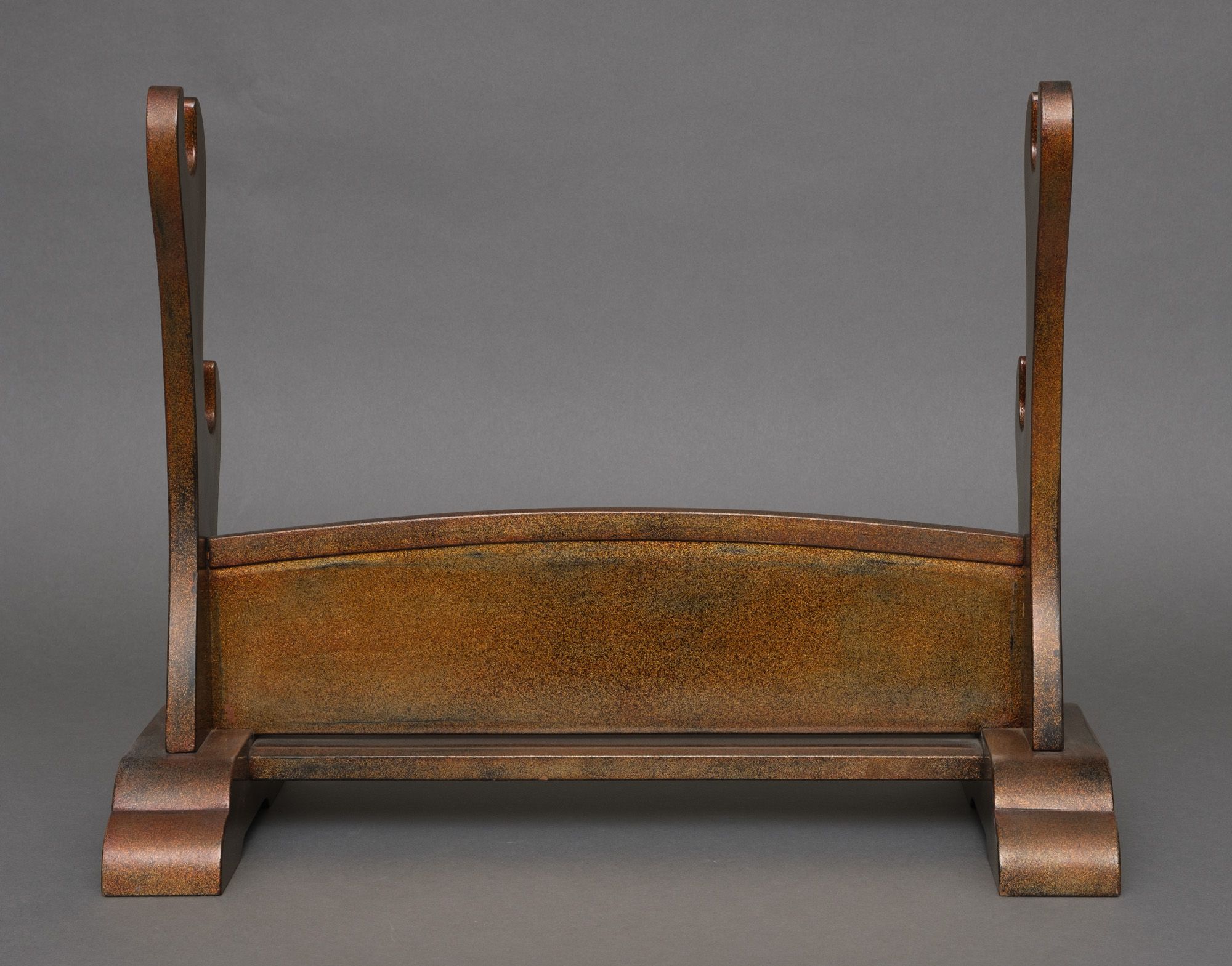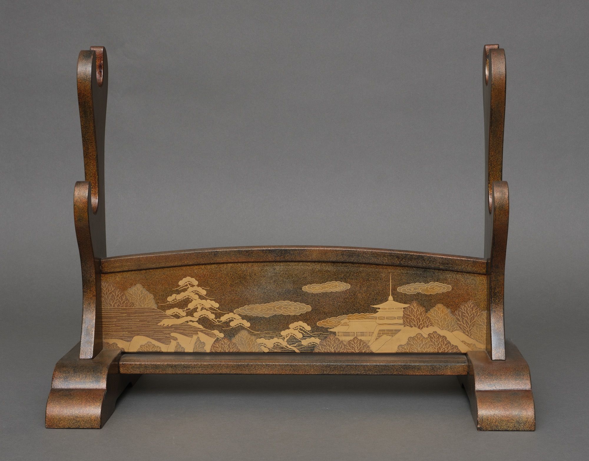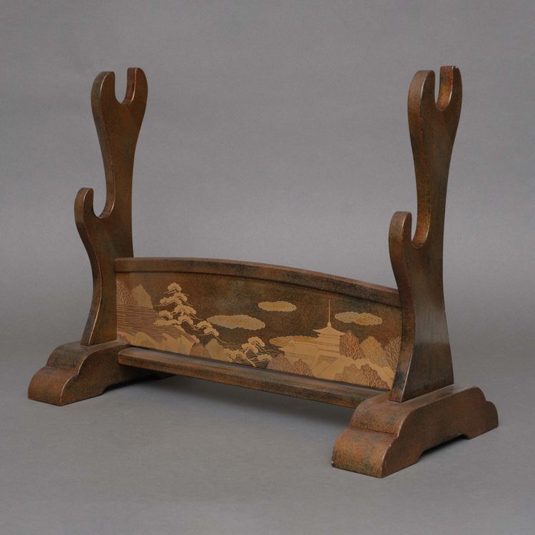 Nashiji lacquer 梨子地 wooden sword stand 刀掛け (katana’kake) for two swords, more specifically for a daishô 大小-set, decorated with golden hiramaki-e 平蒔絵 (low-relief design). The lovely maki-e on the front depicts a broad view of a mountain scape; traditional Japanese houses on the right next to a river, on the left some stylized pine trees on a hill.The design is executed in different hues of gold on a nashiji background. This colour combination gives the sword stand a calm and serene appearance. The katana’kake is in a very good condition with only some very minor traces of age and wear. Please look at the photos for a condition reference.