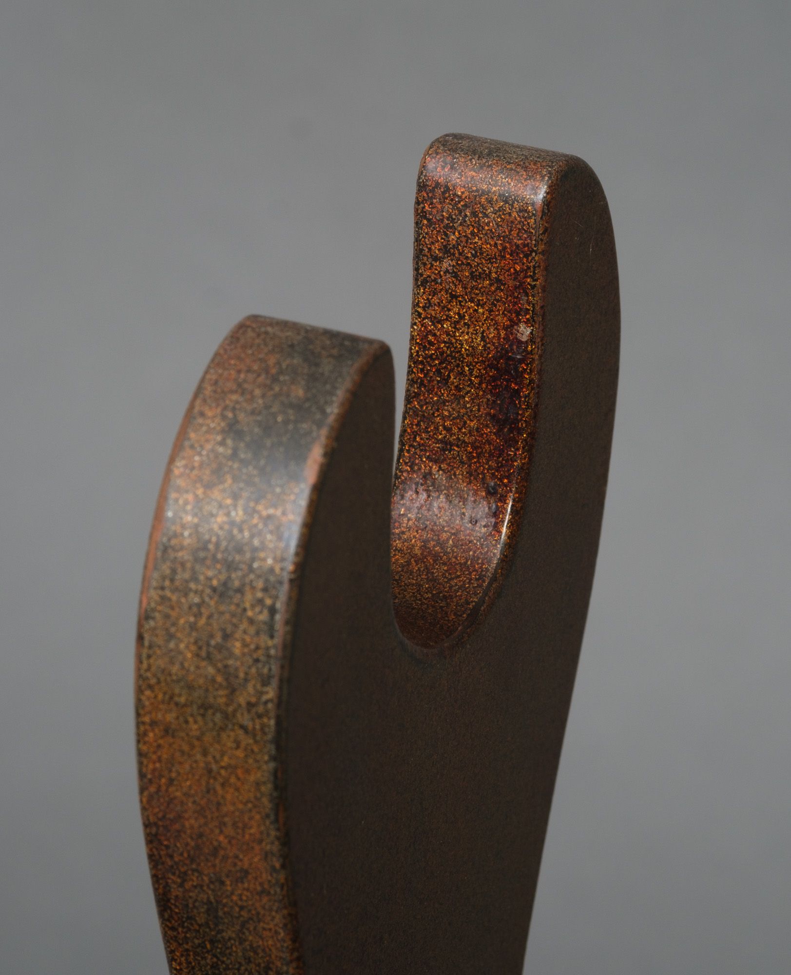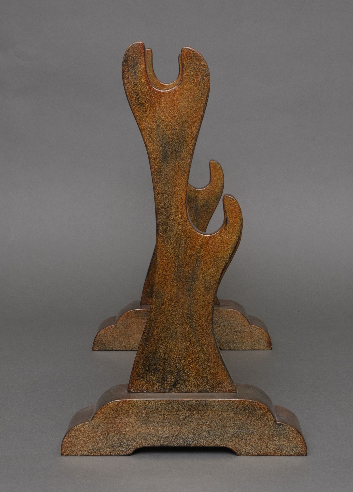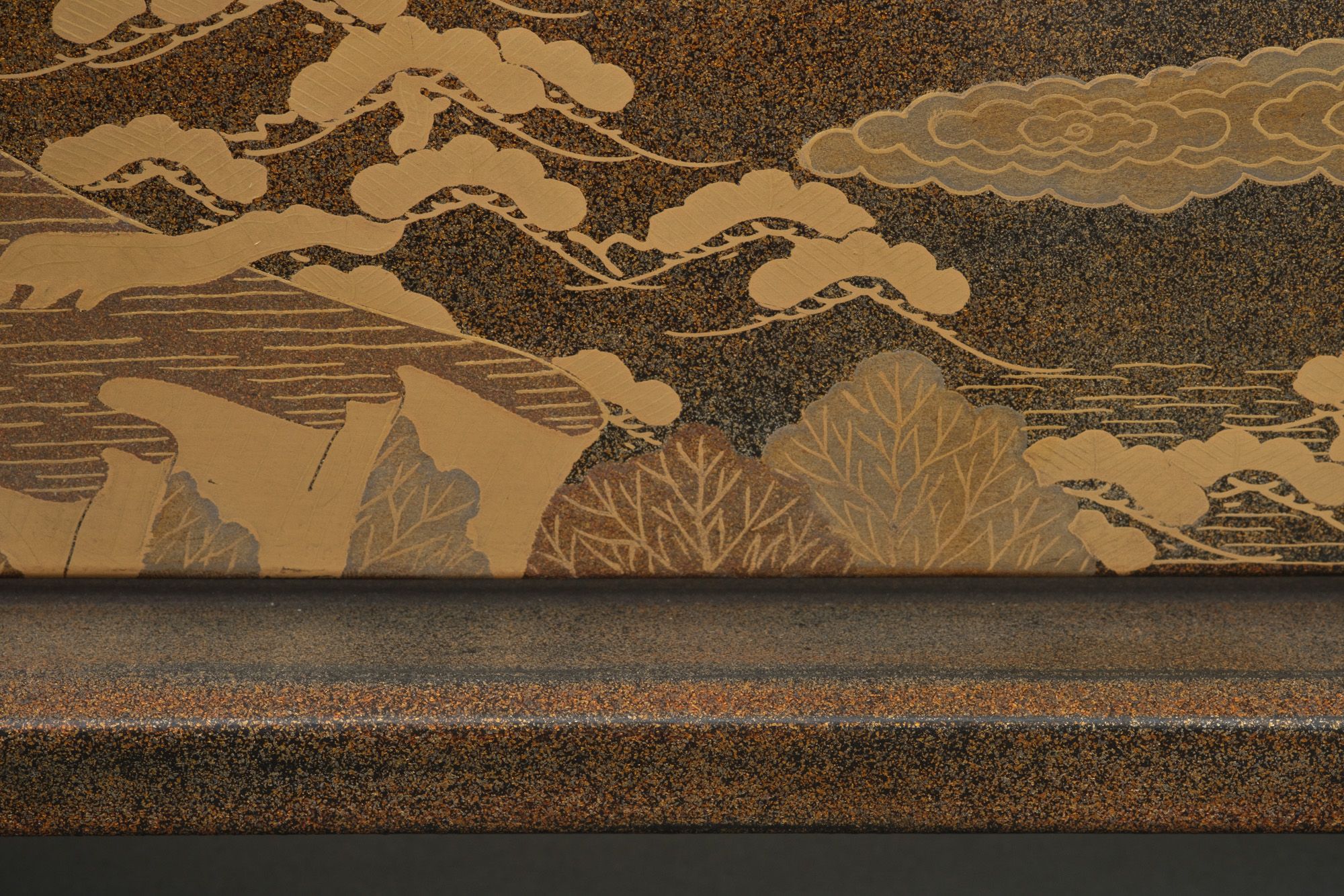 Nashiji lacquer 梨子地 wooden sword stand 刀掛け (katana’kake) for two swords, more specifically for a daishô 大小-set, decorated with golden hiramaki-e 平蒔絵 (low-relief design). The lovely maki-e on the front depicts a broad view of a mountain scape; traditional Japanese houses on the right next to a river, on the left some stylized pine trees on a hill.The design is executed in different hues of gold on a nashiji background. This colour combination gives the sword stand a calm and serene appearance. The katana’kake is in a very good condition with only some very minor traces of age and wear. Please look at the photos for a condition reference.