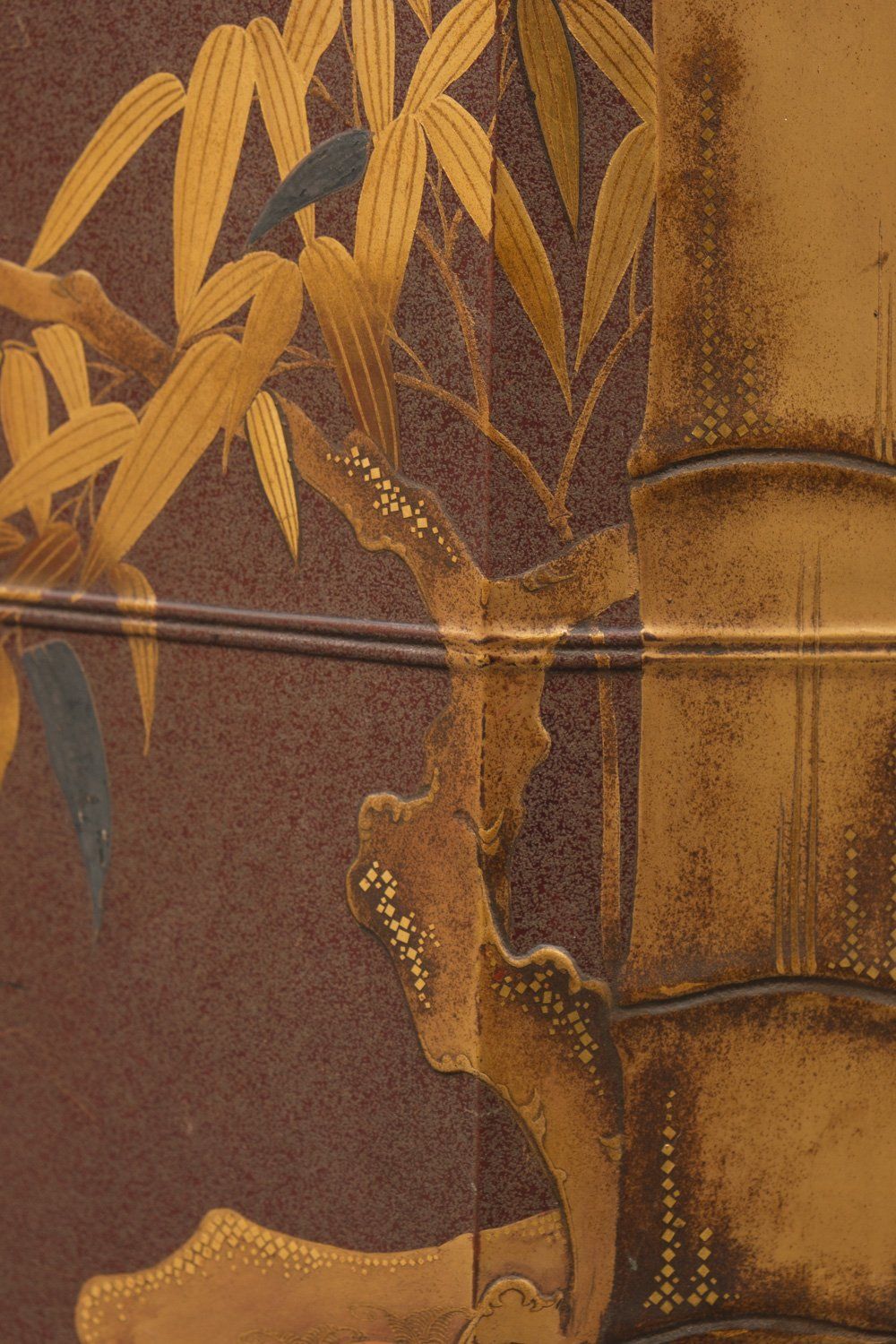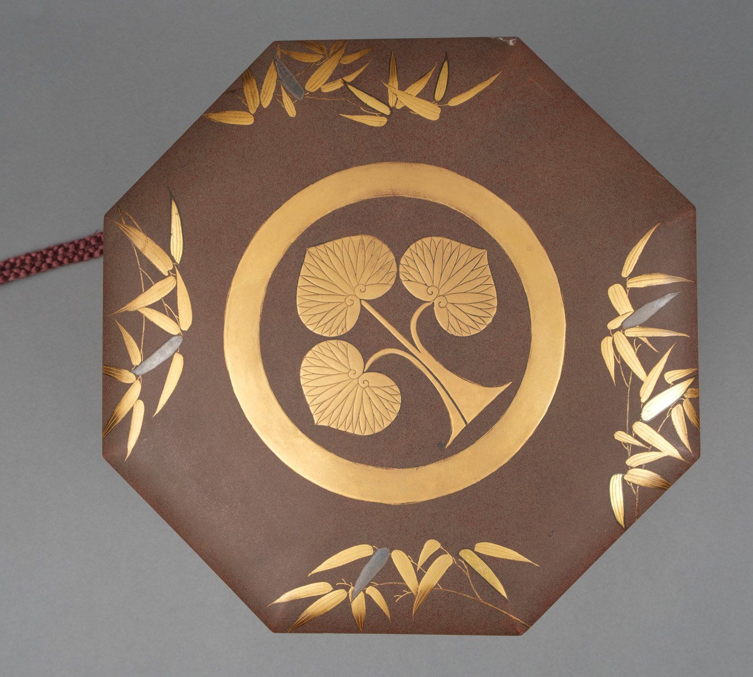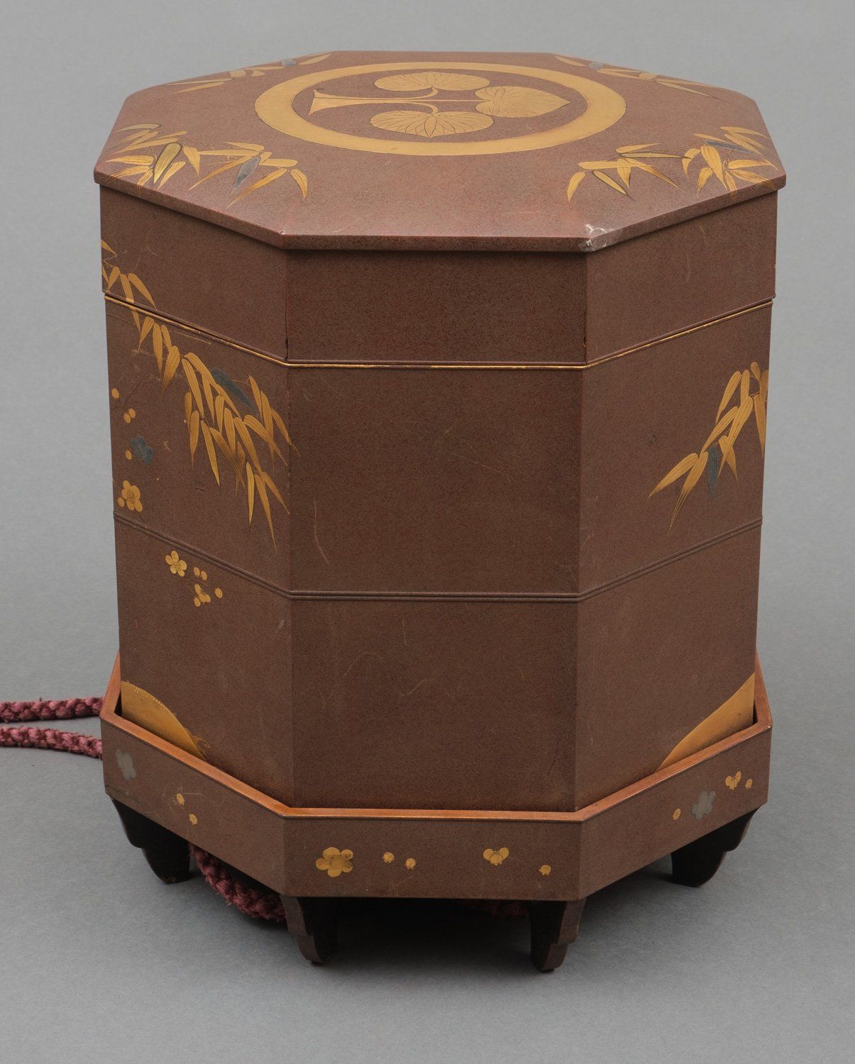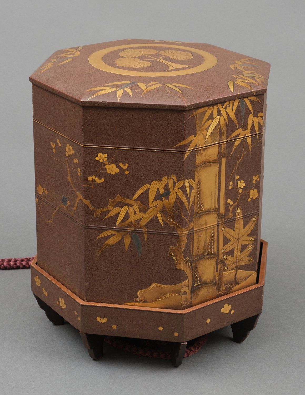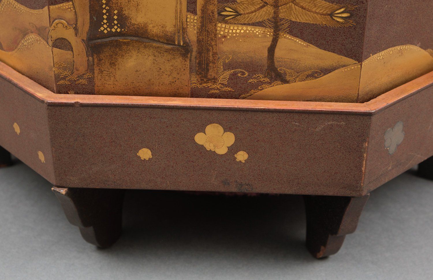 Rare octagonal Hokai box with removable lid on separate stand. Lacquered on the outside with a continuous decoration of a large bamboo stem flanked with cherry blossom flowers and a pine tree on a hill. With gold leaf lacquered decorations on a golden brown rough surface ground. The top of the lid centered with a family crest of a Hollyhock in a circle (maru ni migihanaretachi aoi mon), symbolizing loyalty.