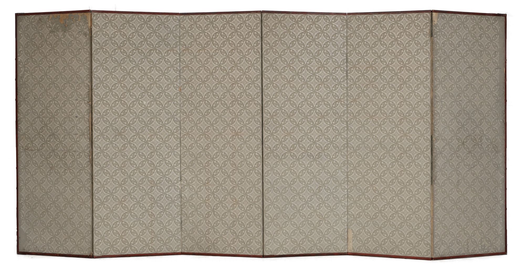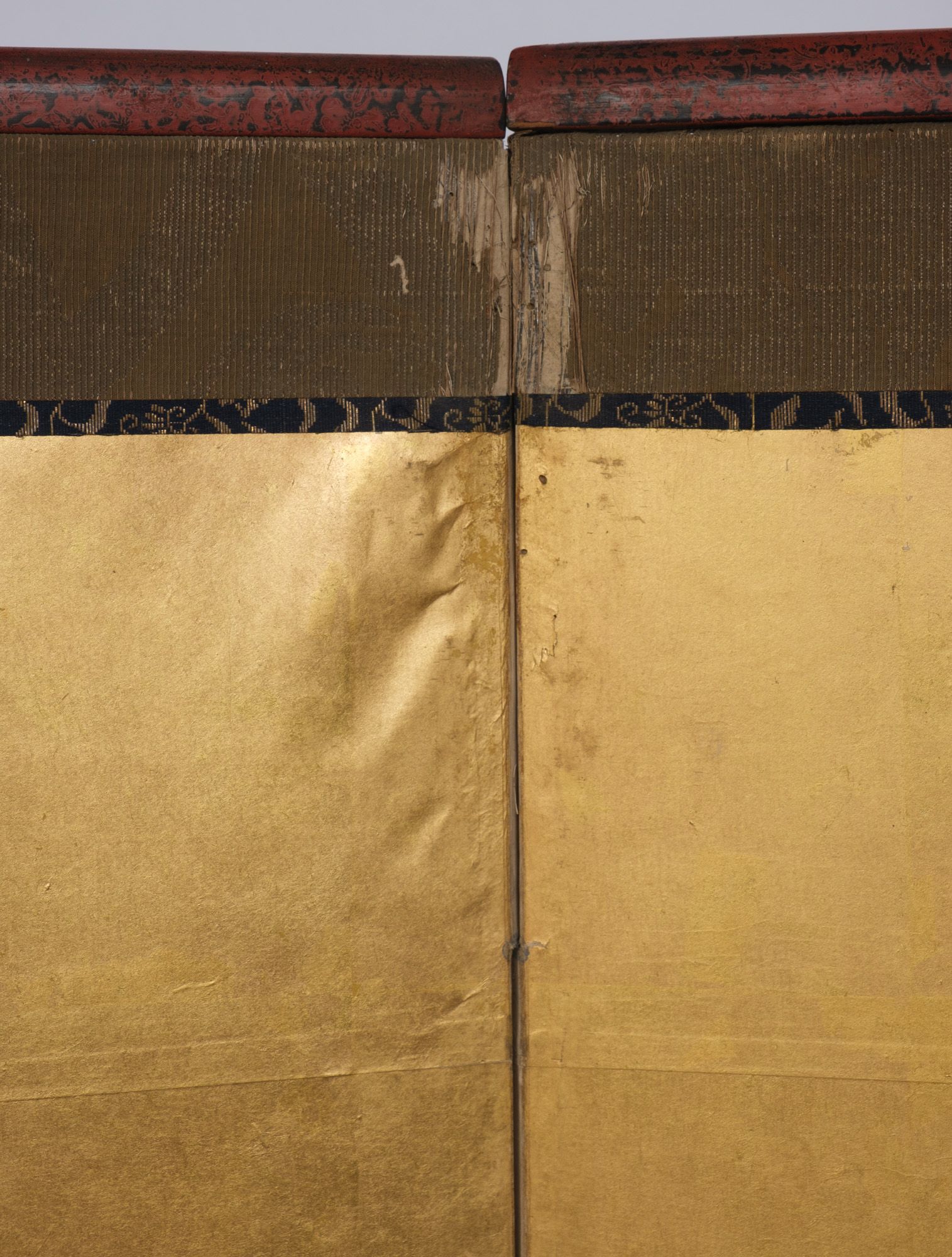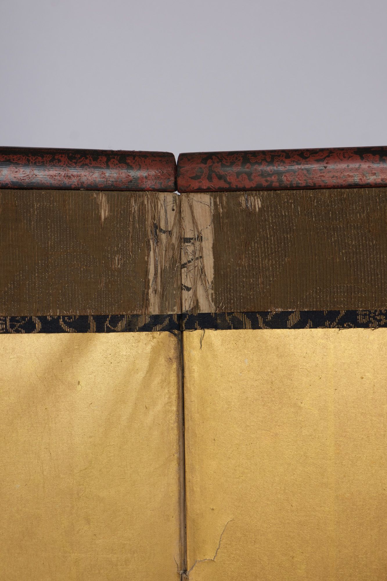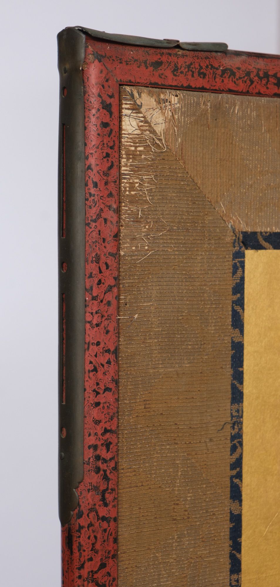 The panels are surrounded by two silk borders, a thin black one, and a wide brown one. The screen is protected by a black and red negoro’nuri-style 根来塗り lacquer wooden frame. The back of the room divider is covered with beautiful silver paper with a flower and bird pattern in relief.