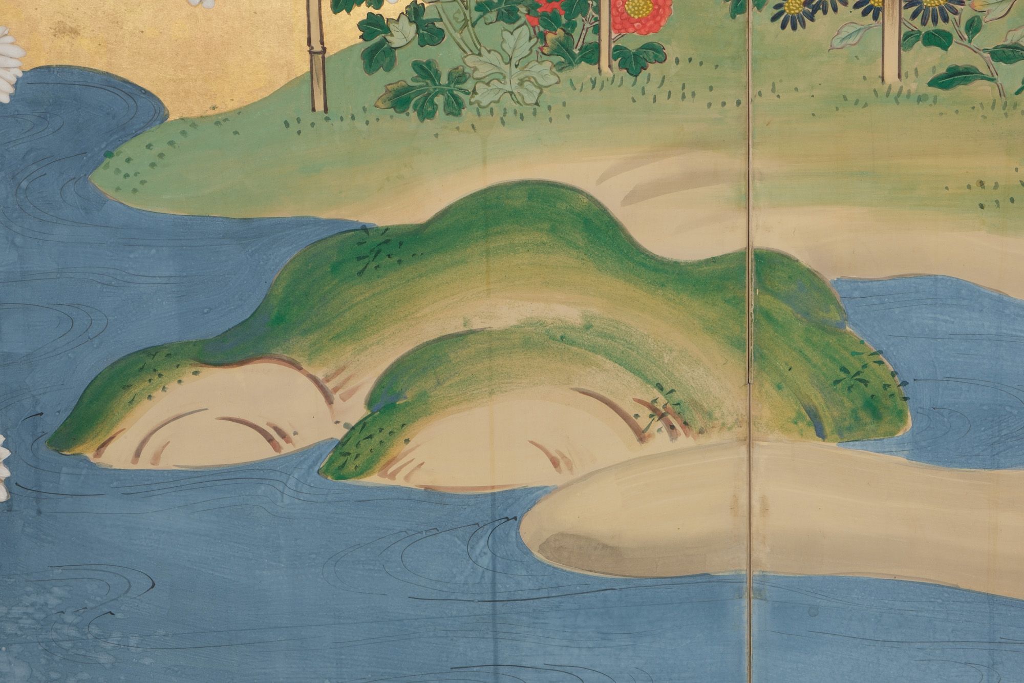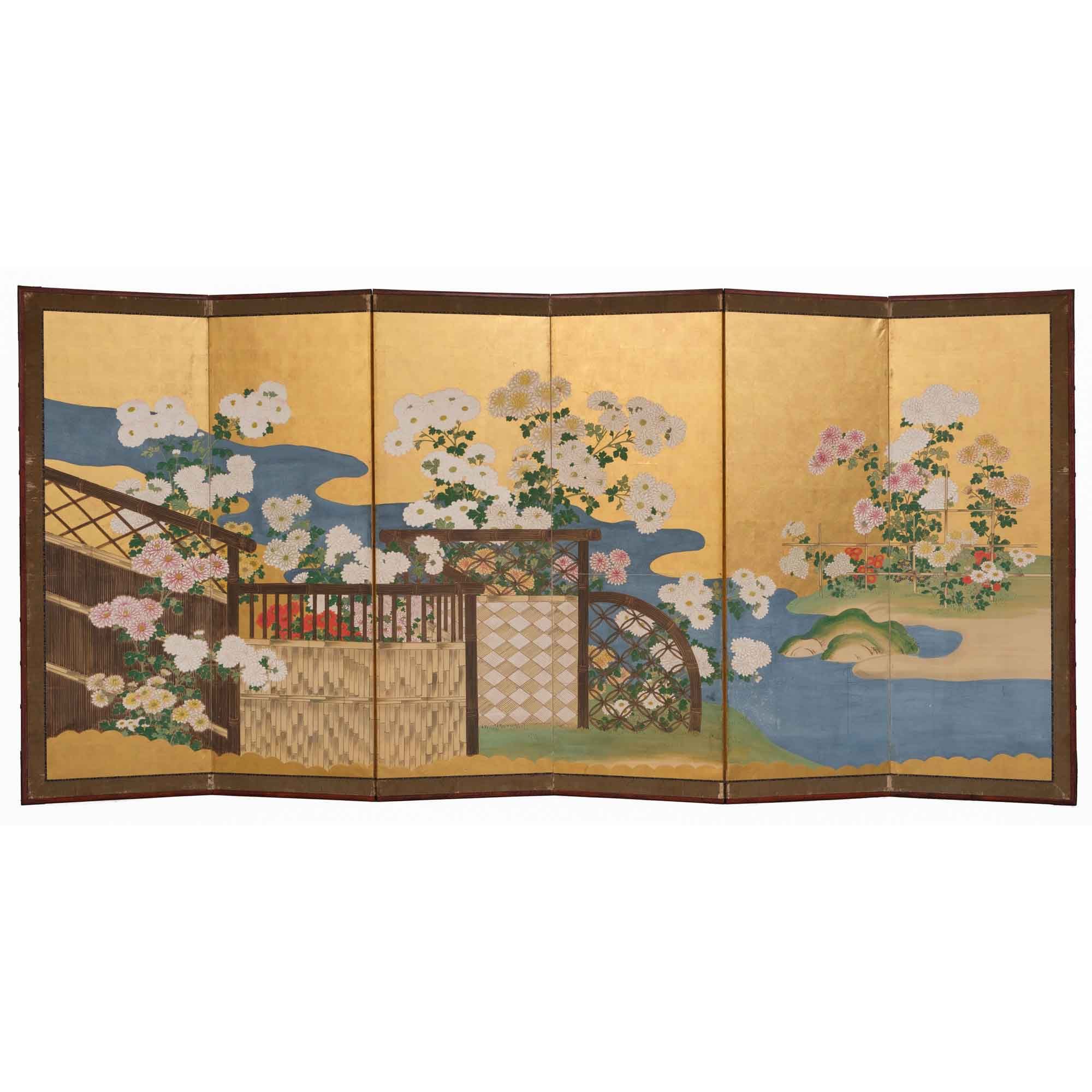 A very vibrant and captivating large six-panel byôbu 屏風 (room divider) with a refined continuous painting of a flower garden filled with many different types of chrysanthemums 菊 (kiku), next to a winding river.